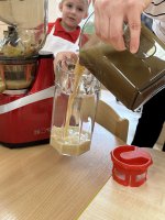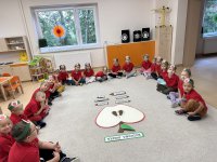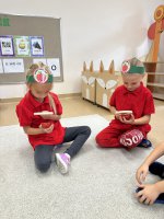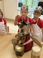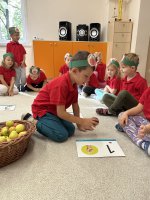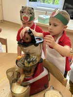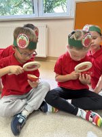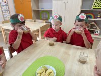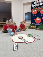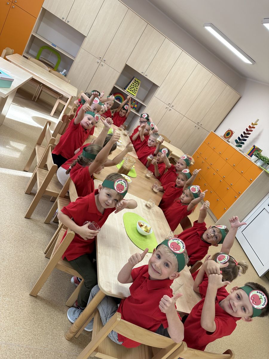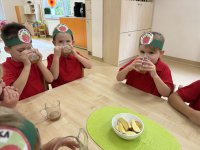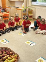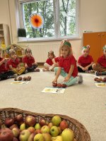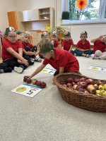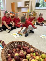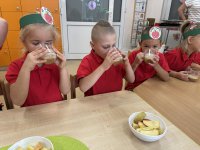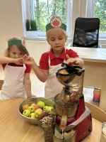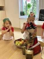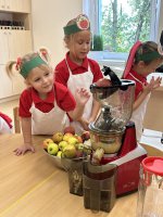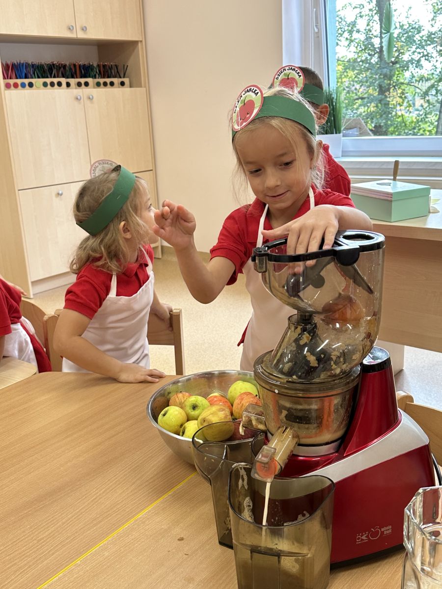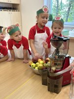 Motylki poznały nie tylko budowę jabłka, ale również rozwijały umiejętności matematyczne poprzez przelicznie, ważenie, określanie wielkości itp. Na koniec dzieci pod okiem Pań przygotowały pyszny, naturalny sok jabłkowy, który zniknął w mgnieniu oka podczas drugiego śniadania.