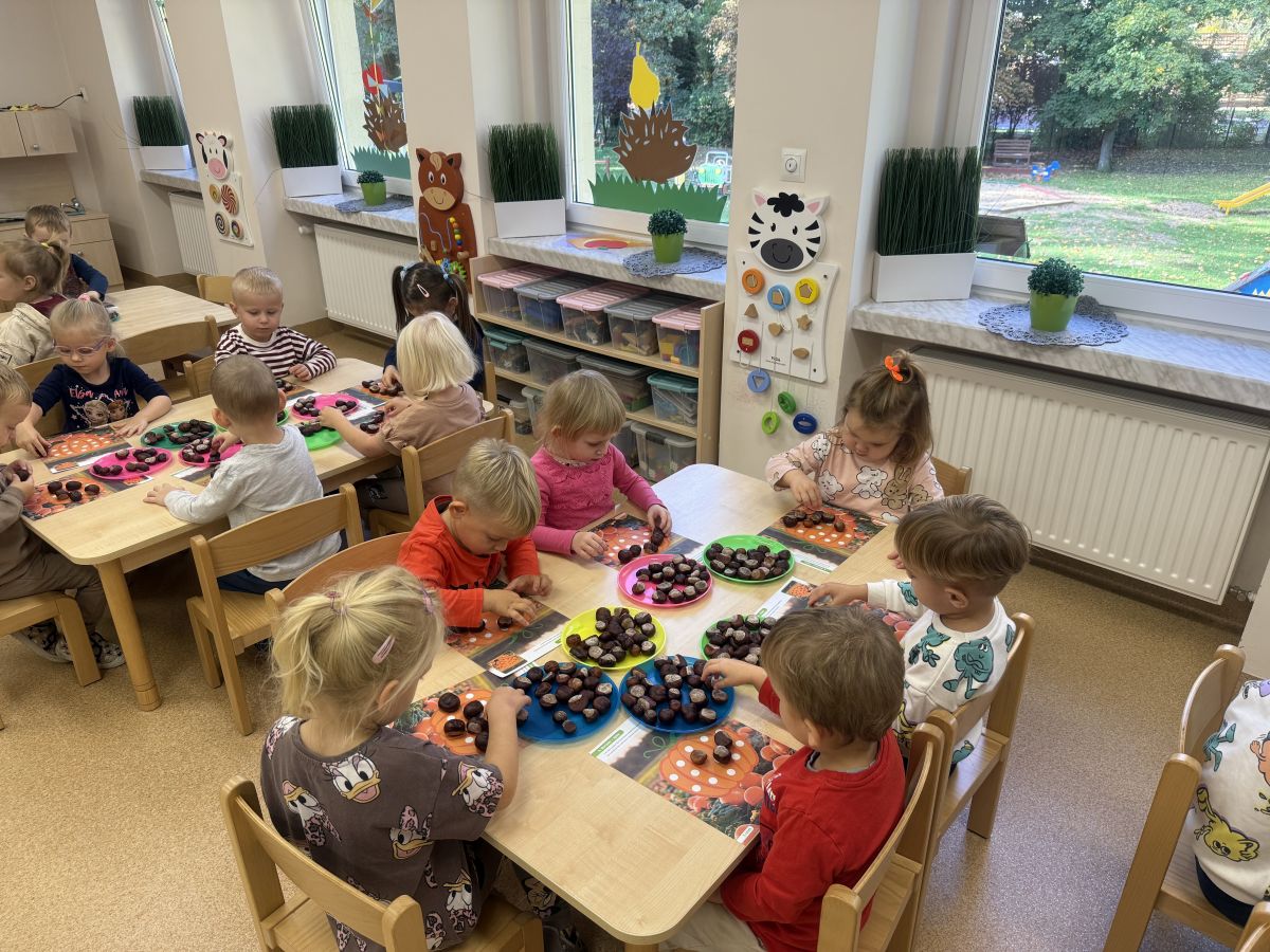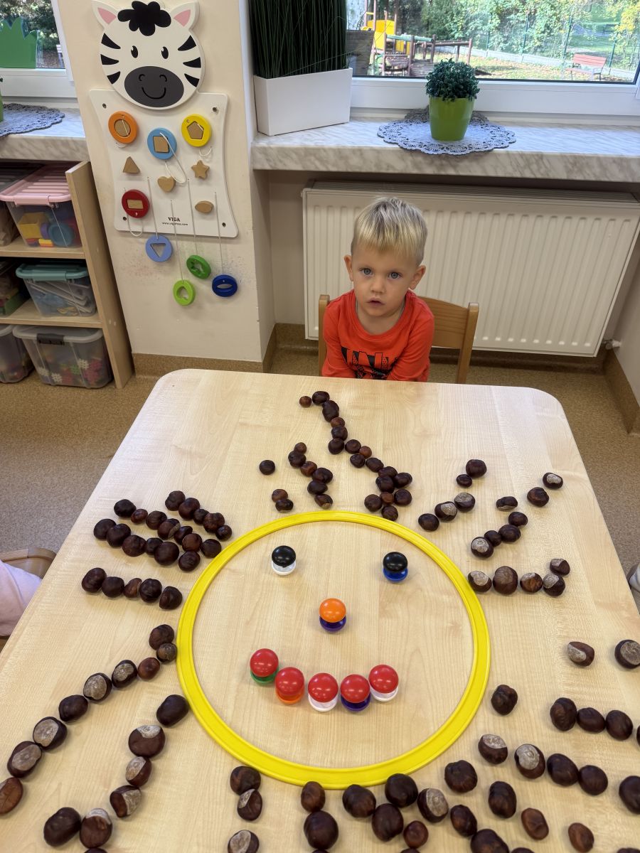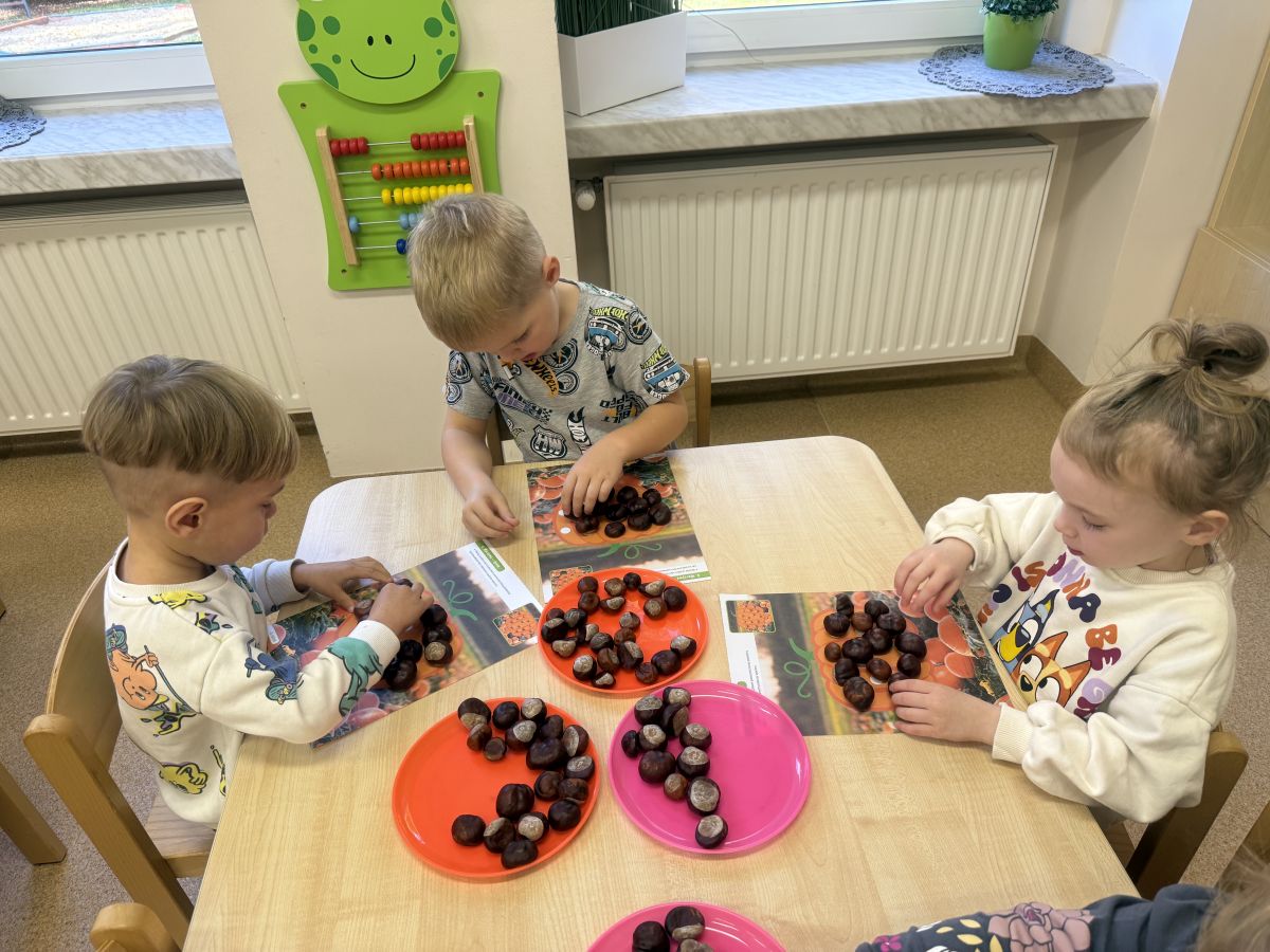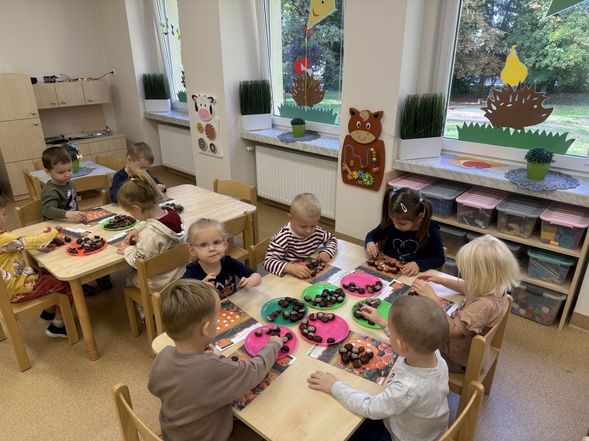 Jesień to pora roku podczas której można na wiele sposobów bawić się darami przyrody, zwłaszcza kasztanami. Krasnale w swojej grupie wykorzystały kasztany do zabaw matematycznych, doskonalimy wtedy umiejętność przeliczania na konkretach, układaliśmy z kasztanów słoneczka oraz tworzyliśmy prace plastyczne .Po zajęciach wybraliśmy się na jesienny spacer aby podziwiać jesienną aurę. Zabawy kasztanami oraz spacer dostarczył przedszkolakom wiele wrażeń i radości.