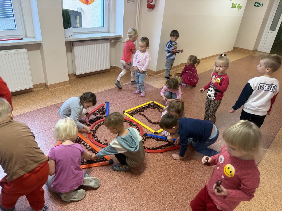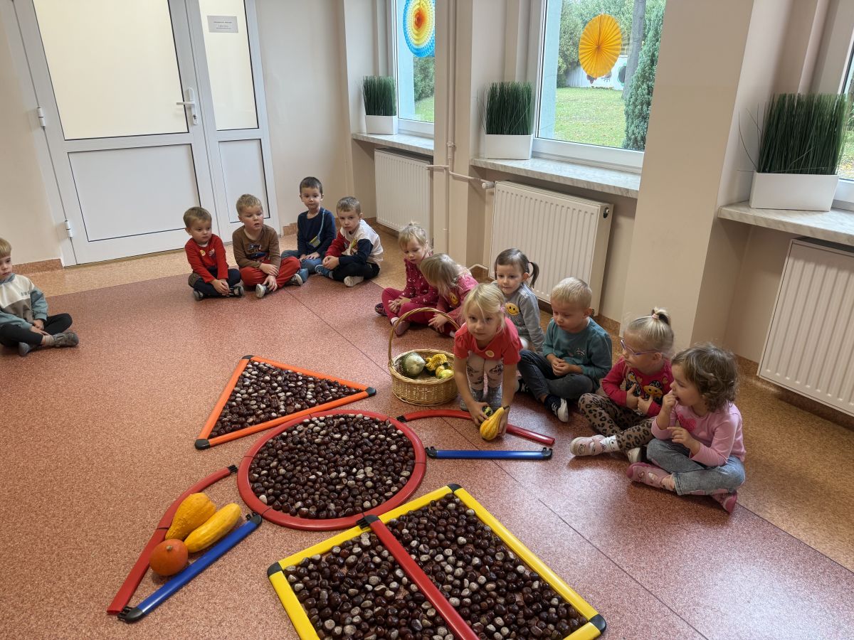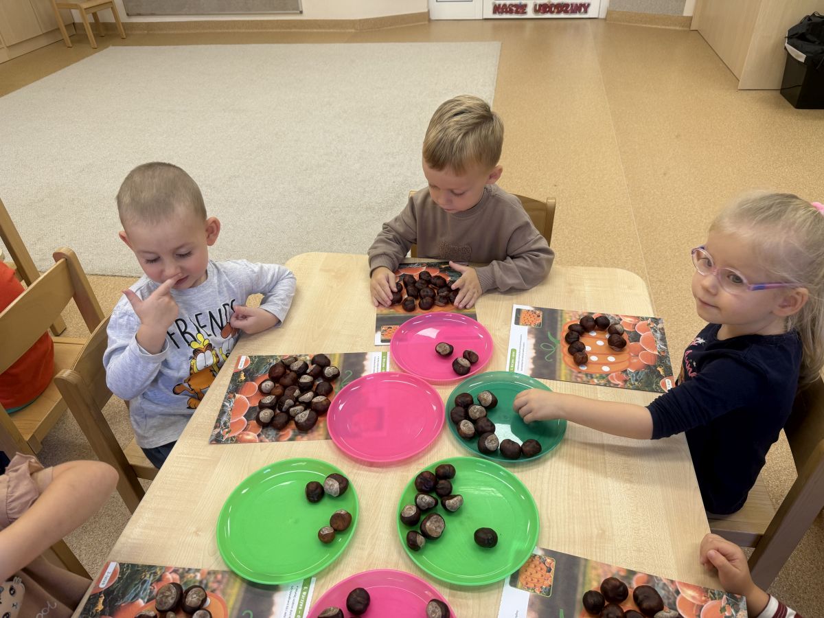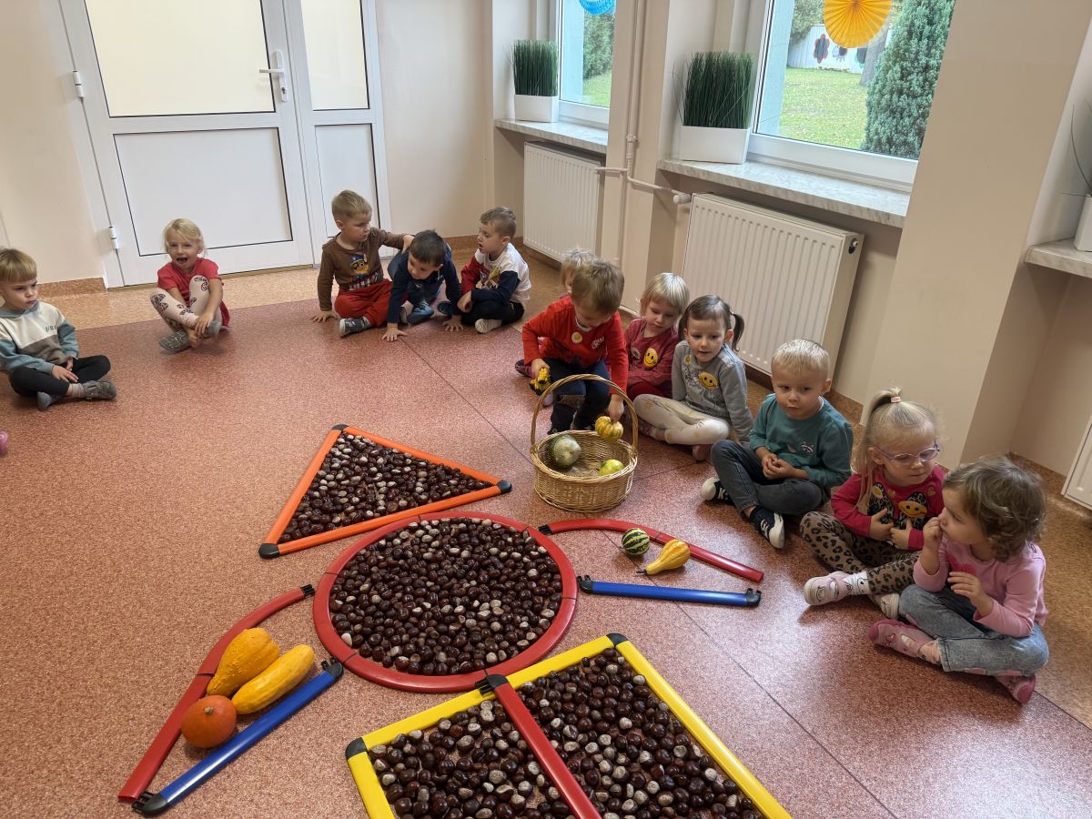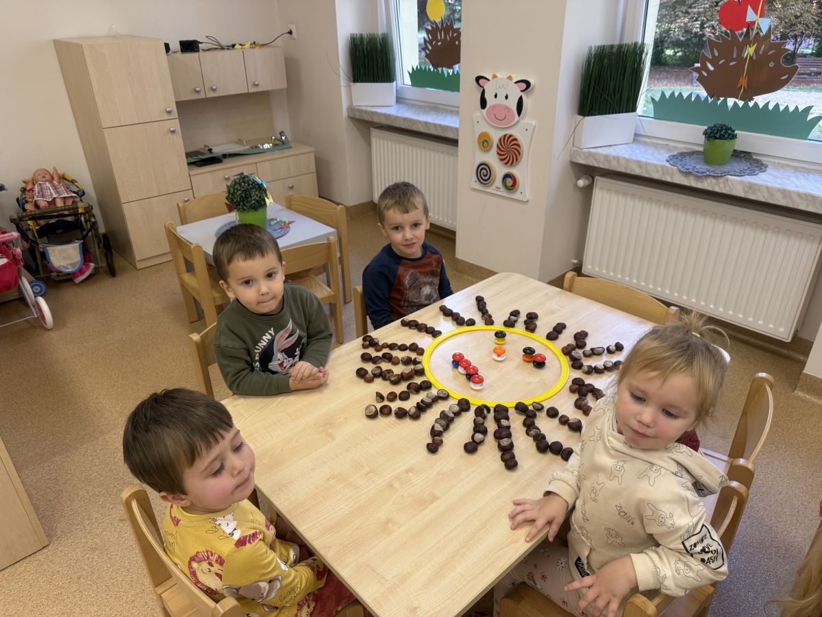 Jesień to pora roku podczas której można na wiele sposobów bawić się darami przyrody, zwłaszcza kasztanami. Krasnale w swojej grupie wykorzystały kasztany do zabaw matematycznych, doskonalimy wtedy umiejętność przeliczania na konkretach, układaliśmy z kasztanów słoneczka oraz tworzyliśmy prace plastyczne .Po zajęciach wybraliśmy się na jesienny spacer aby podziwiać jesienną aurę. Zabawy kasztanami oraz spacer dostarczył przedszkolakom wiele wrażeń i radości.