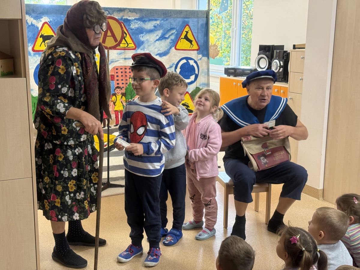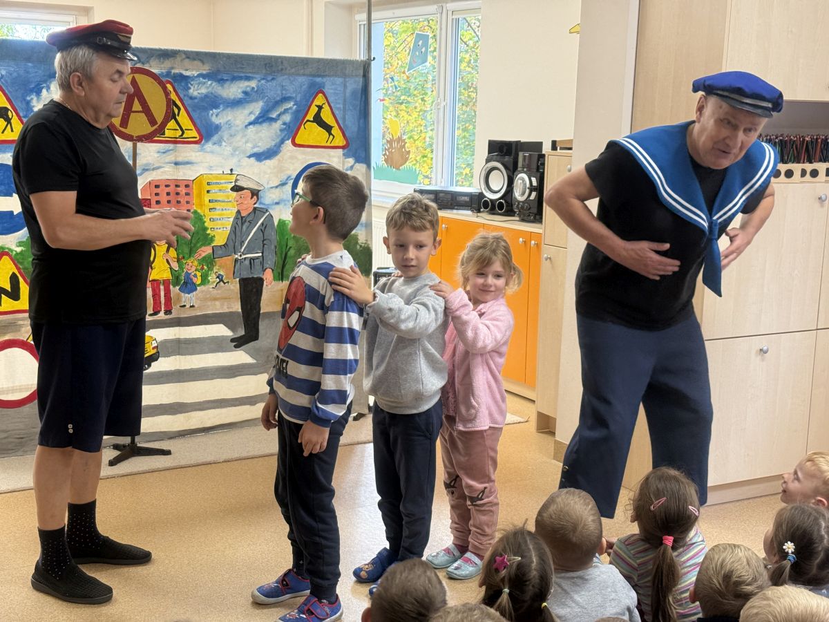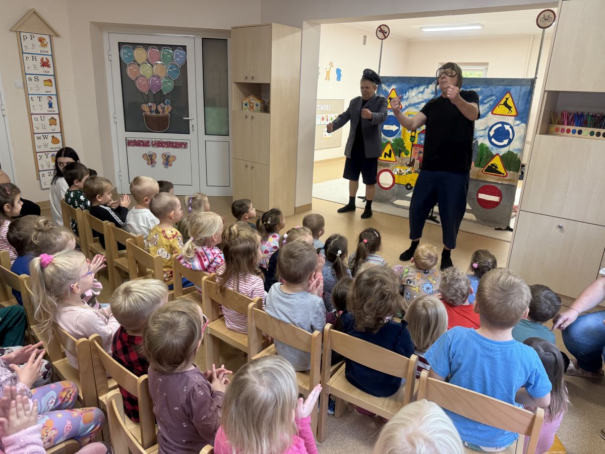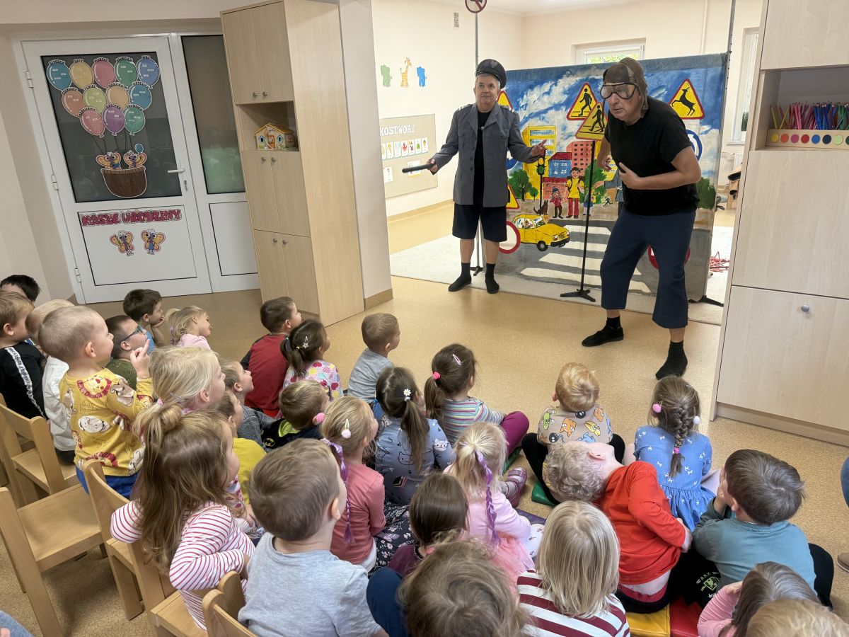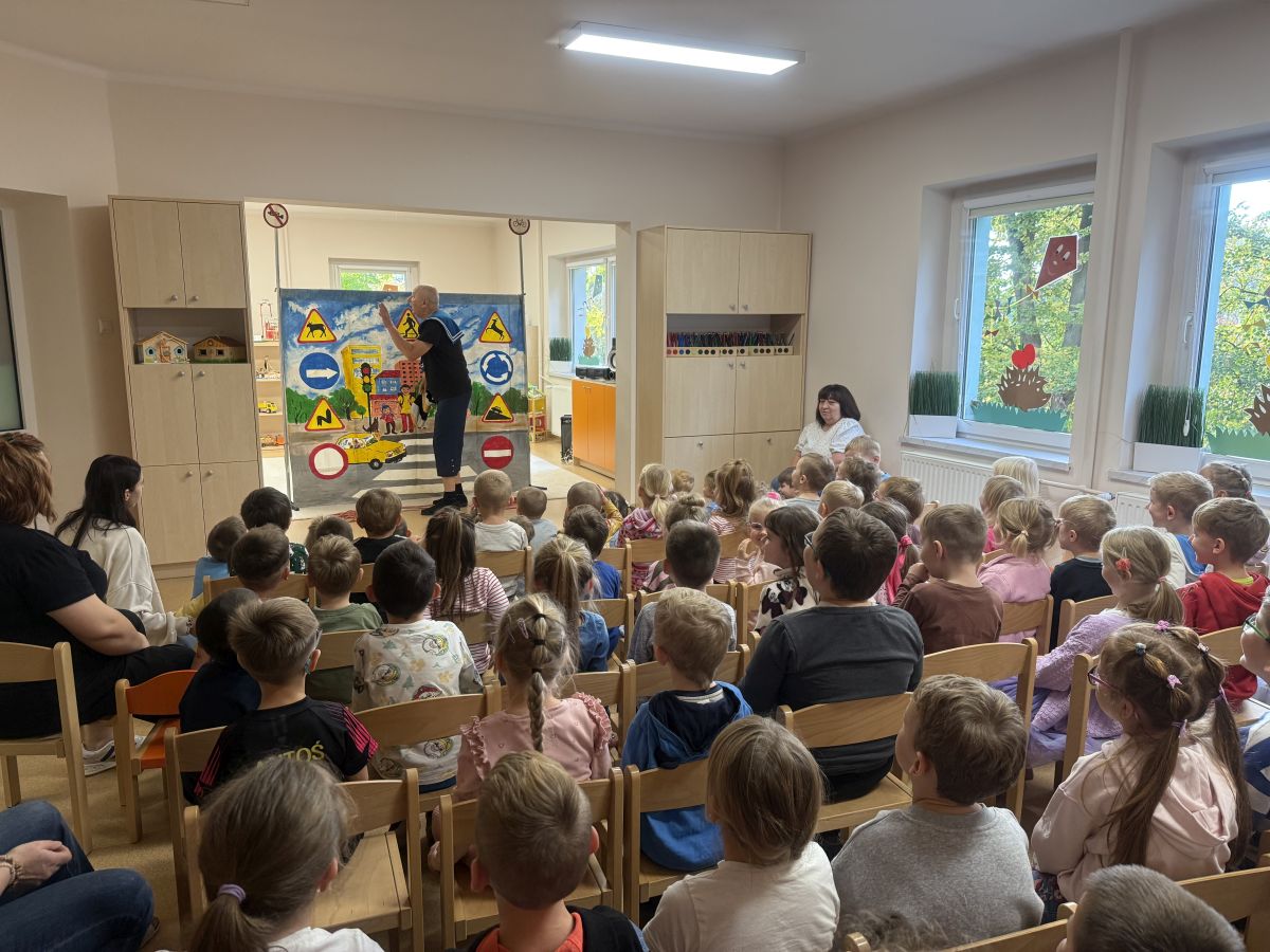 W naszym przedszkolu 16.10.25 odbyło się wyjątkowe przedstawienie teatralne poświęcone tematyce bezpieczeństwa. Dzieci z ogromnym zainteresowaniem oglądały występ aktorów, którzy w ciekawy i zabawny sposób przypomnieli im, jak ważne jest przestrzeganie zasad bezpiecznego poruszania się po drodze. Przedstawienie pełne było humoru, muzyki i wspólnej zabawy, dzięki czemu dzieci z łatwością zapamiętały najważniejsze zasady.