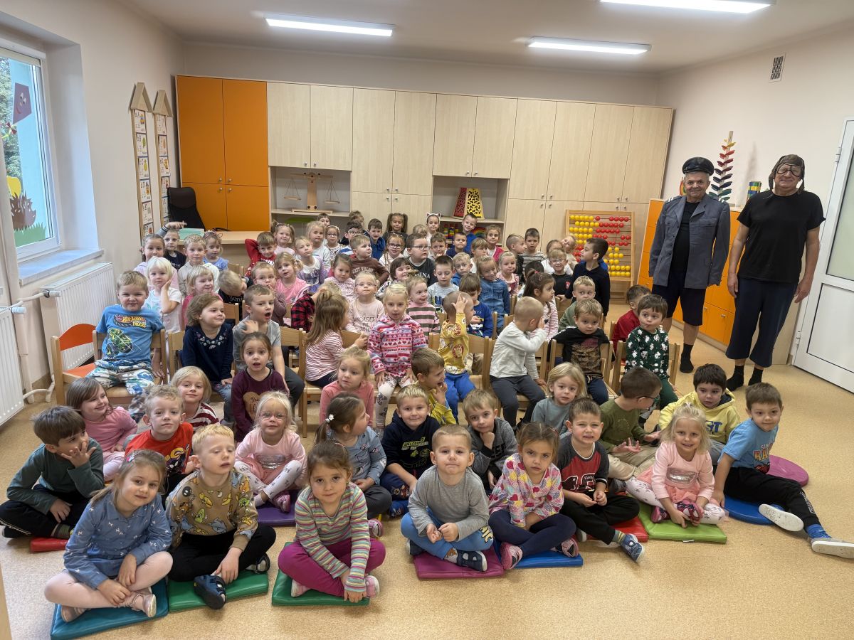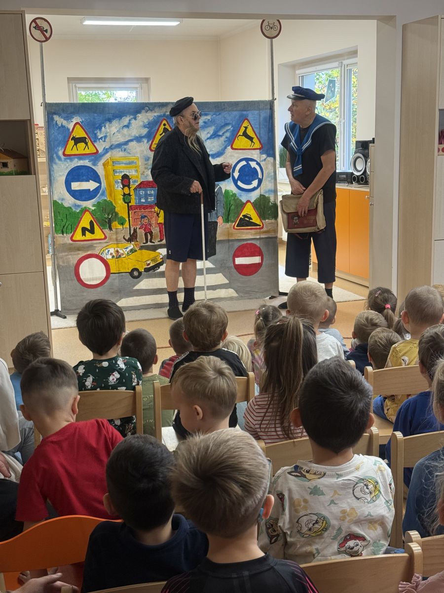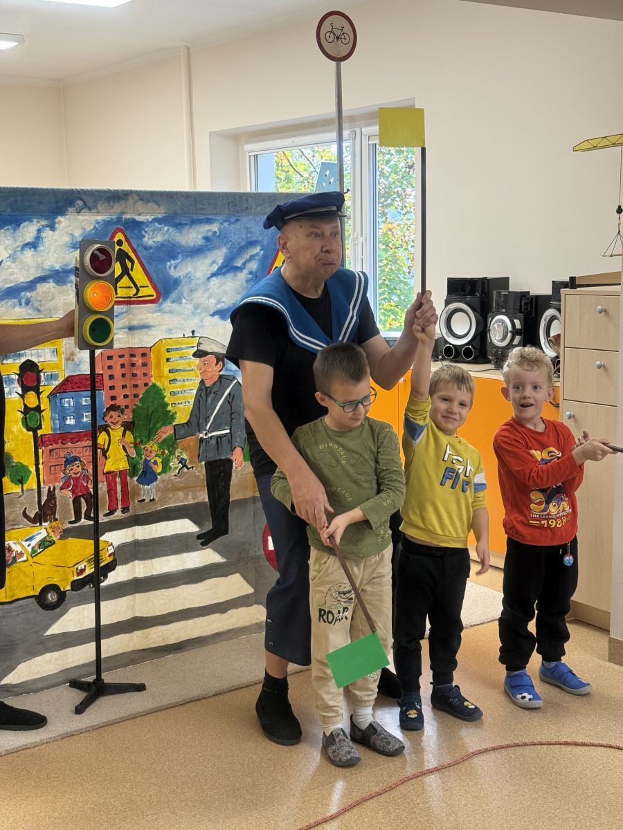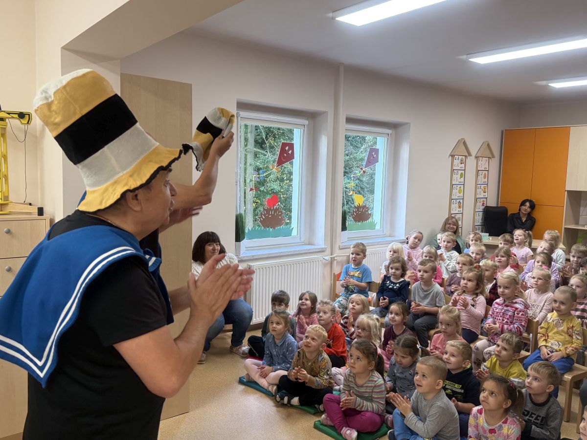 W naszym przedszkolu 16.10.25 odbyło się wyjątkowe przedstawienie teatralne poświęcone tematyce bezpieczeństwa. Dzieci z ogromnym zainteresowaniem oglądały występ aktorów, którzy w ciekawy i zabawny sposób przypomnieli im, jak ważne jest przestrzeganie zasad bezpiecznego poruszania się po drodze. Przedstawienie pełne było humoru, muzyki i wspólnej zabawy, dzięki czemu dzieci z łatwością zapamiętały najważniejsze zasady.