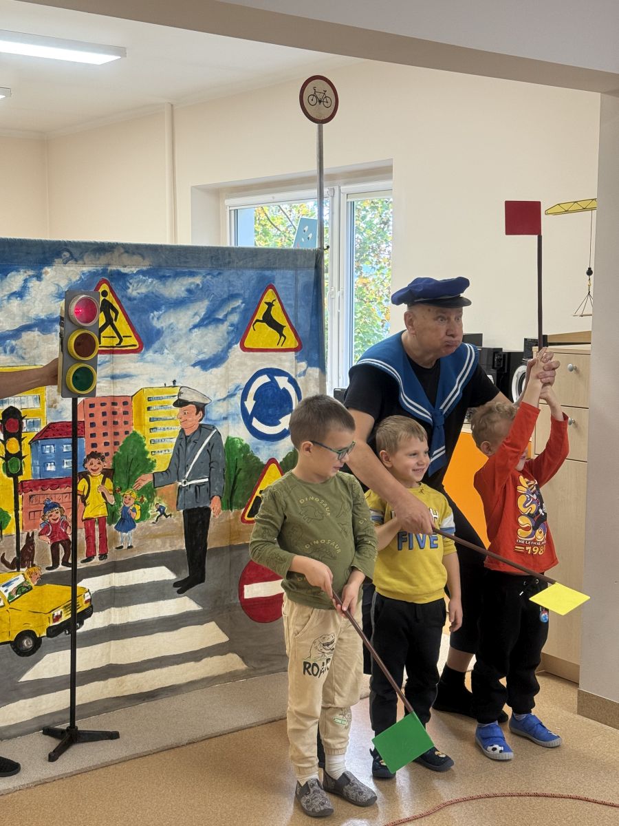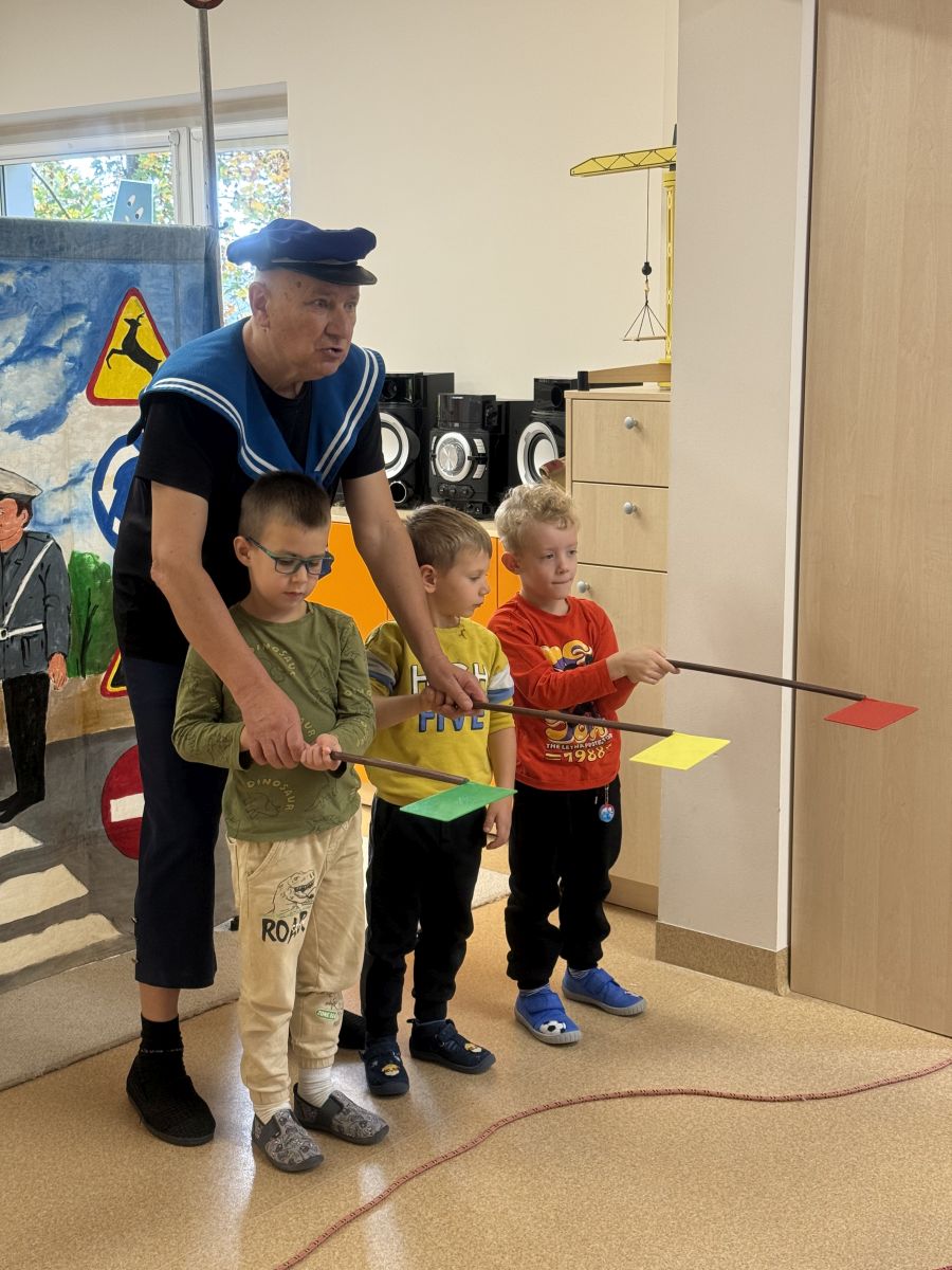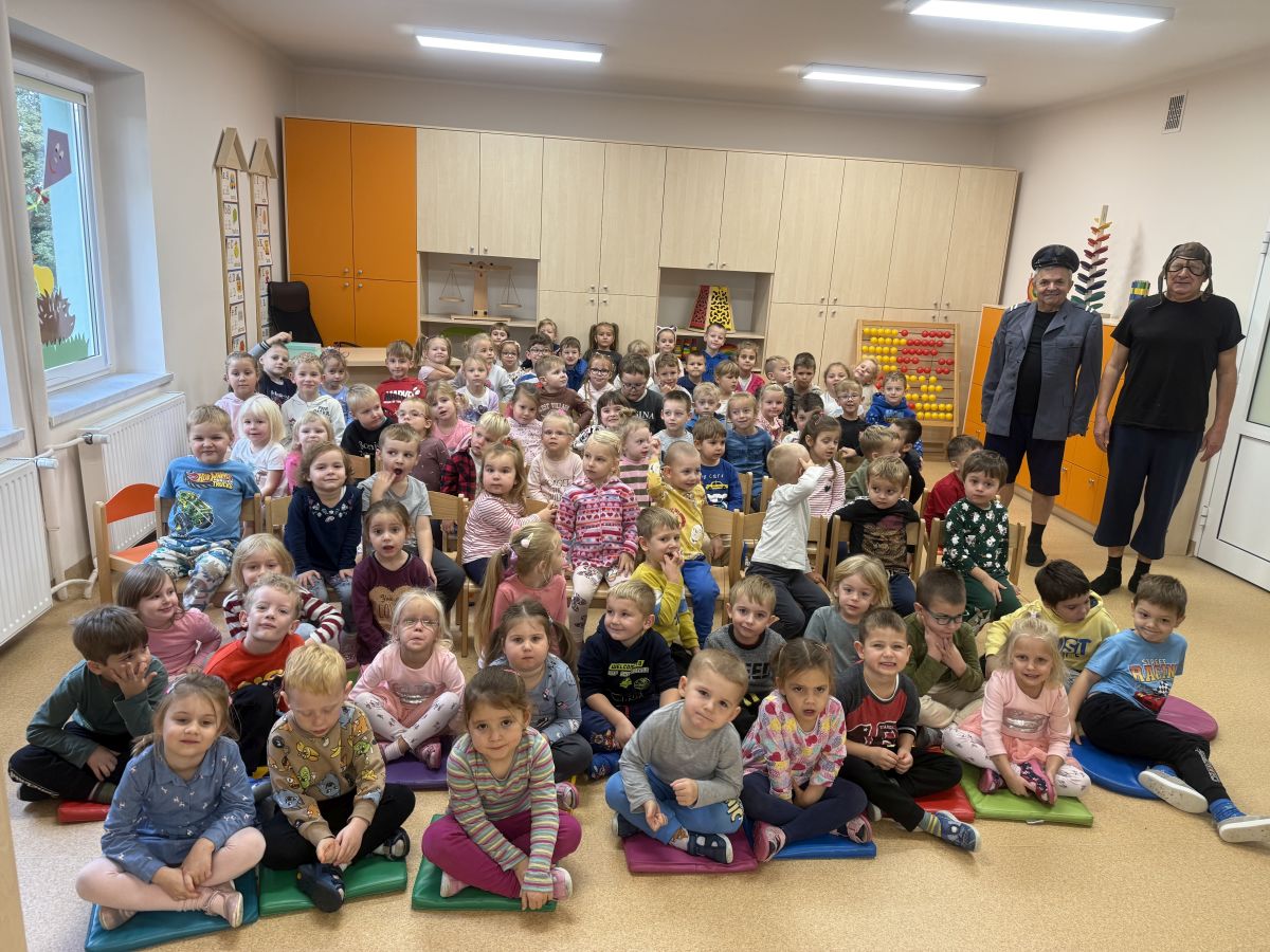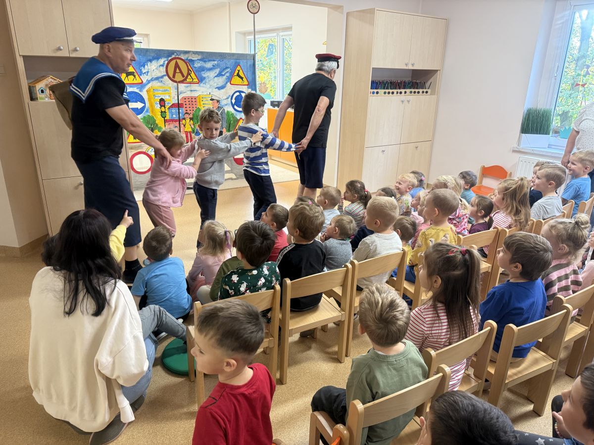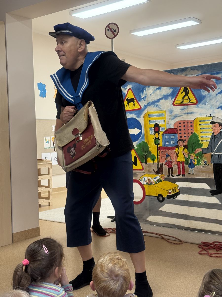 W naszym przedszkolu 16.10.25 odbyło się wyjątkowe przedstawienie teatralne poświęcone tematyce bezpieczeństwa. Dzieci z ogromnym zainteresowaniem oglądały występ aktorów, którzy w ciekawy i zabawny sposób przypomnieli im, jak ważne jest przestrzeganie zasad bezpiecznego poruszania się po drodze. Przedstawienie pełne było humoru, muzyki i wspólnej zabawy, dzięki czemu dzieci z łatwością zapamiętały najważniejsze zasady.