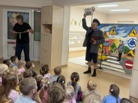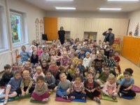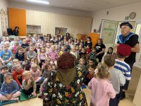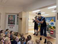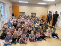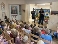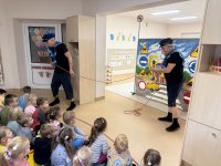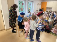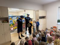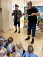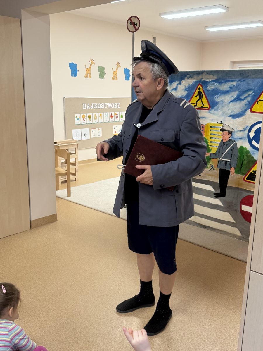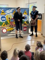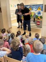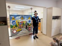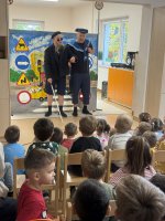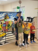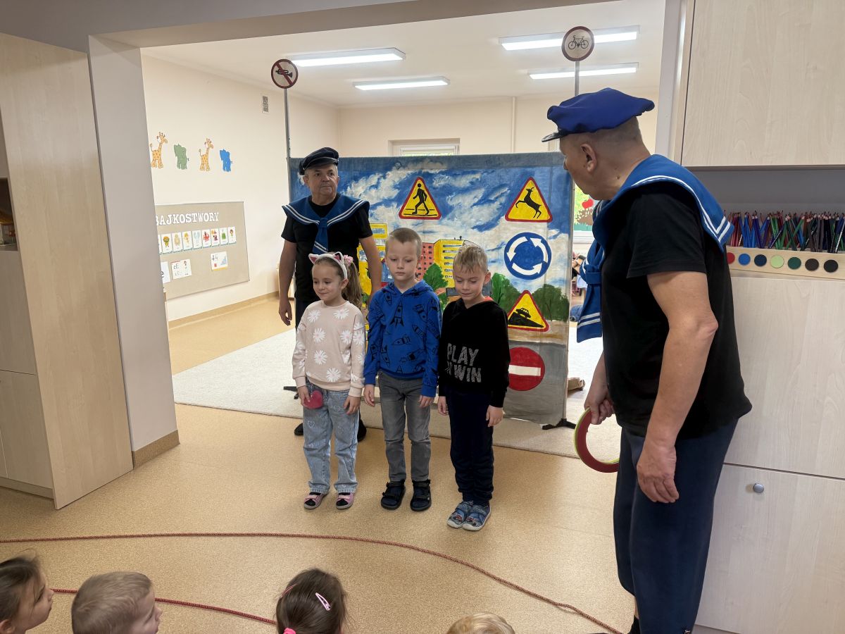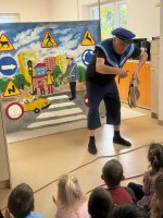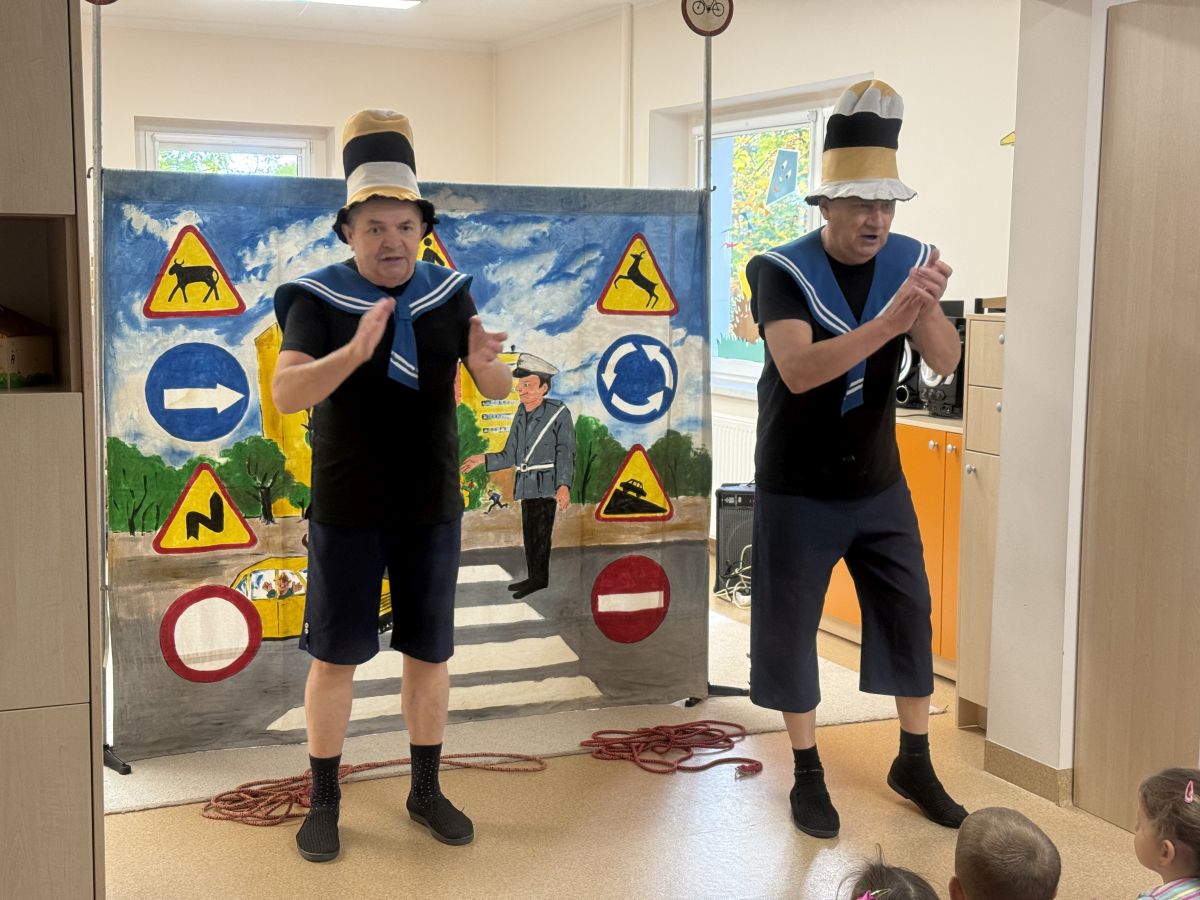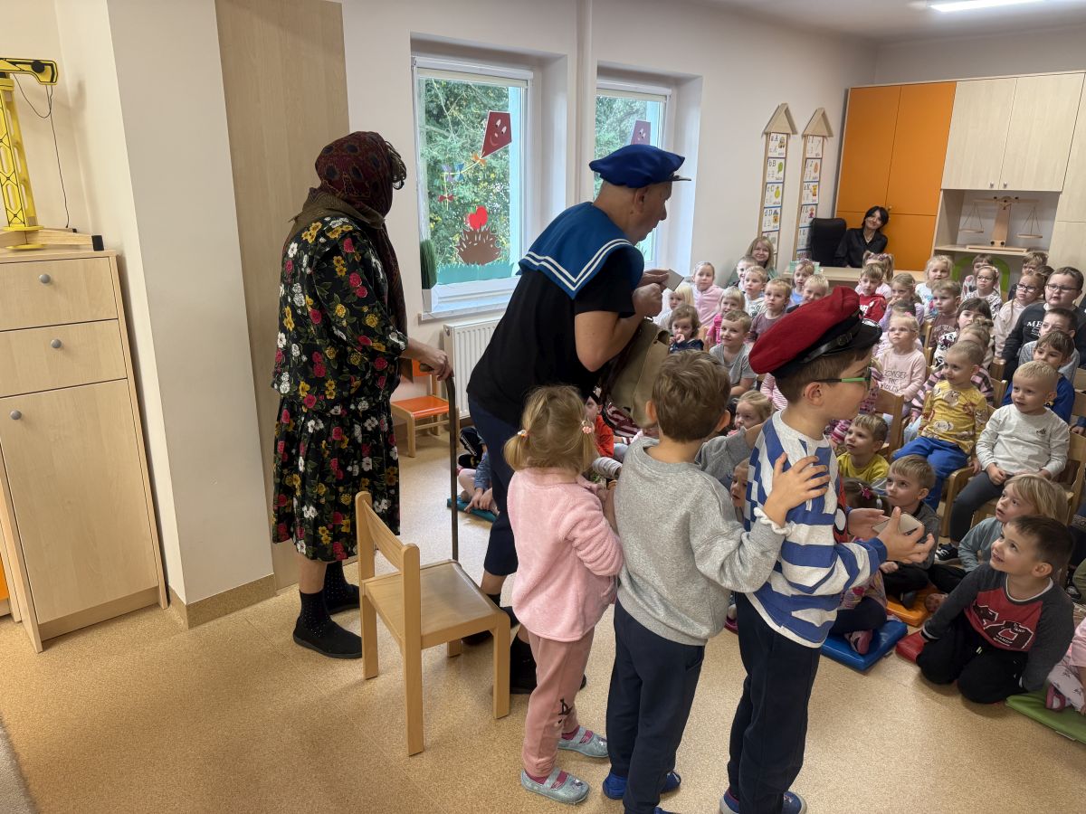 W naszym przedszkolu 16.10.25 odbyło się wyjątkowe przedstawienie teatralne poświęcone tematyce bezpieczeństwa. Dzieci z ogromnym zainteresowaniem oglądały występ aktorów, którzy w ciekawy i zabawny sposób przypomnieli im, jak ważne jest przestrzeganie zasad bezpiecznego poruszania się po drodze. Przedstawienie pełne było humoru, muzyki i wspólnej zabawy, dzięki czemu dzieci z łatwością zapamiętały najważniejsze zasady.