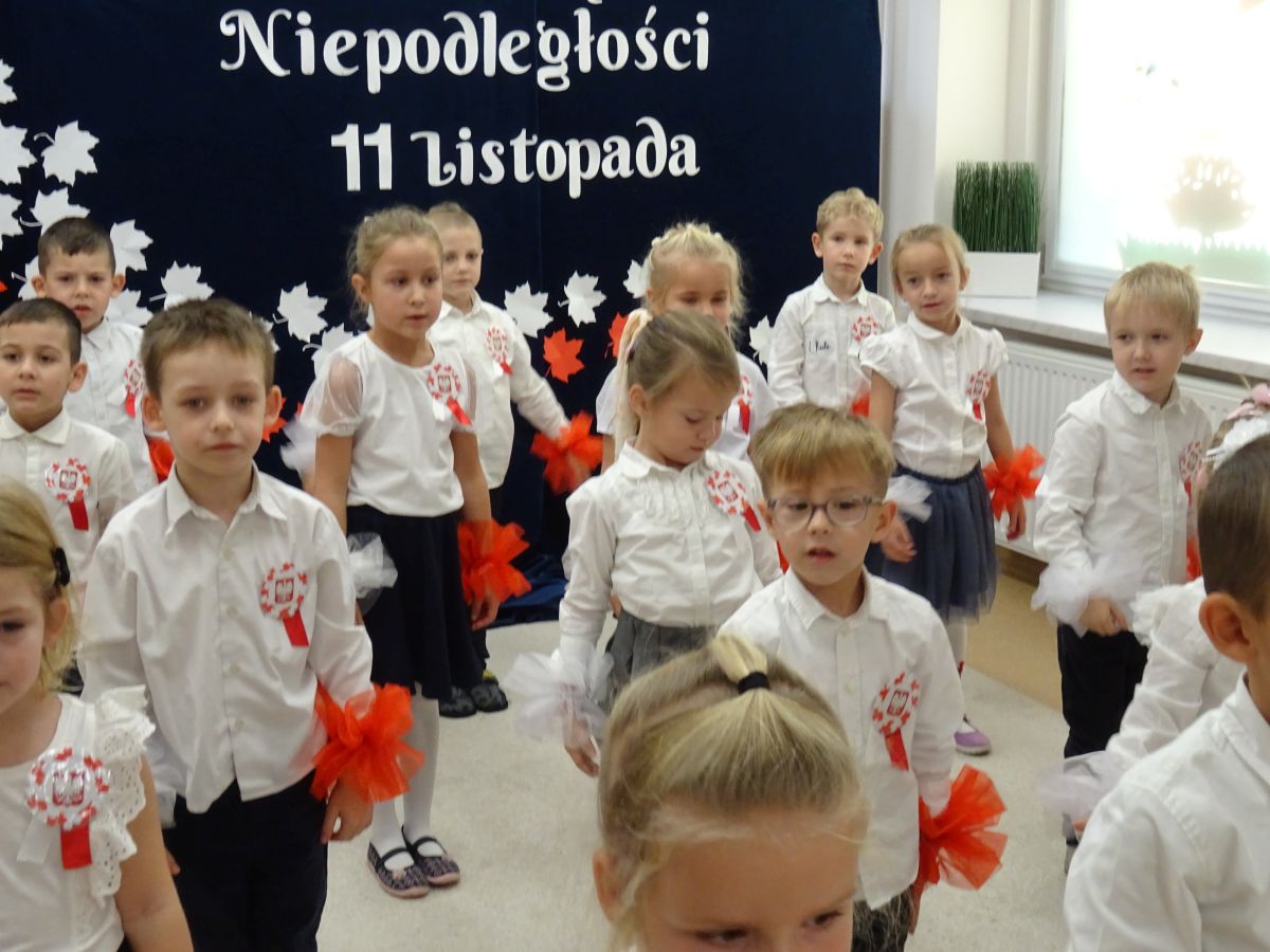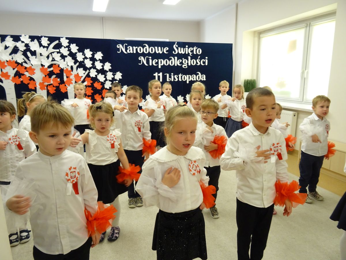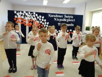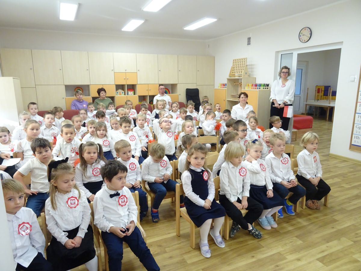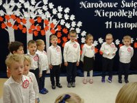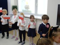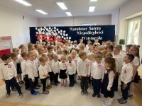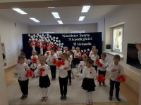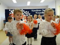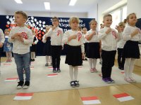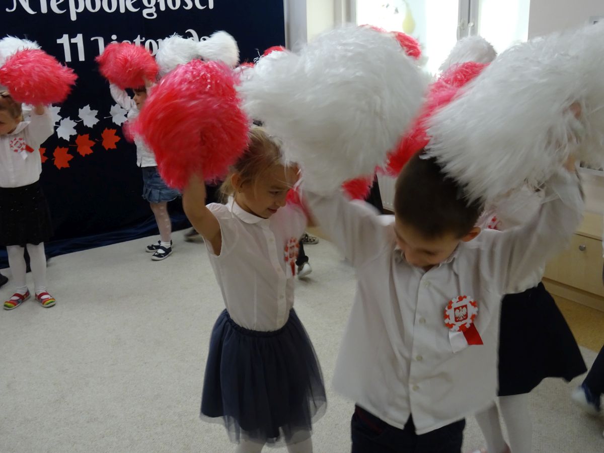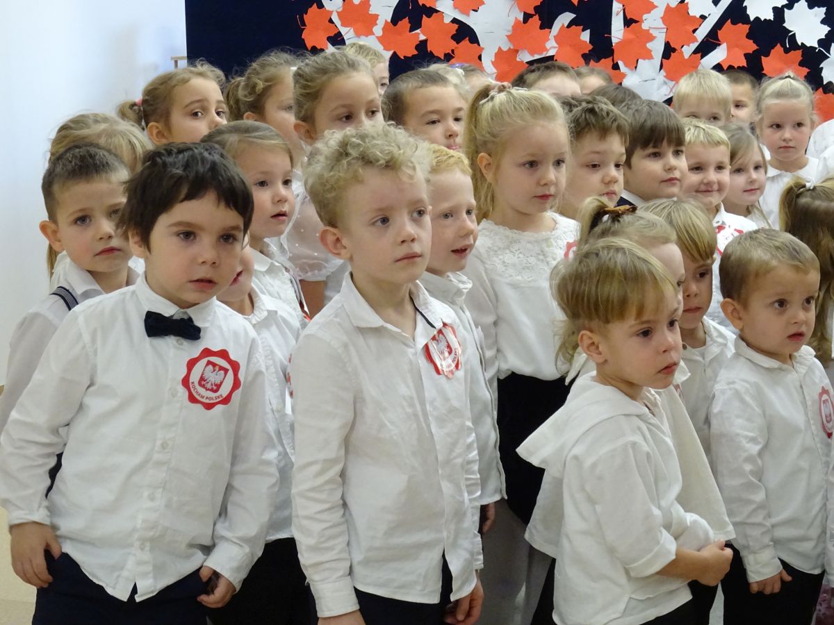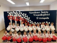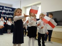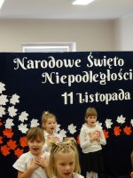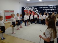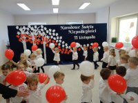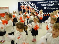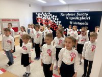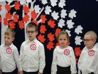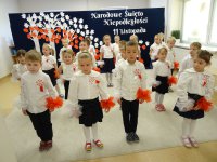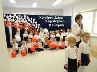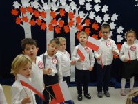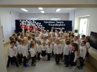 7 listopada w naszym przedszkolu odbyła się uroczysta akademia z okazji "Święta Odzyskania Niepodległości". Przedszkolacy w pełnej gali zaprezentowali piosenki, tańce oraz wiersze nawiązujące tematyką do naszej Ojczyzny - barw narodowych, godła, flagi oraz ważnych wydarzeń związanych z Polską. Na zakończenie wszyscy bardzo uroczyście odśpiewali "Mazurek Dąbrowskiego" - hymn Polski.. Cała uroczystość miała bardzo podniosły charakter. Na twarzach dzieci widać było skupienie i zrozumienie ważności tego święta.