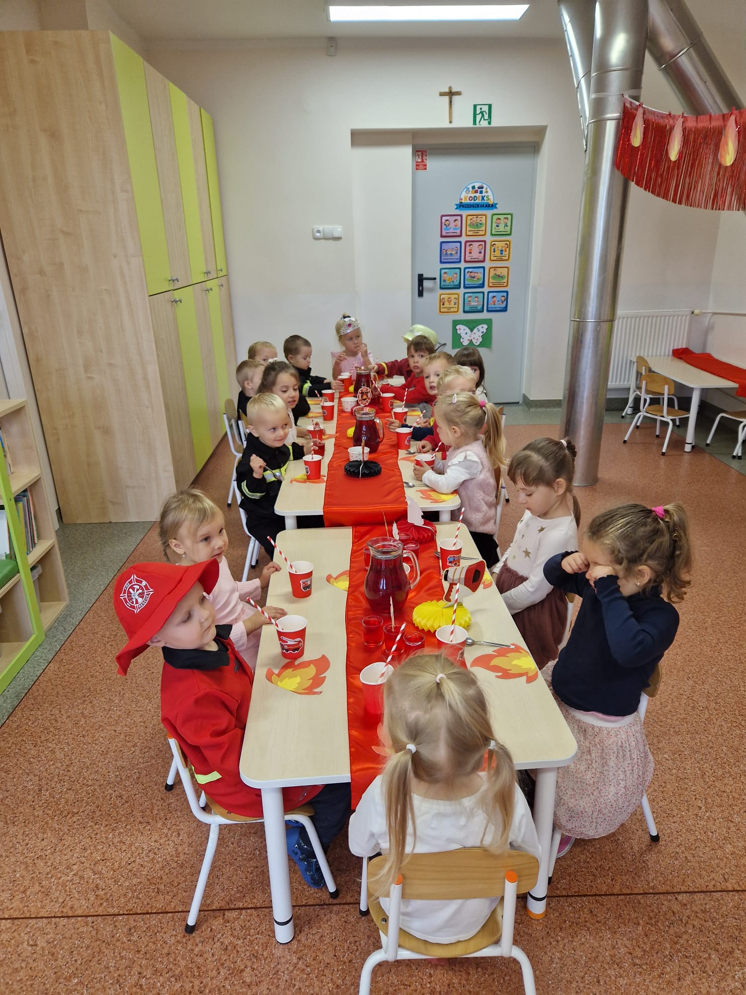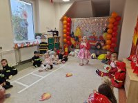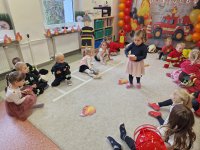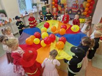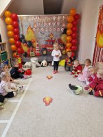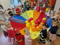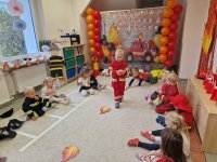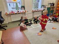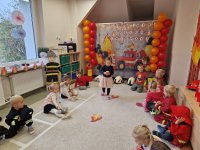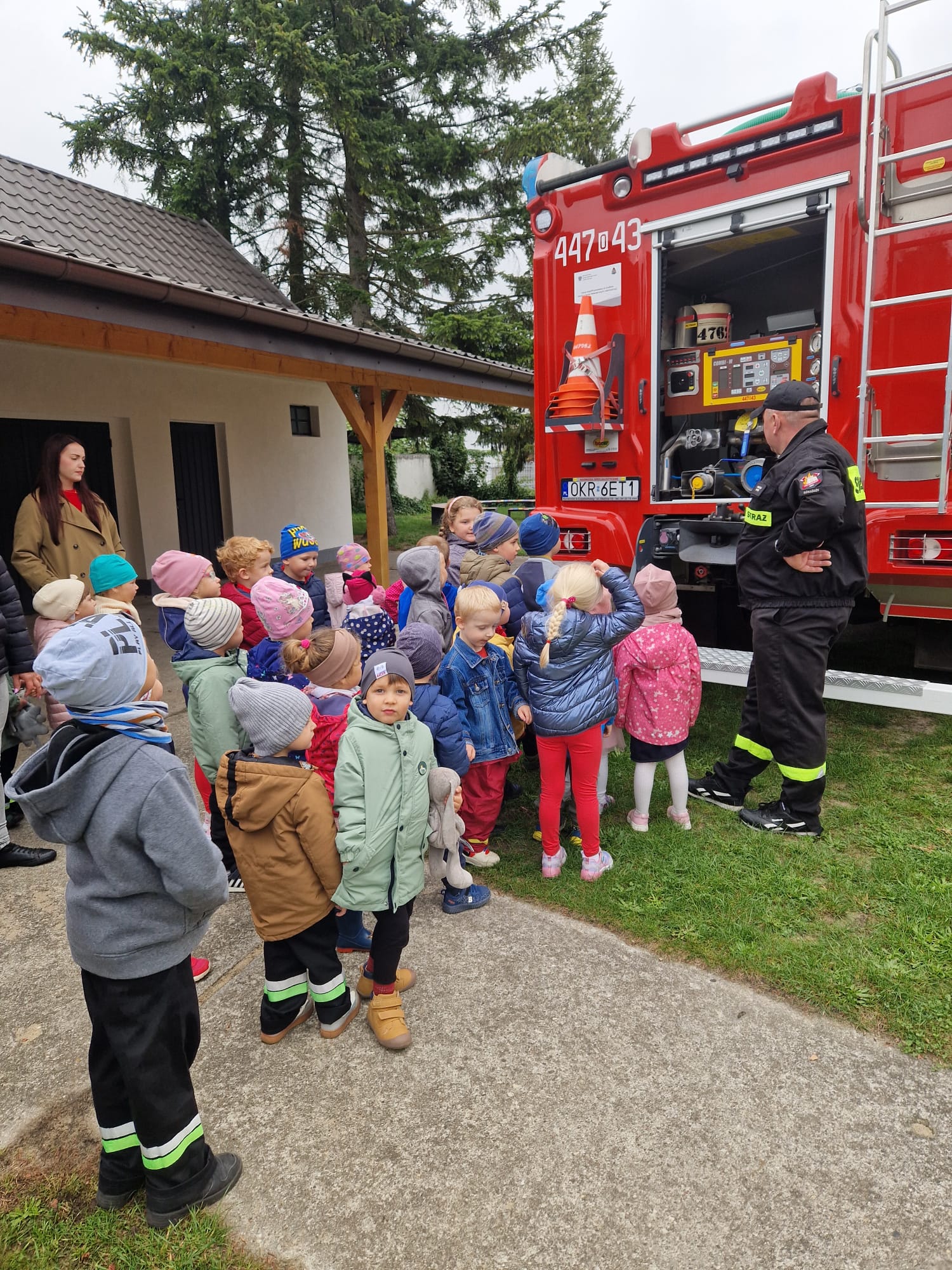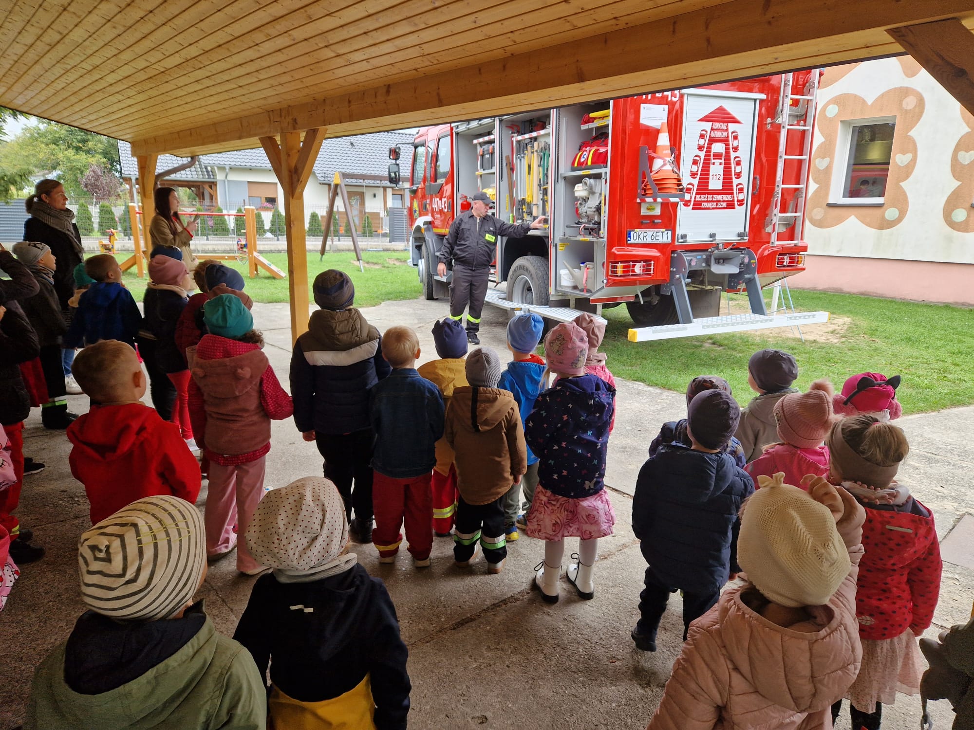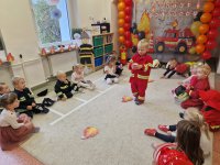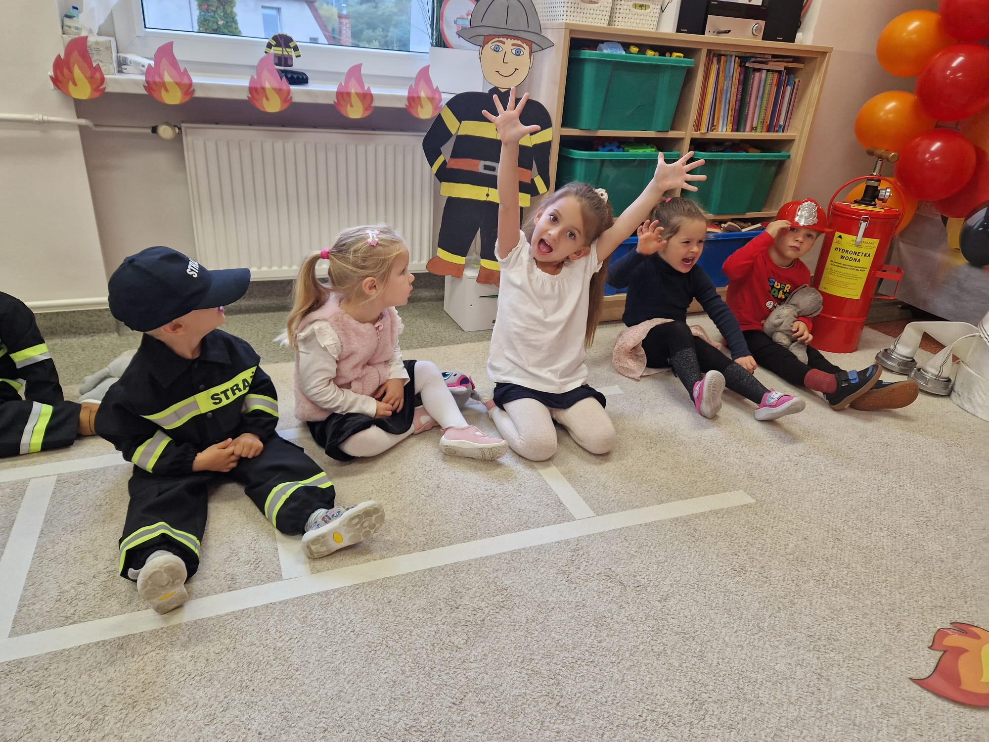 Największą niespodzianką dnia była wizyta strażaka, który przyjechał do przedszkola dużym wozem strażackim. Dzieci miały okazję zobaczyć z bliska sprzęt strażacki, posłuchać ciekawych opowieści i przekonać się, jak ważna i odpowiedzialna jest praca strażaka. Spotkanie wzbudziło ogromne zainteresowanie i zachwyt u wszystkich.
