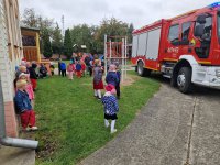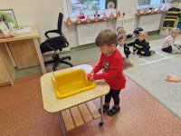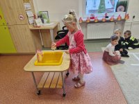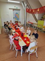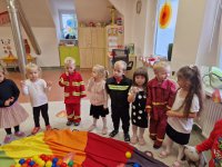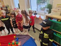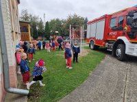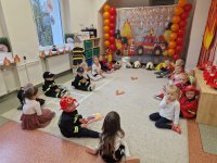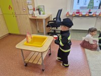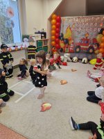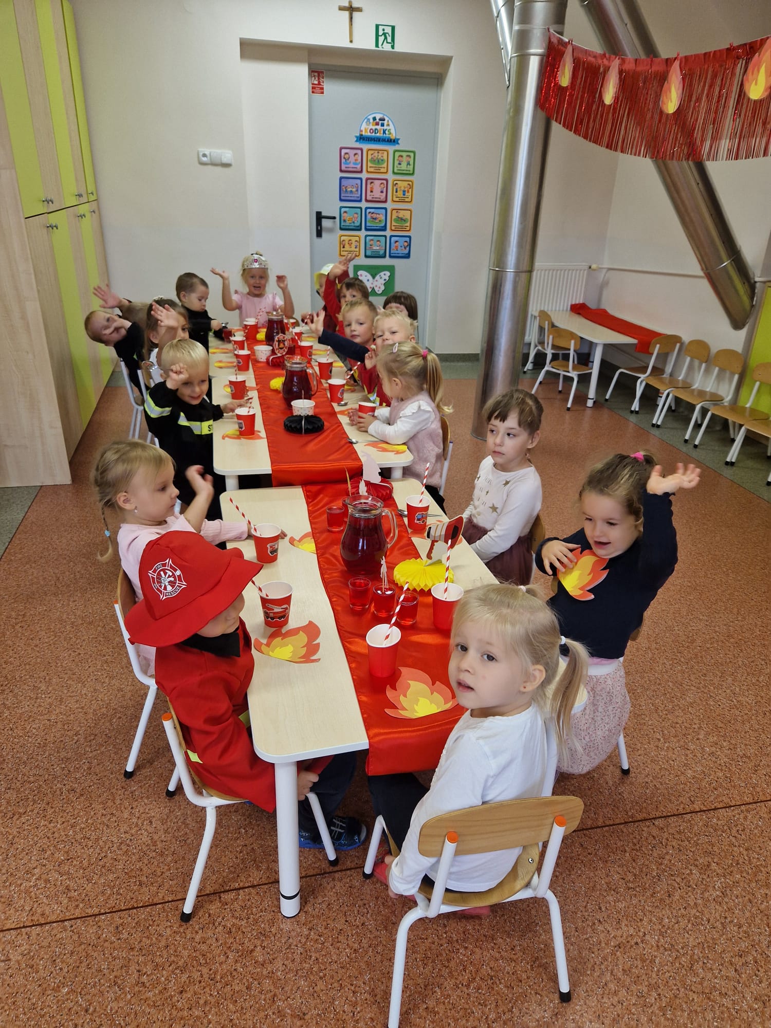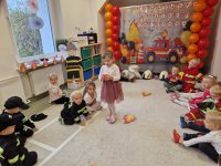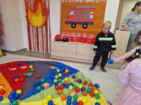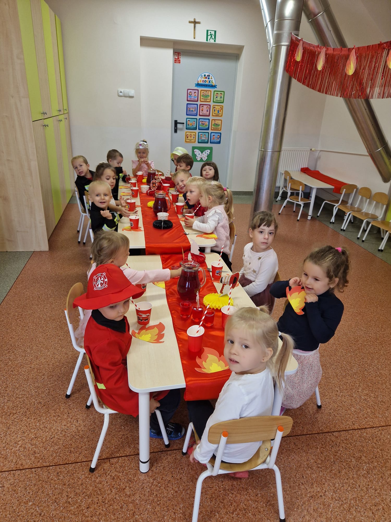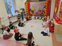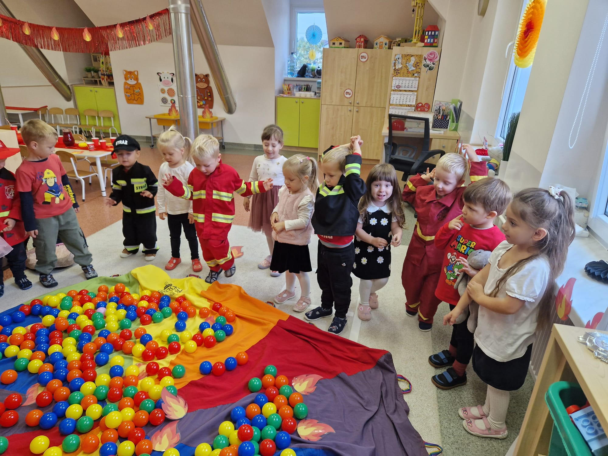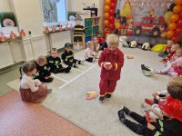 Największą niespodzianką dnia była wizyta strażaka, który przyjechał do przedszkola dużym wozem strażackim. Dzieci miały okazję zobaczyć z bliska sprzęt strażacki, posłuchać ciekawych opowieści i przekonać się, jak ważna i odpowiedzialna jest praca strażaka. Spotkanie wzbudziło ogromne zainteresowanie i zachwyt u wszystkich.