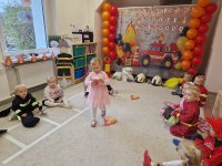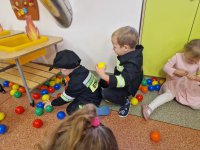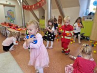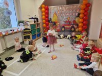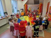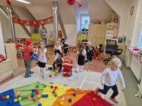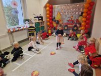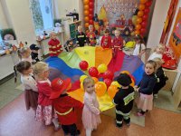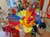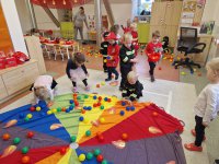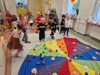 Na dzieci czekało wiele atrakcji: zabawy z kolorową chustą animacyjną, balonami i piłeczkami, a także wspólne tańce, które wprowadziły wszystkich w doskonały nastrój. Nie zabrakło również pysznego poczęstunku, którym dzieci mogły się częstować podczas przerw w zabawie.