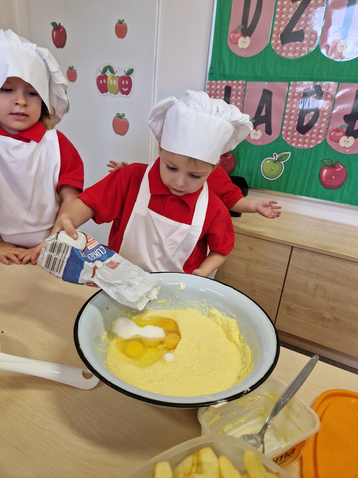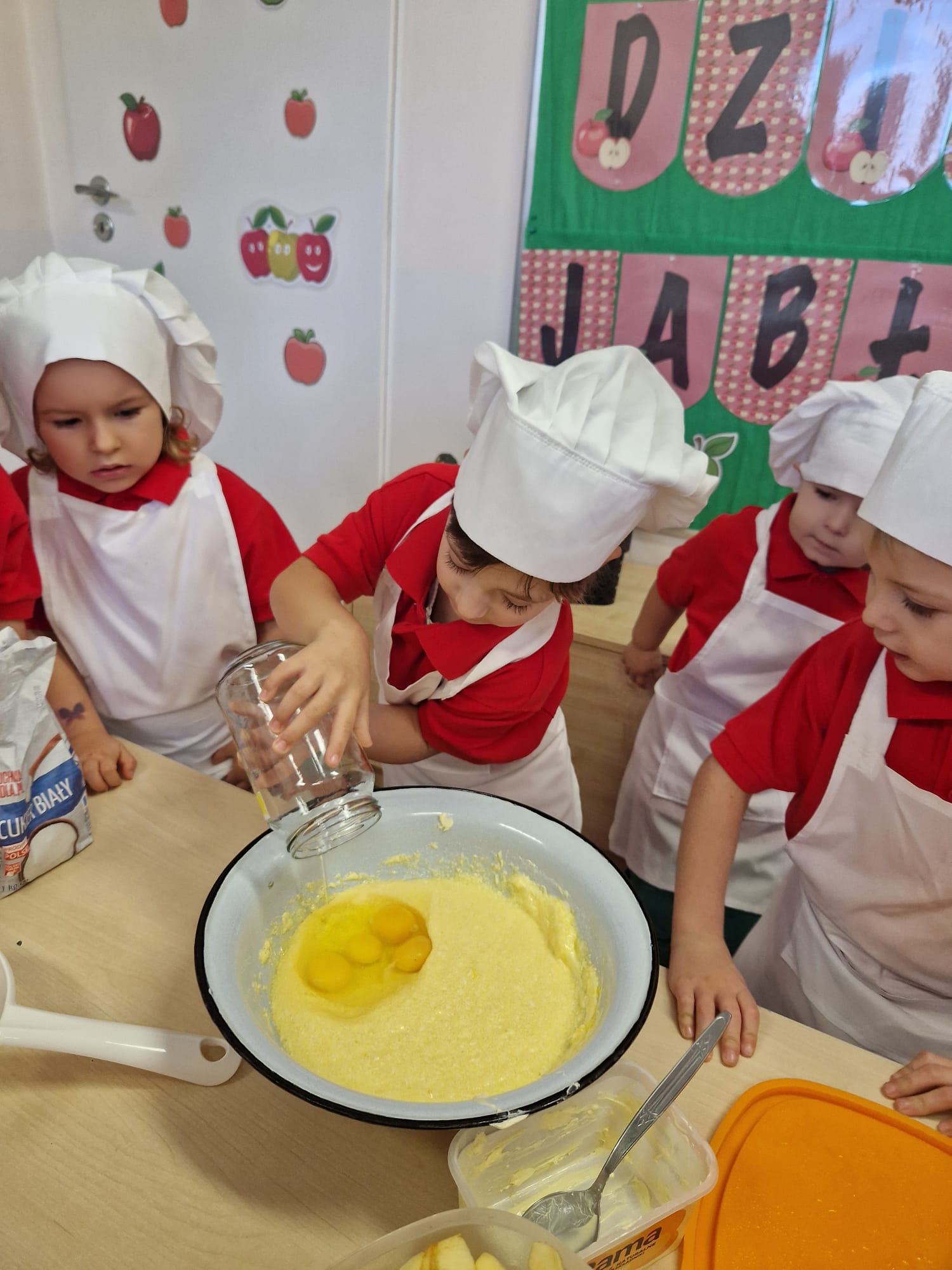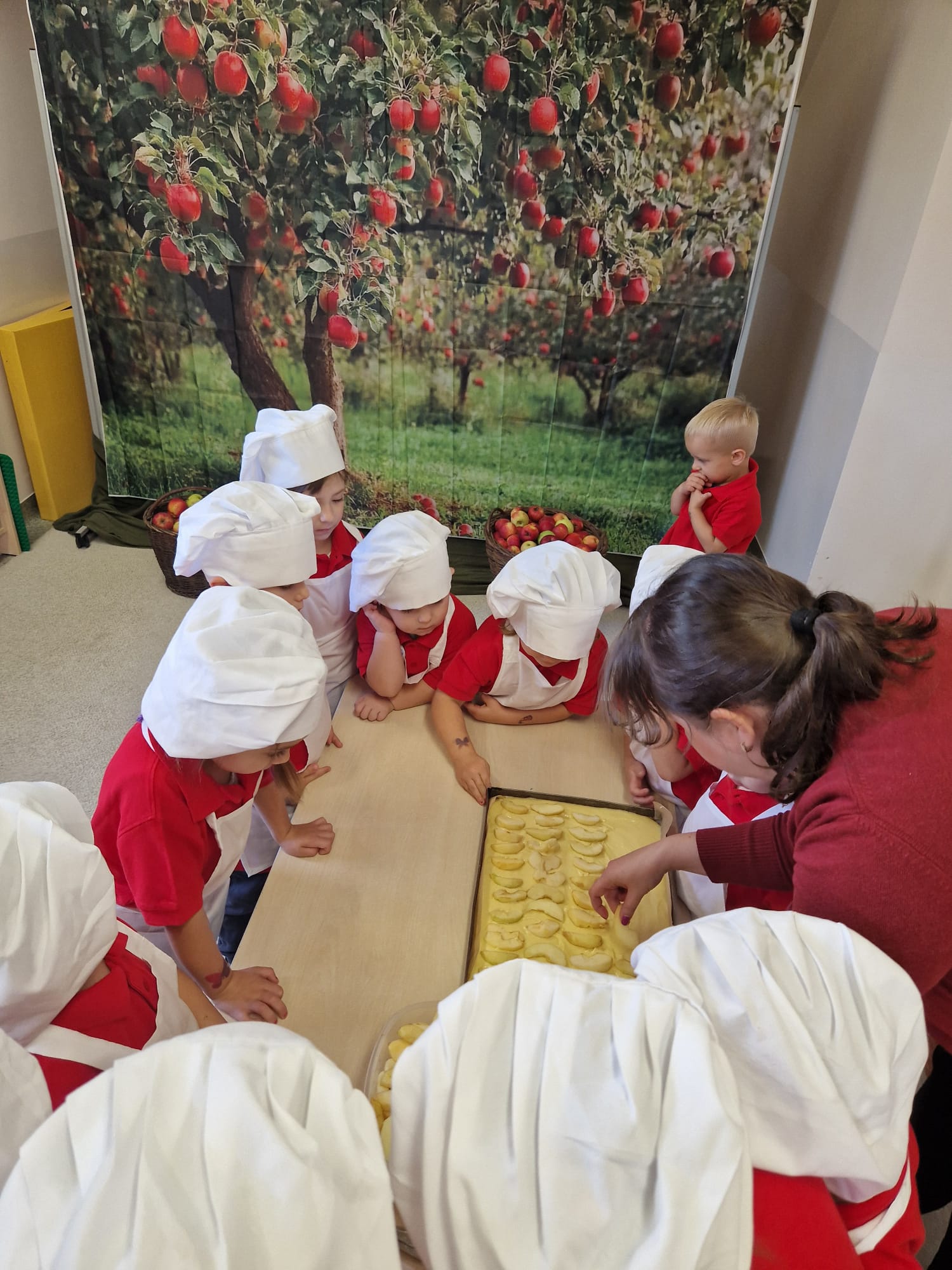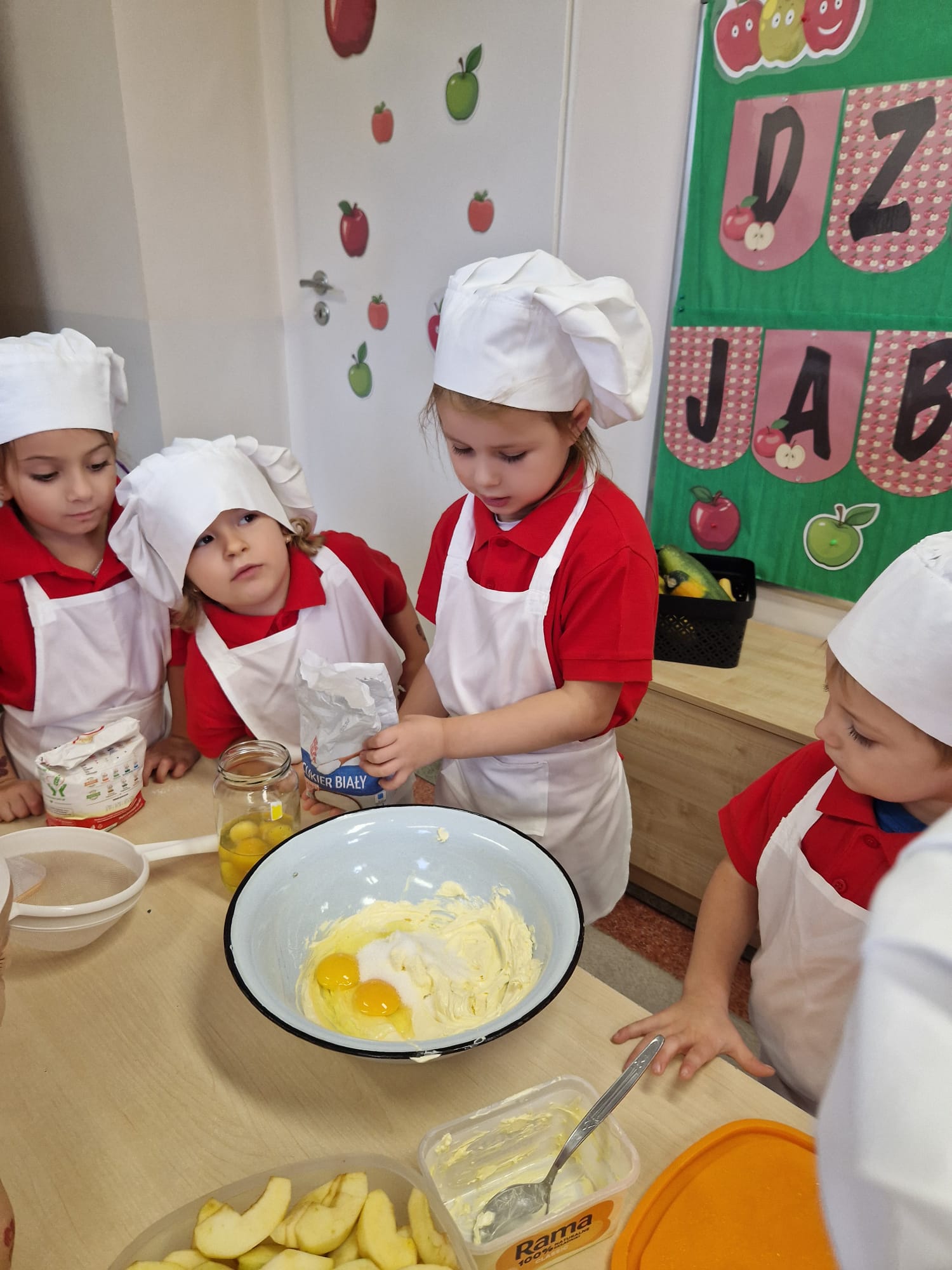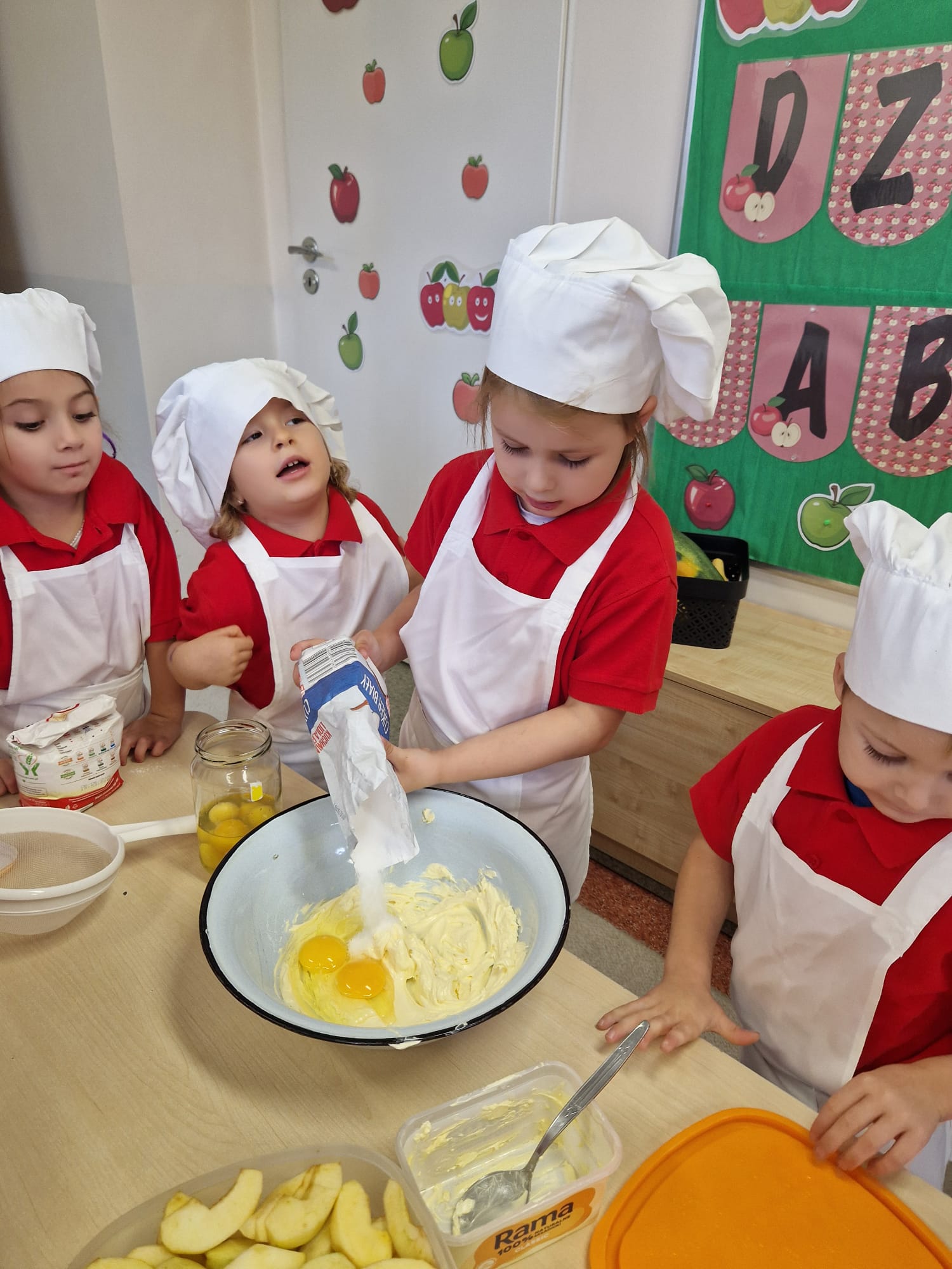 Najwięcej radości sprawiło nam pieczenie ciasta jabłkowego. Mali kucharze z zapałem obierali jabłka, mieszali składniki i z niecierpliwością czekali, aż w całym przedszkolu rozniesie się zapach świeżo upieczonego ciasta. Gdy ciasto było gotowe, wszyscy z apetytem zjedli swoje porcje – było pyszne!