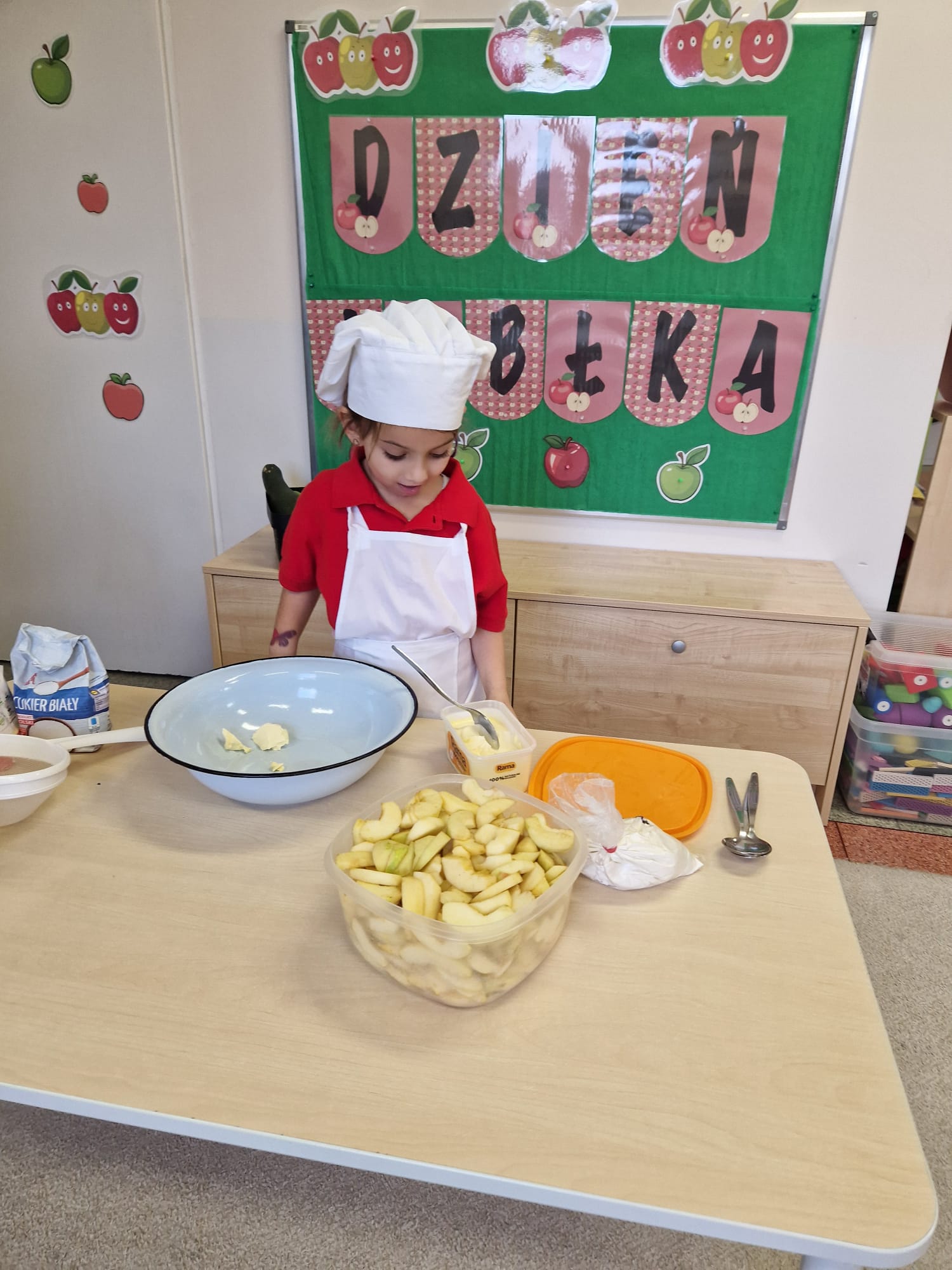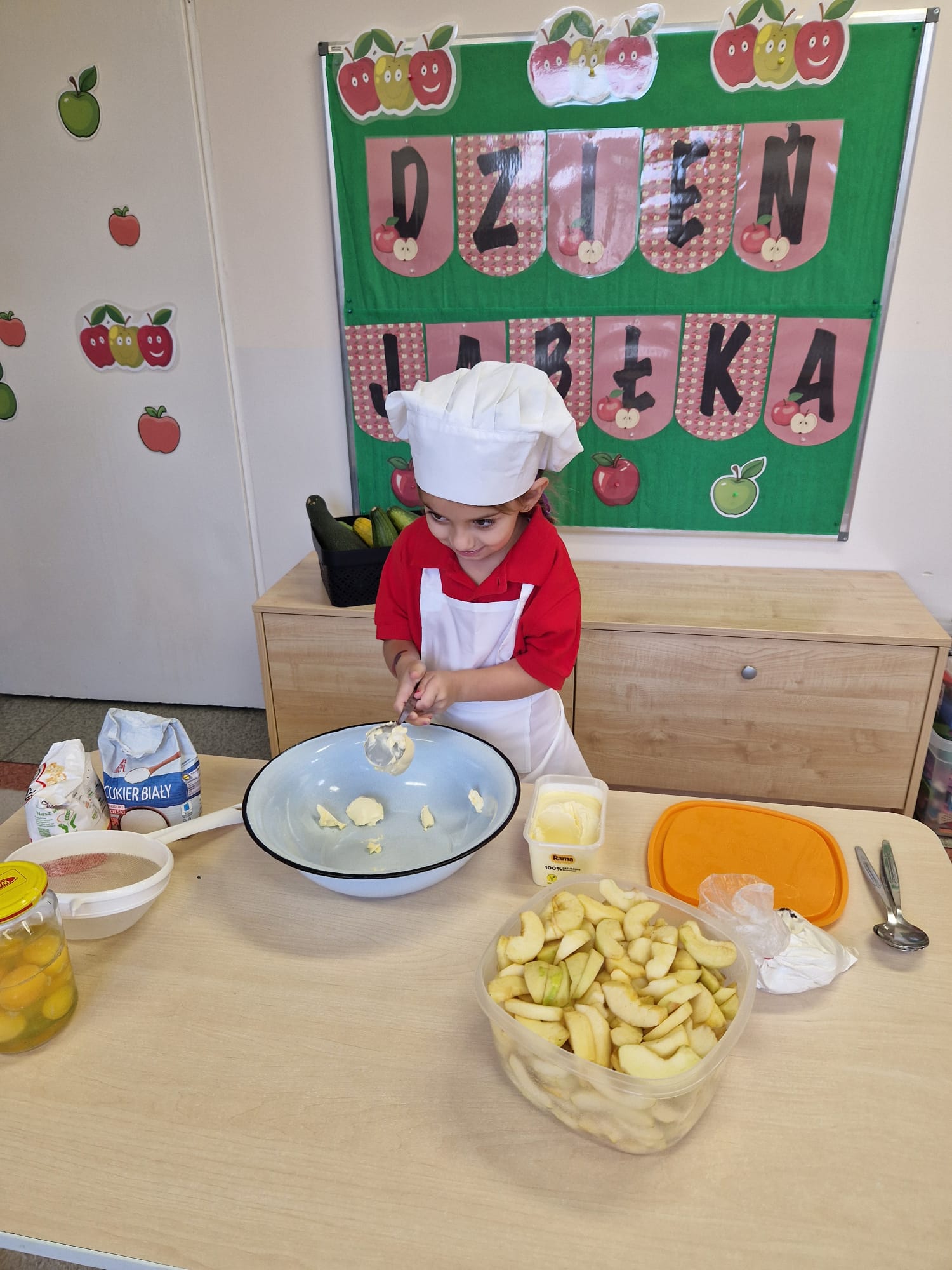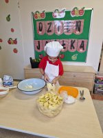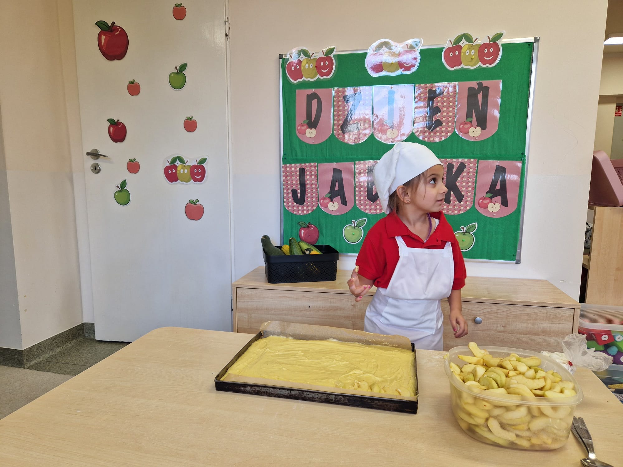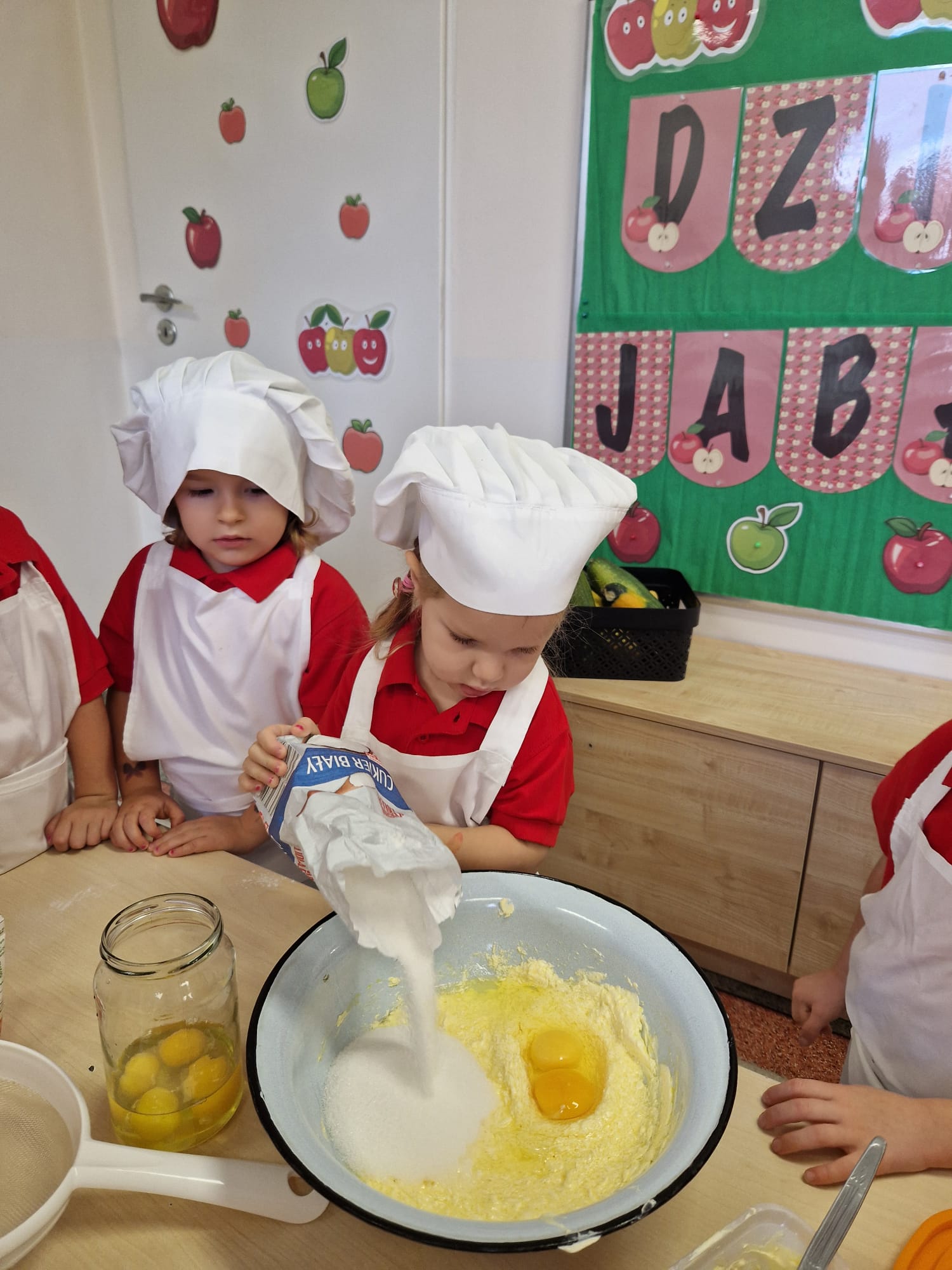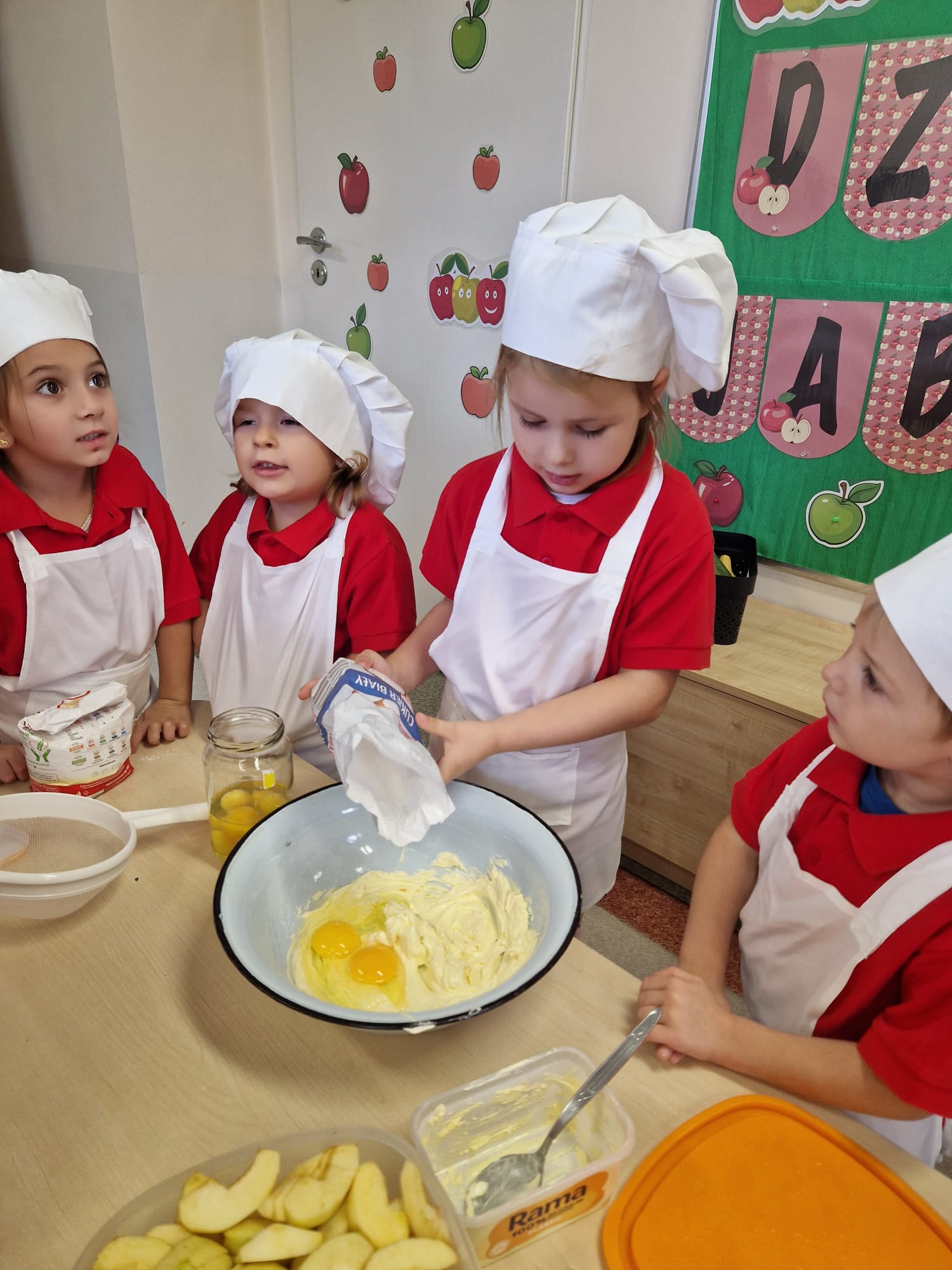 Najwięcej radości sprawiło nam pieczenie ciasta jabłkowego. Mali kucharze z zapałem obierali jabłka, mieszali składniki i z niecierpliwością czekali, aż w całym przedszkolu rozniesie się zapach świeżo upieczonego ciasta. Gdy ciasto było gotowe, wszyscy z apetytem zjedli swoje porcje – było pyszne!