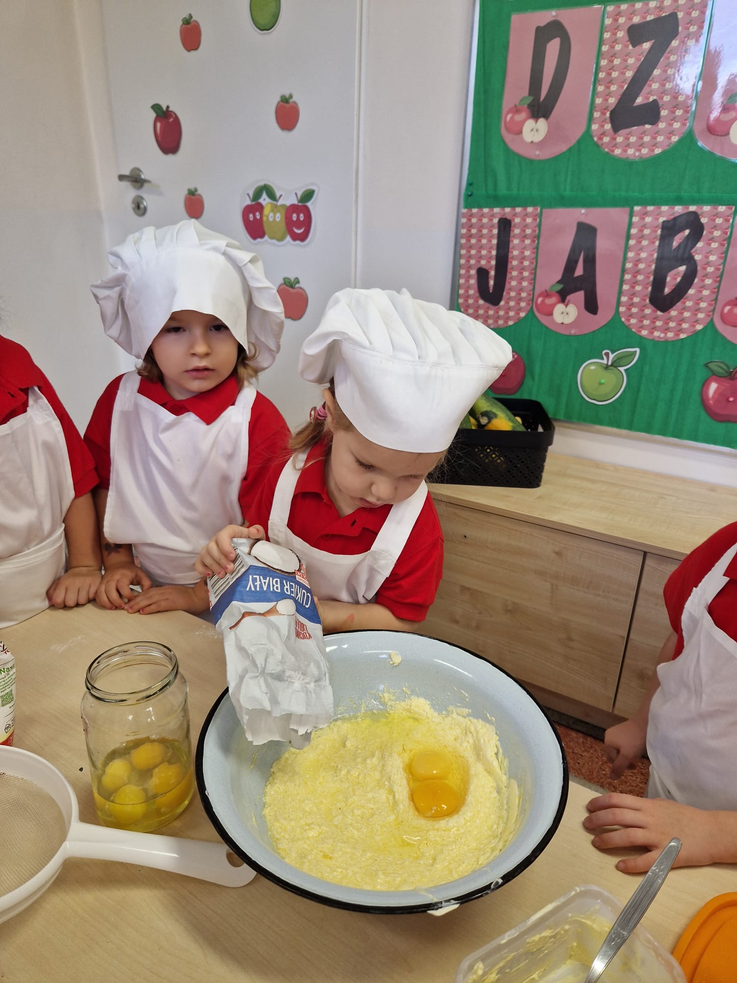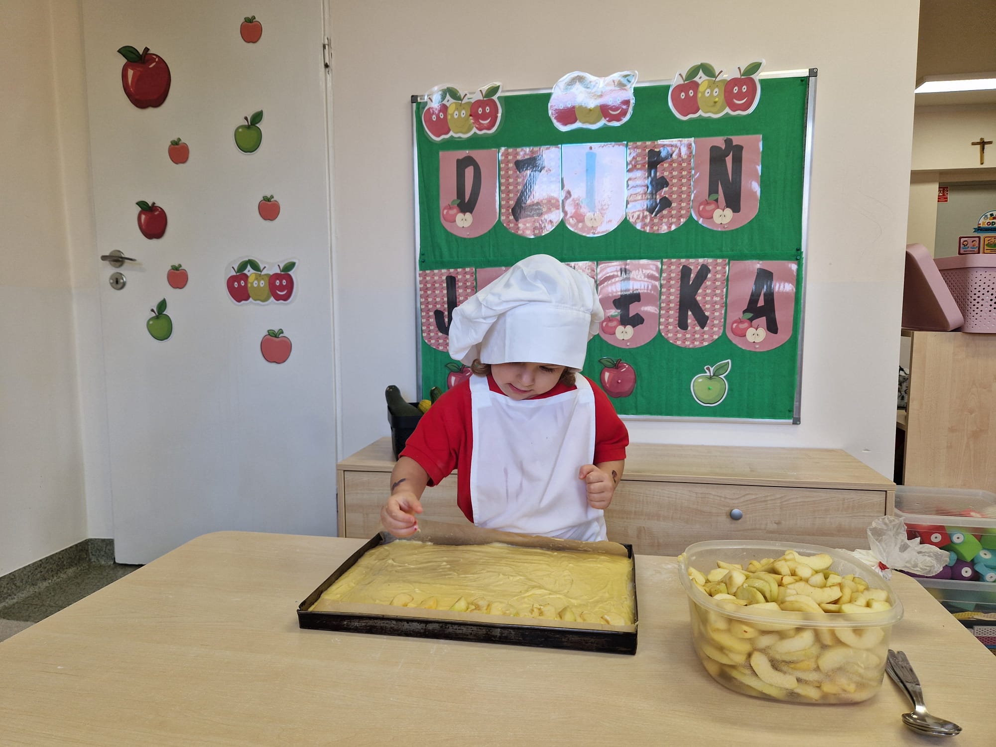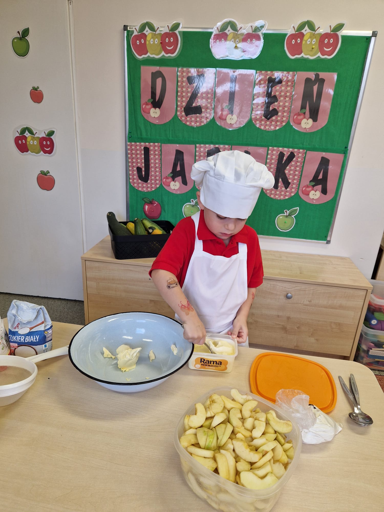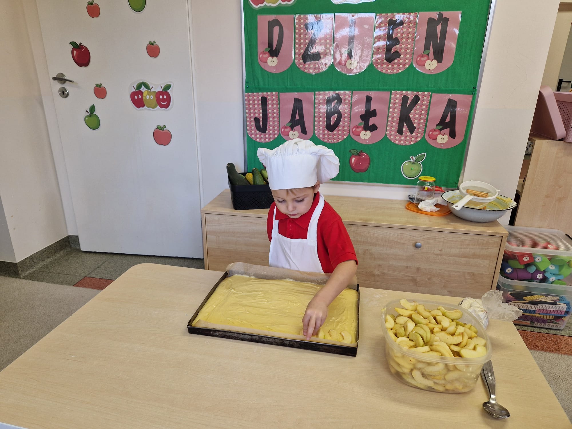 Najwięcej radości sprawiło nam pieczenie ciasta jabłkowego. Mali kucharze z zapałem obierali jabłka, mieszali składniki i z niecierpliwością czekali, aż w całym przedszkolu rozniesie się zapach świeżo upieczonego ciasta. Gdy ciasto było gotowe, wszyscy z apetytem zjedli swoje porcje – było pyszne!