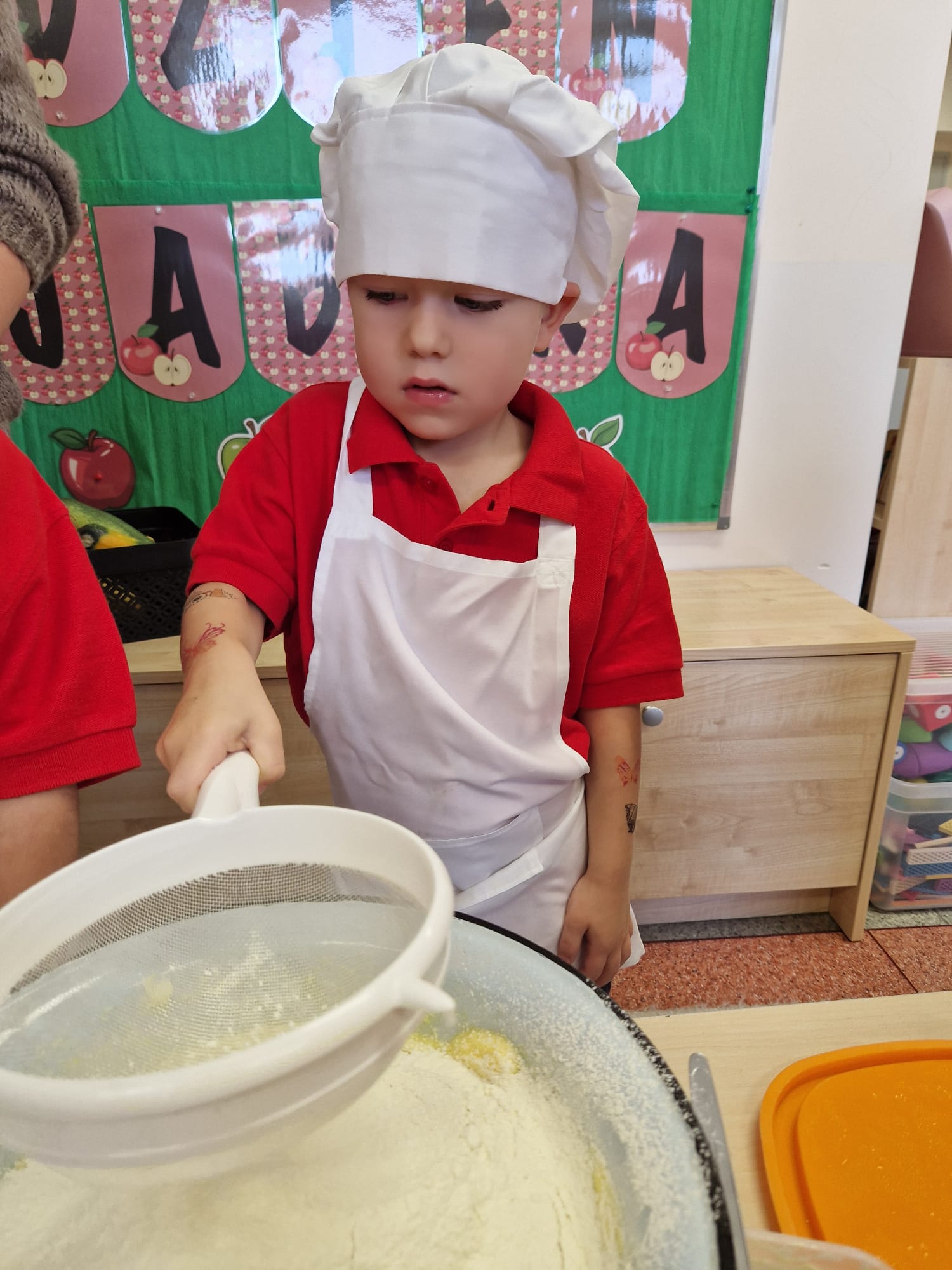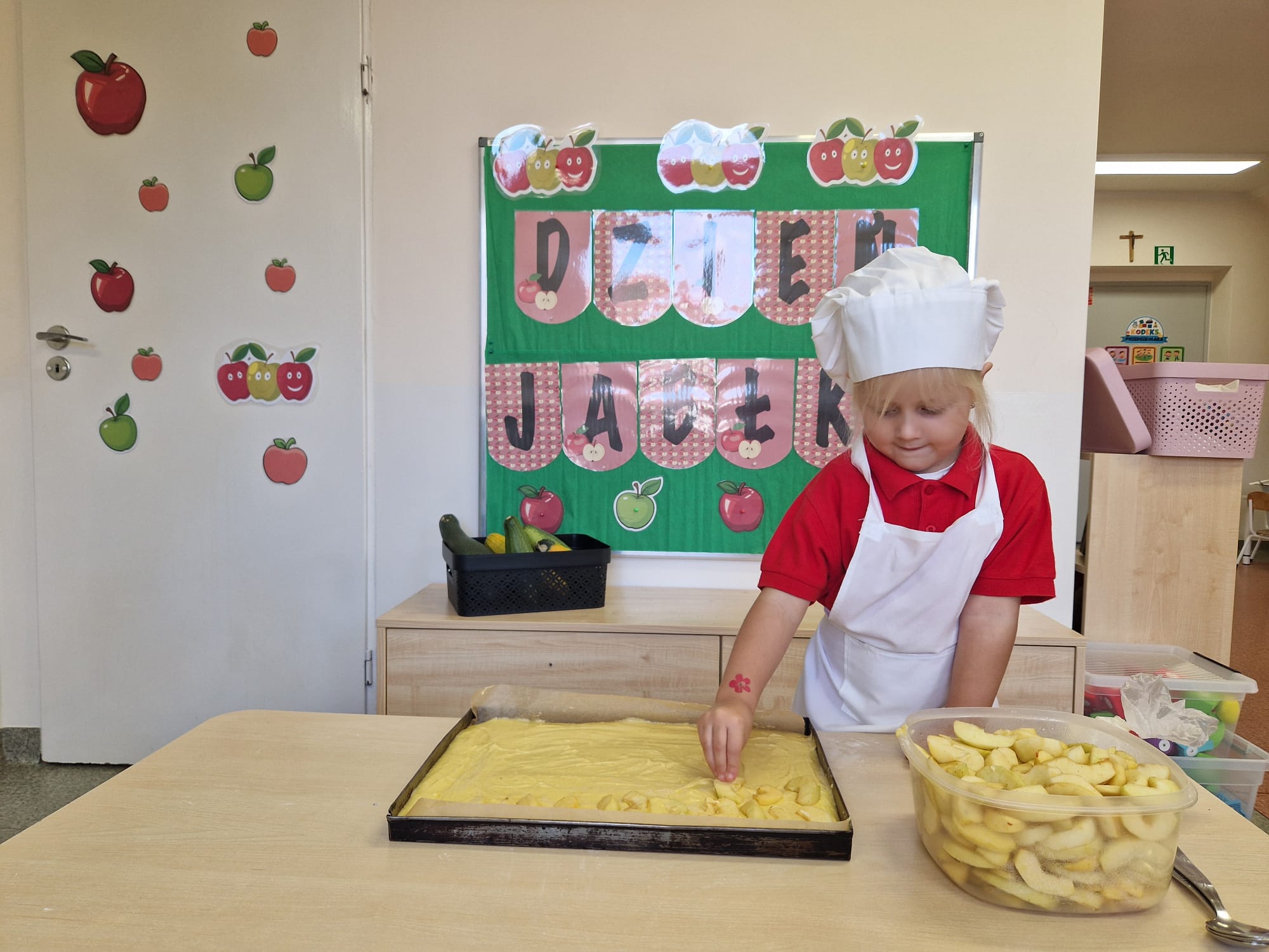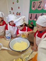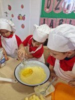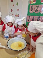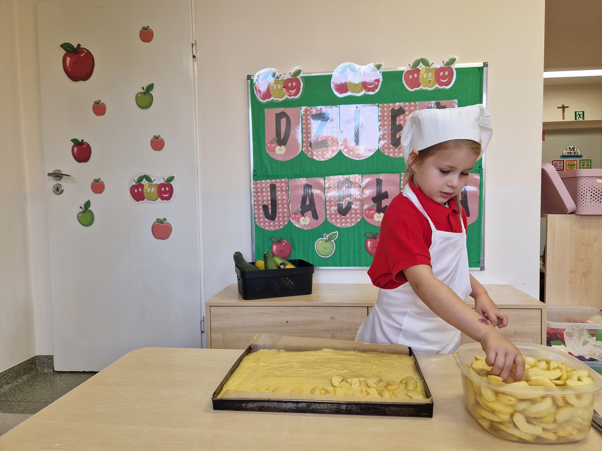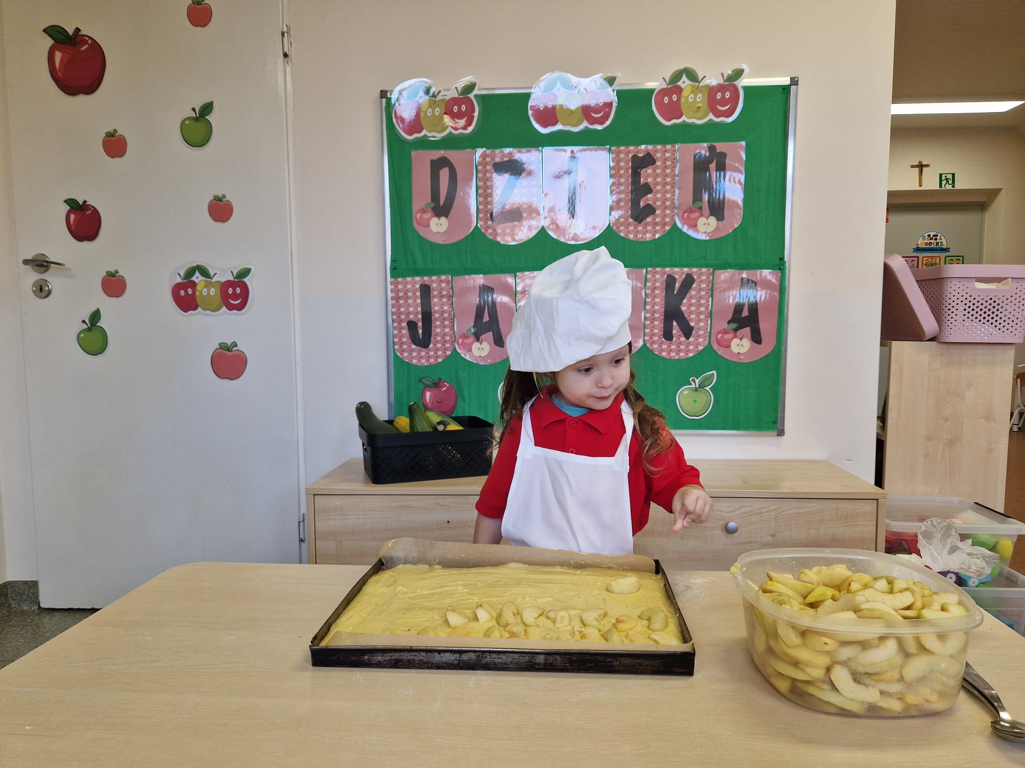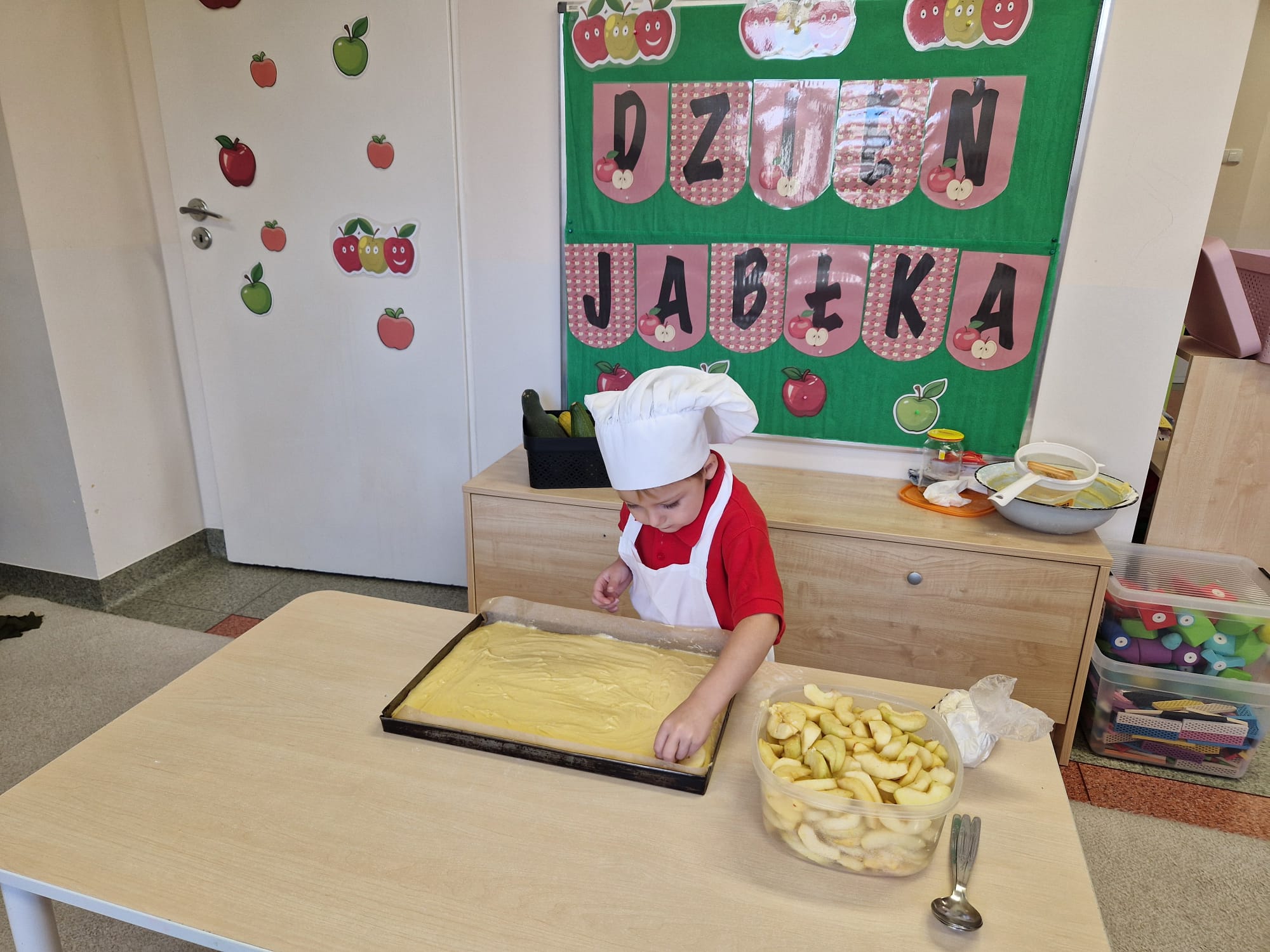 Najwięcej radości sprawiło nam pieczenie ciasta jabłkowego. Mali kucharze z zapałem obierali jabłka, mieszali składniki i z niecierpliwością czekali, aż w całym przedszkolu rozniesie się zapach świeżo upieczonego ciasta. Gdy ciasto było gotowe, wszyscy z apetytem zjedli swoje porcje – było pyszne!