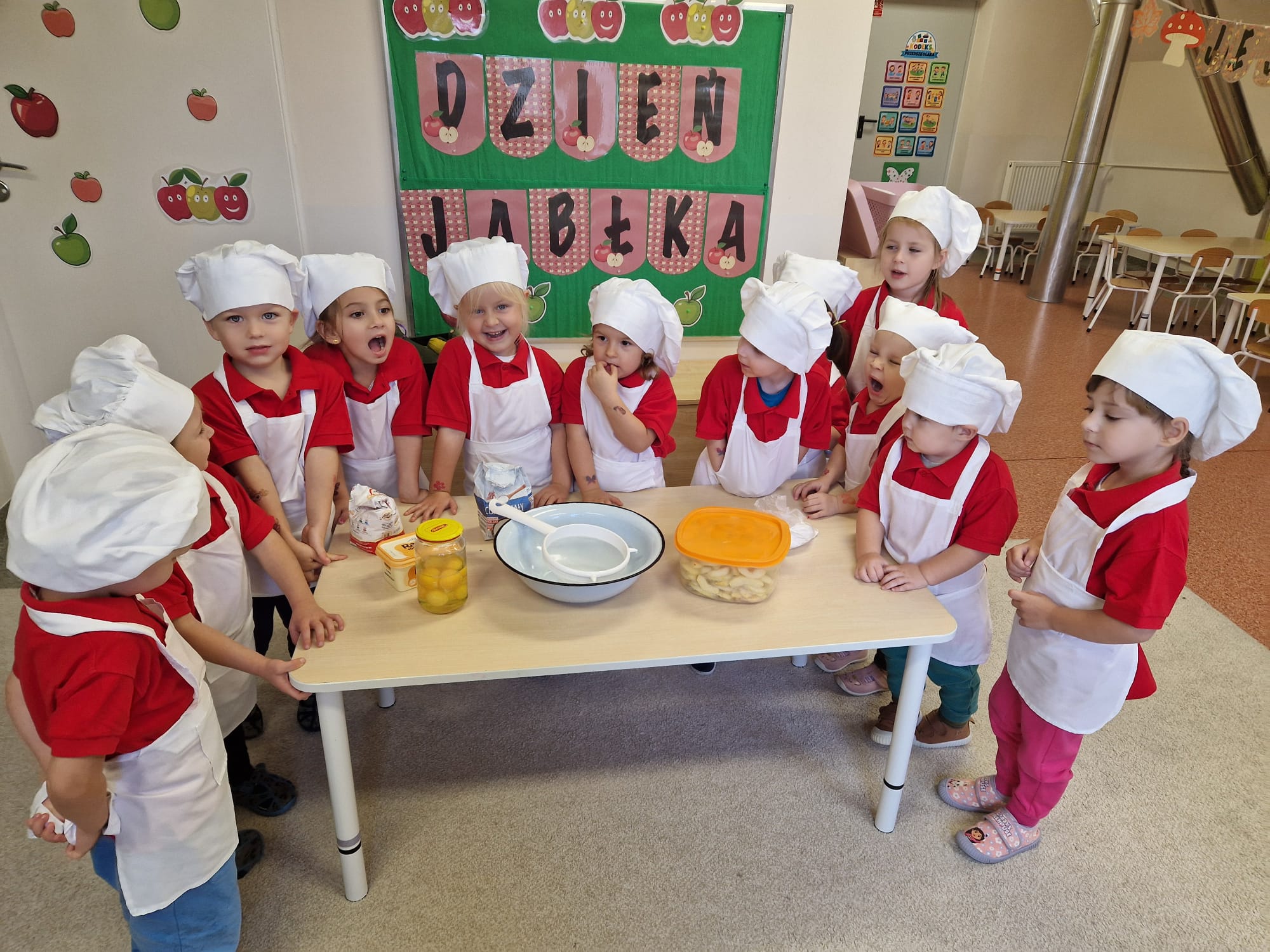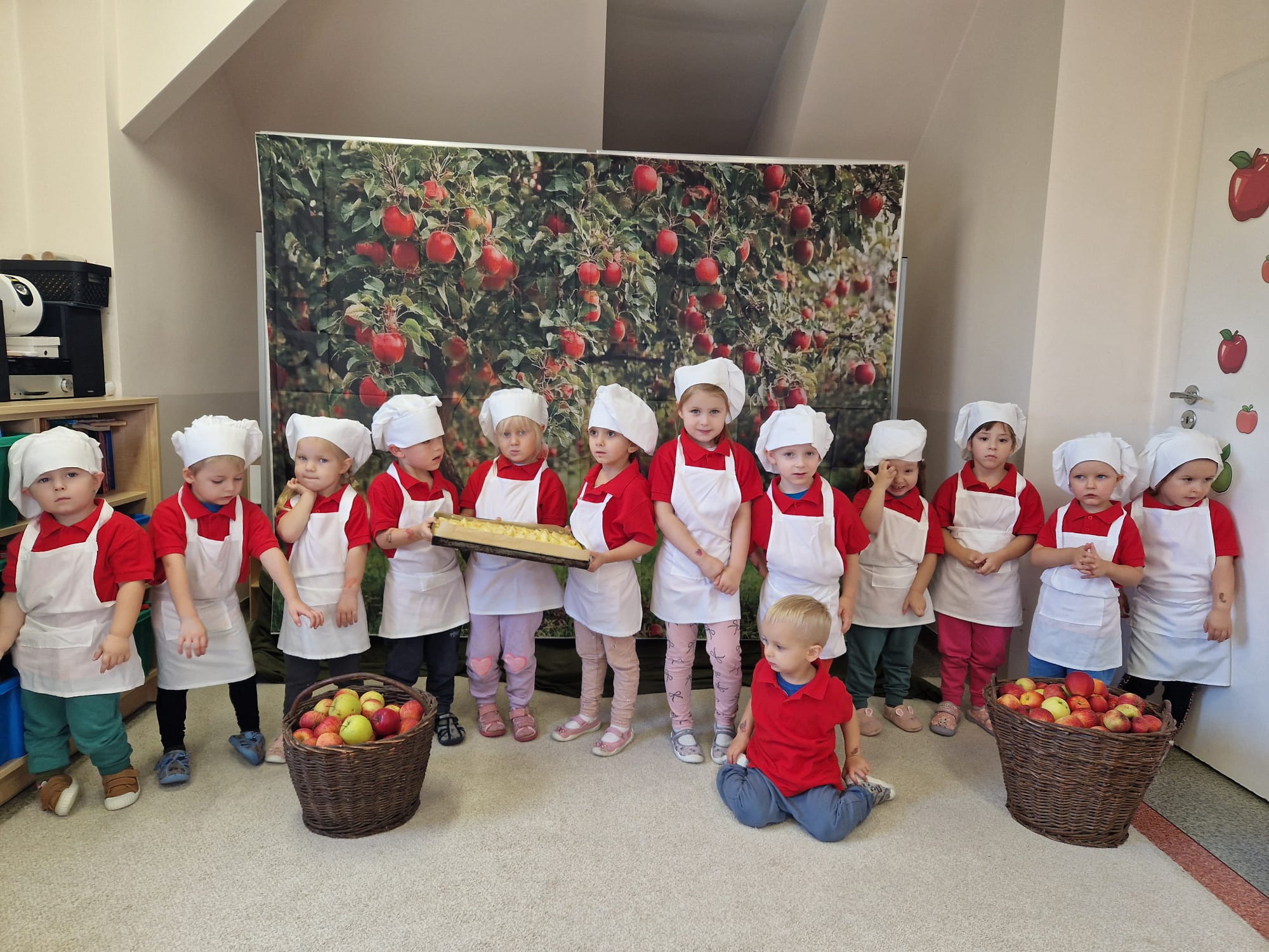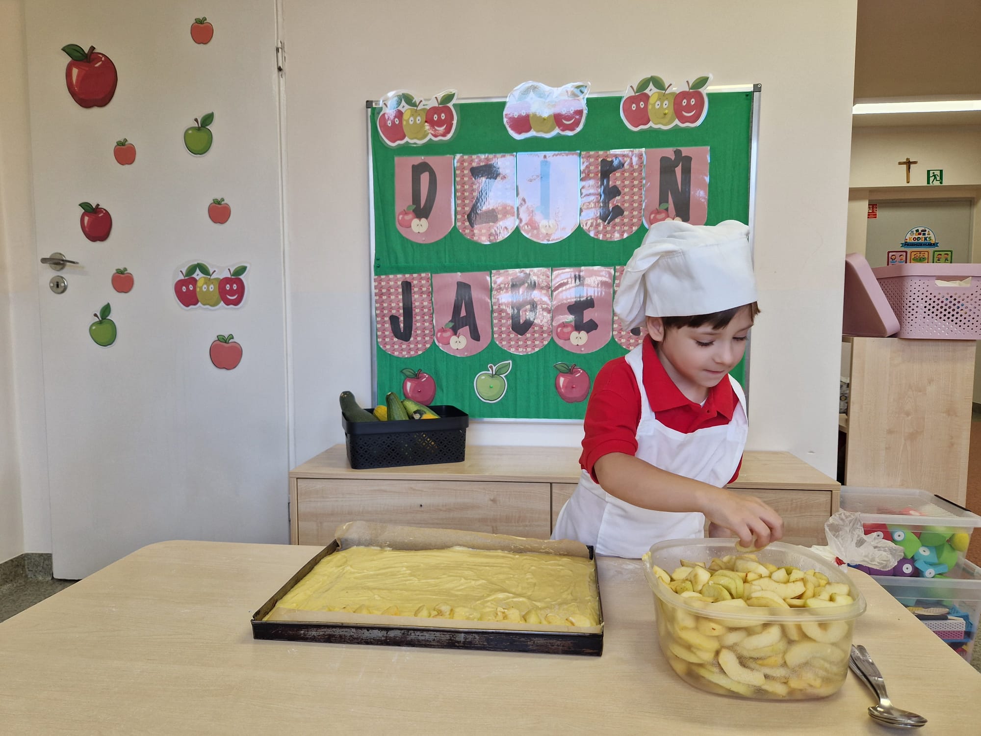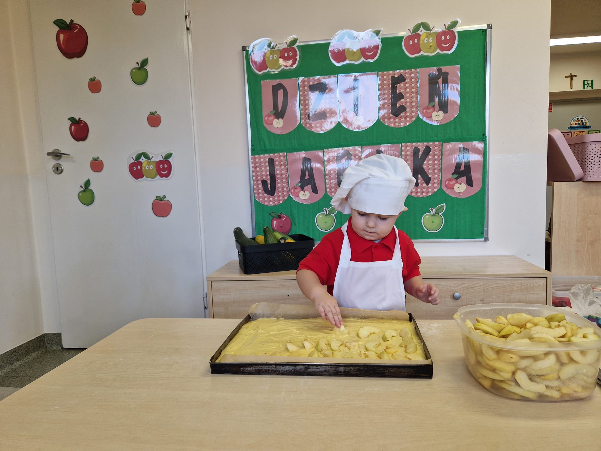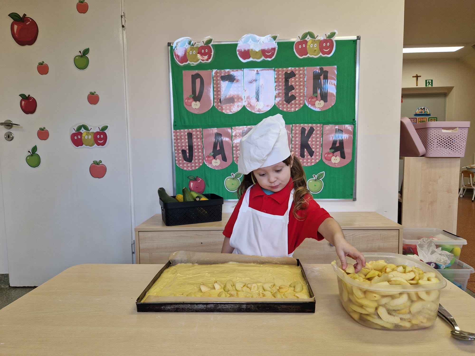 Najwięcej radości sprawiło nam pieczenie ciasta jabłkowego. Mali kucharze z zapałem obierali jabłka, mieszali składniki i z niecierpliwością czekali, aż w całym przedszkolu rozniesie się zapach świeżo upieczonego ciasta. Gdy ciasto było gotowe, wszyscy z apetytem zjedli swoje porcje – było pyszne!