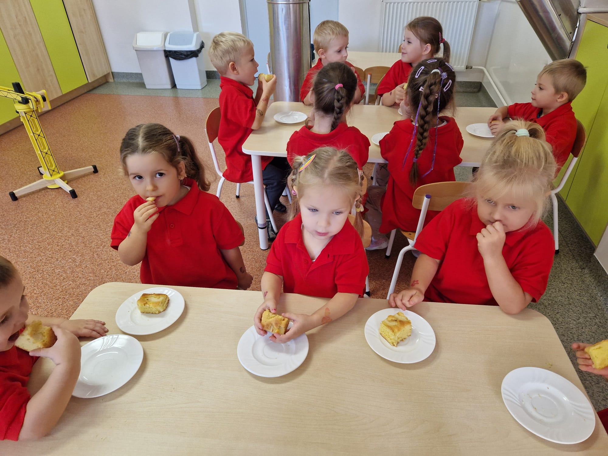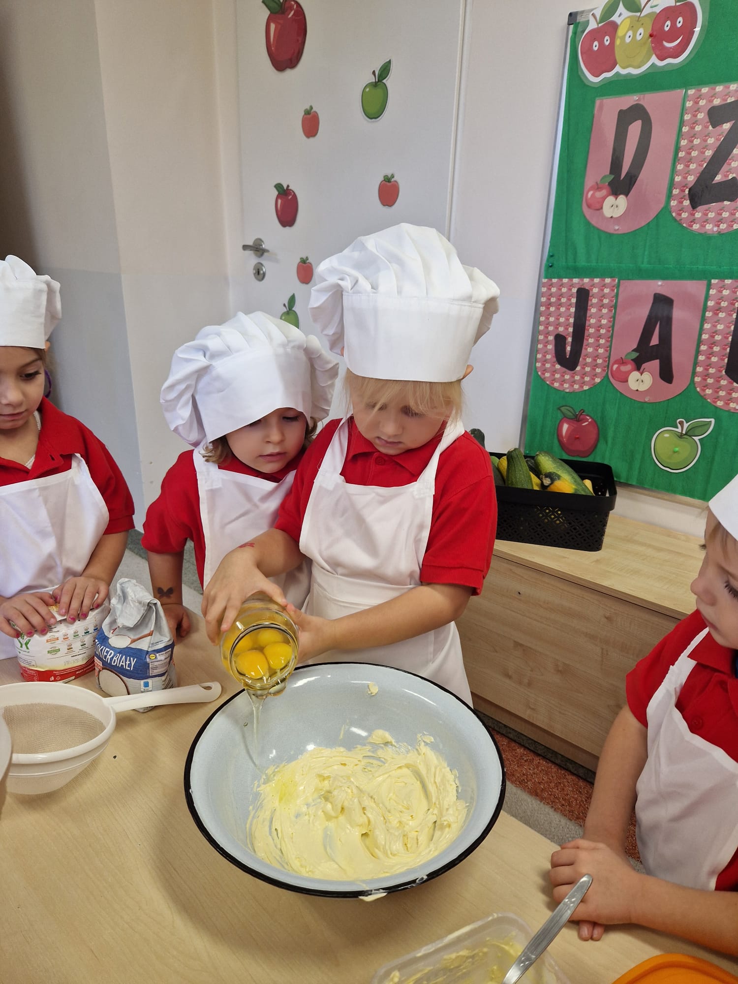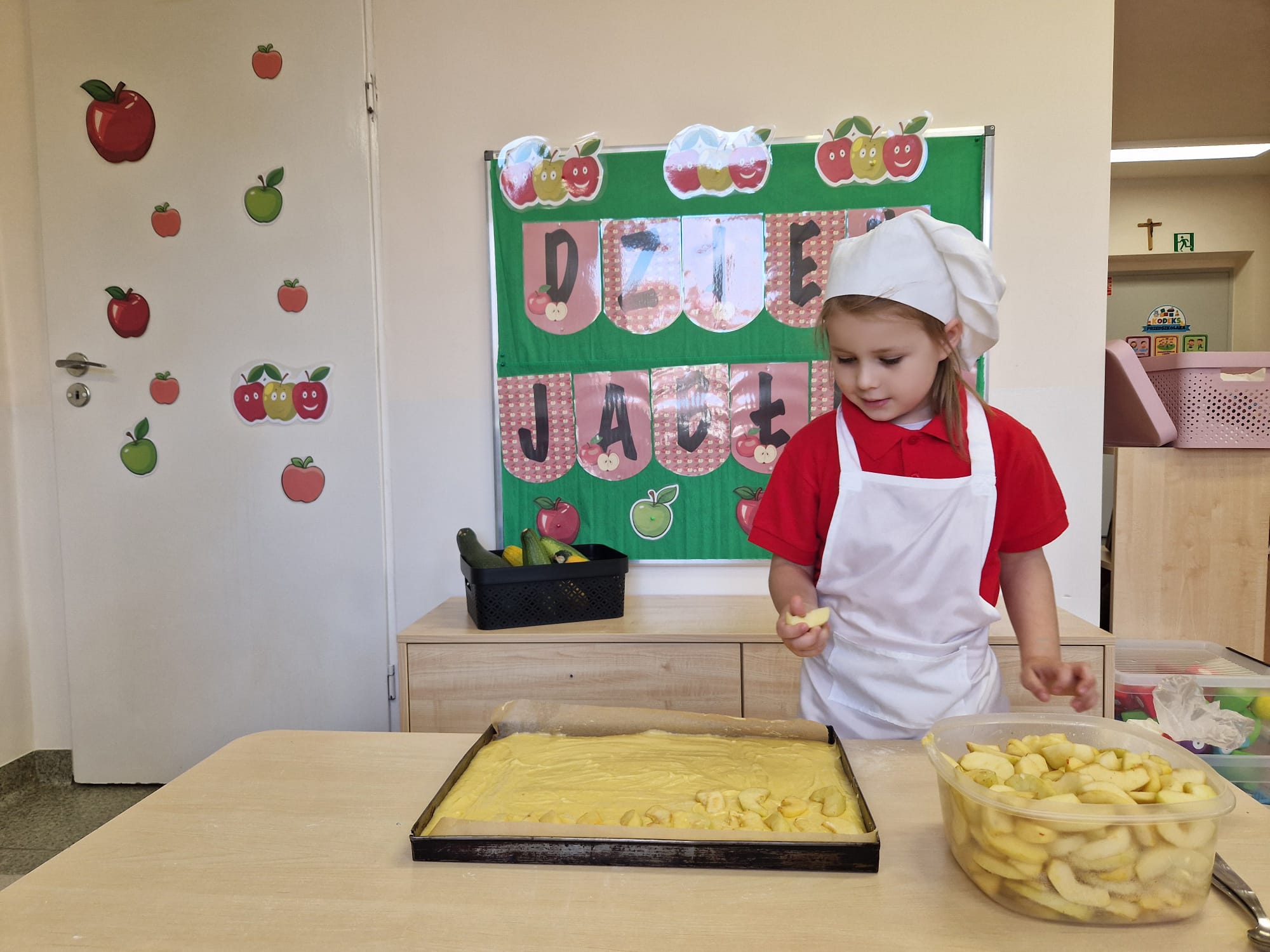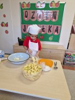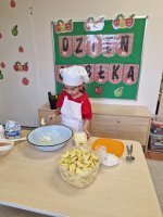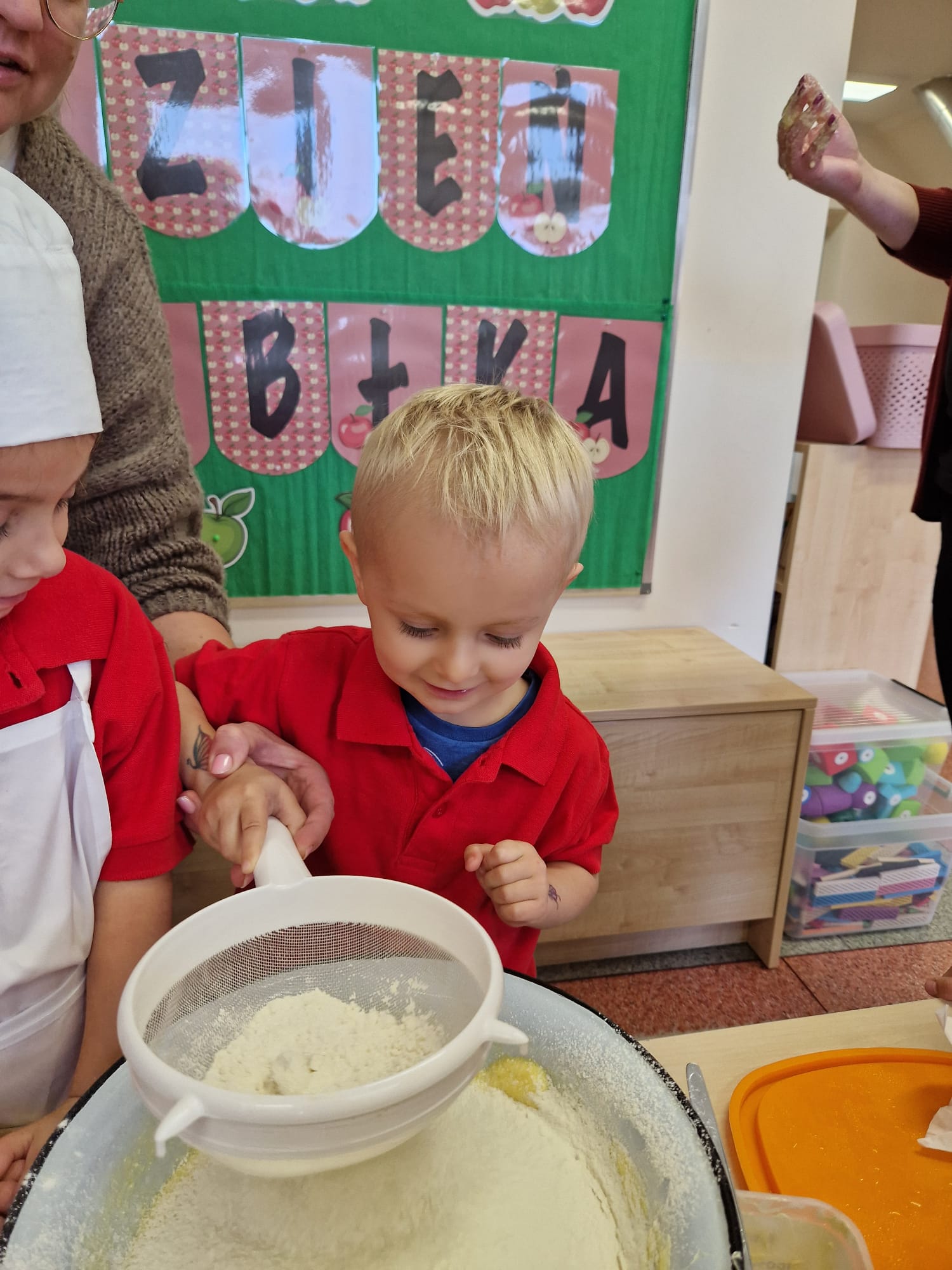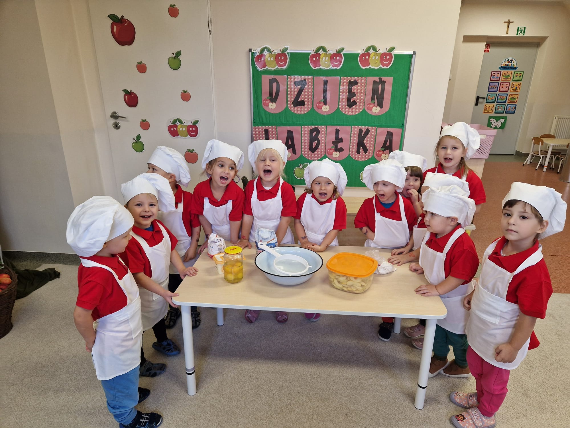 Najwięcej radości sprawiło nam pieczenie ciasta jabłkowego. Mali kucharze z zapałem obierali jabłka, mieszali składniki i z niecierpliwością czekali, aż w całym przedszkolu rozniesie się zapach świeżo upieczonego ciasta. Gdy ciasto było gotowe, wszyscy z apetytem zjedli swoje porcje – było pyszne!