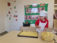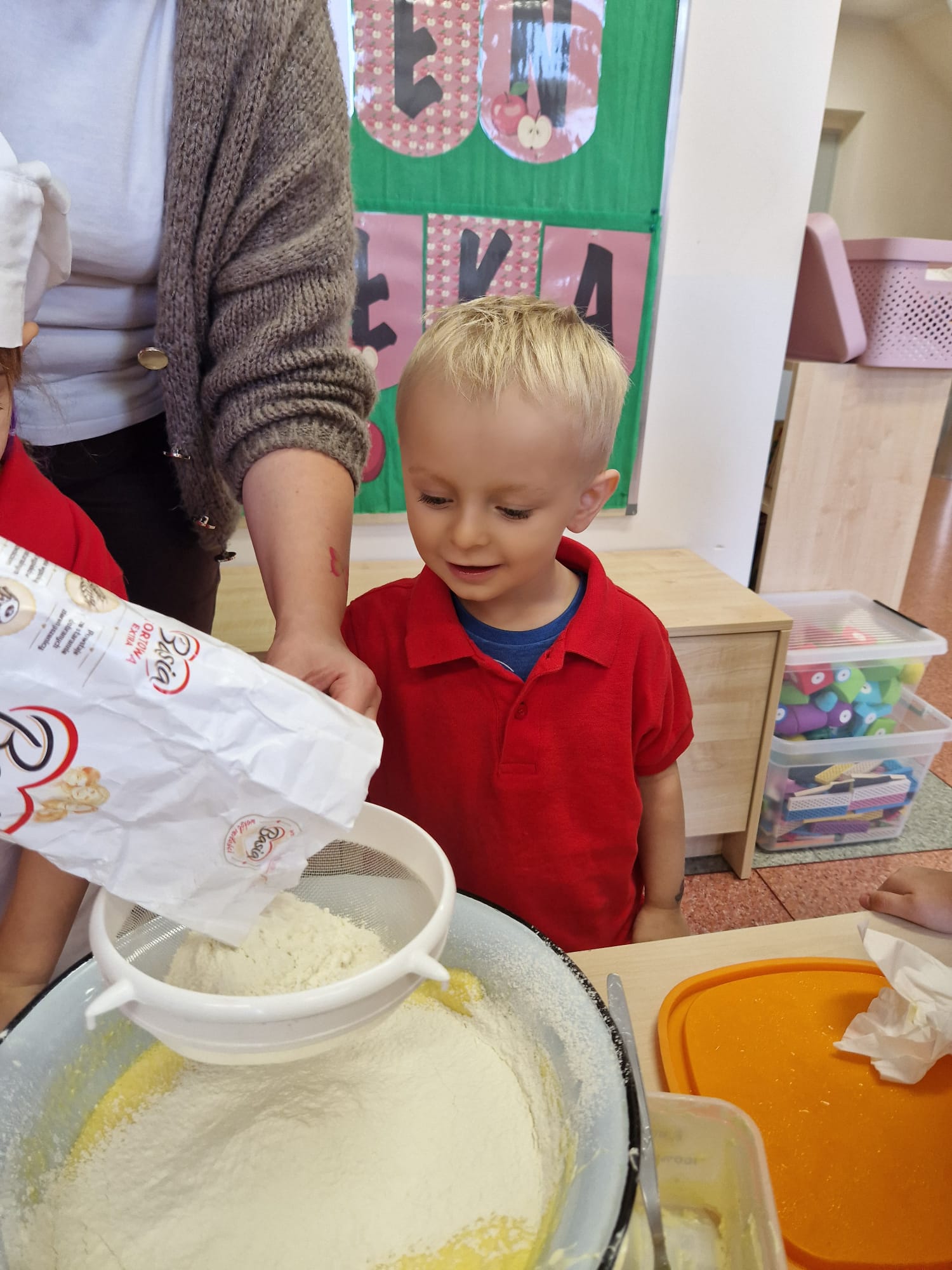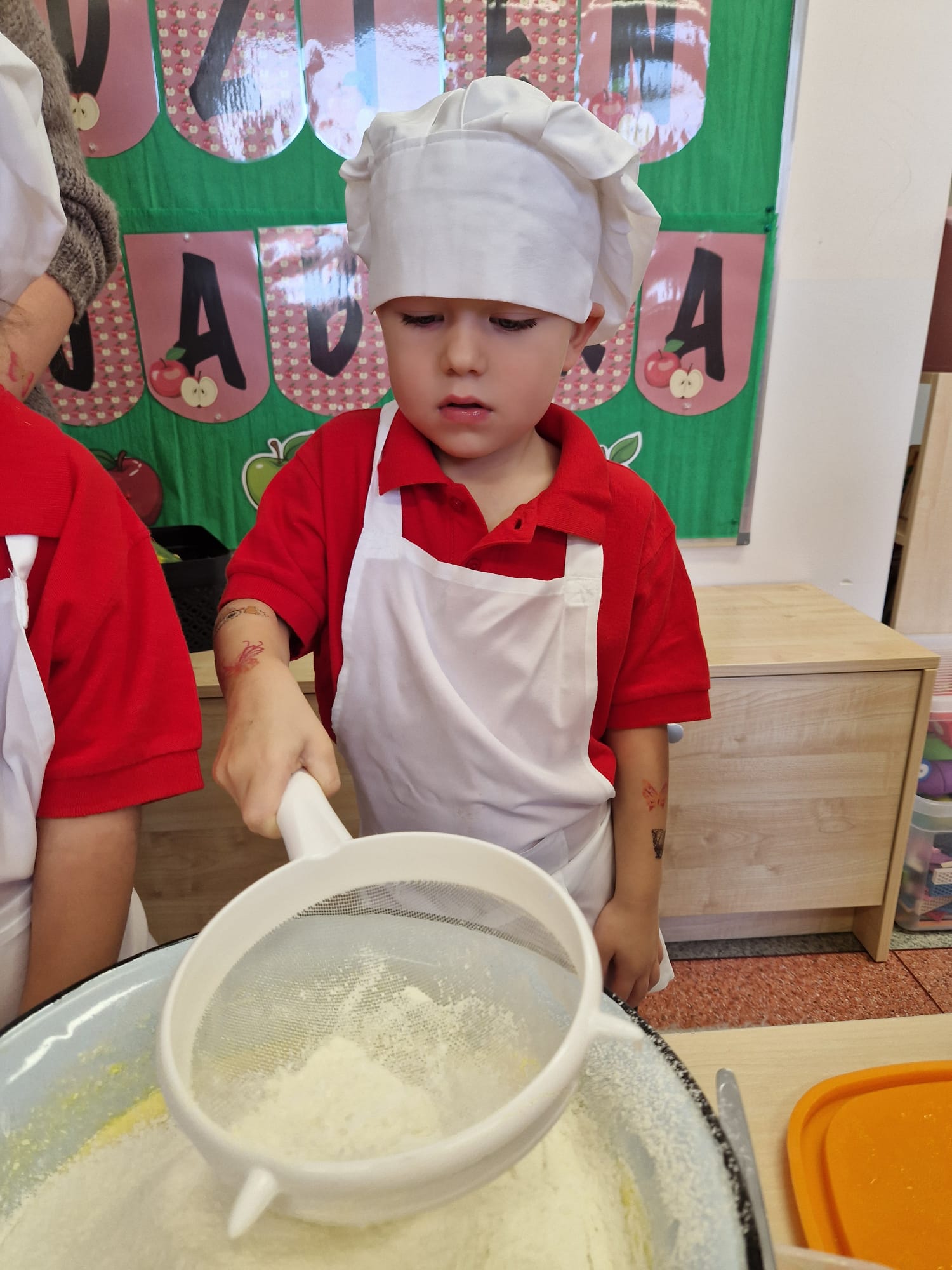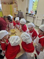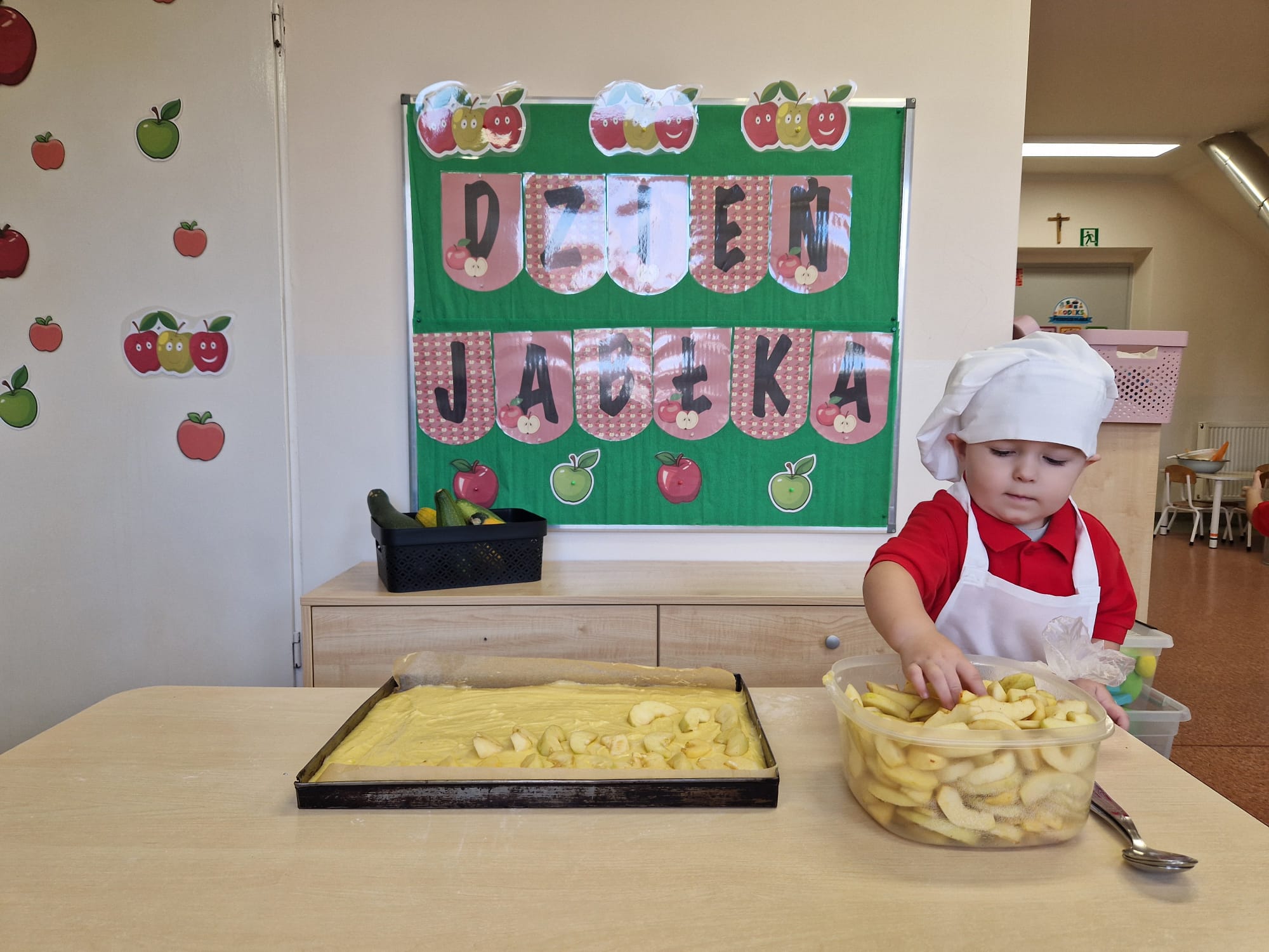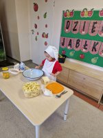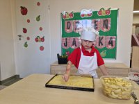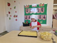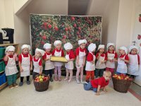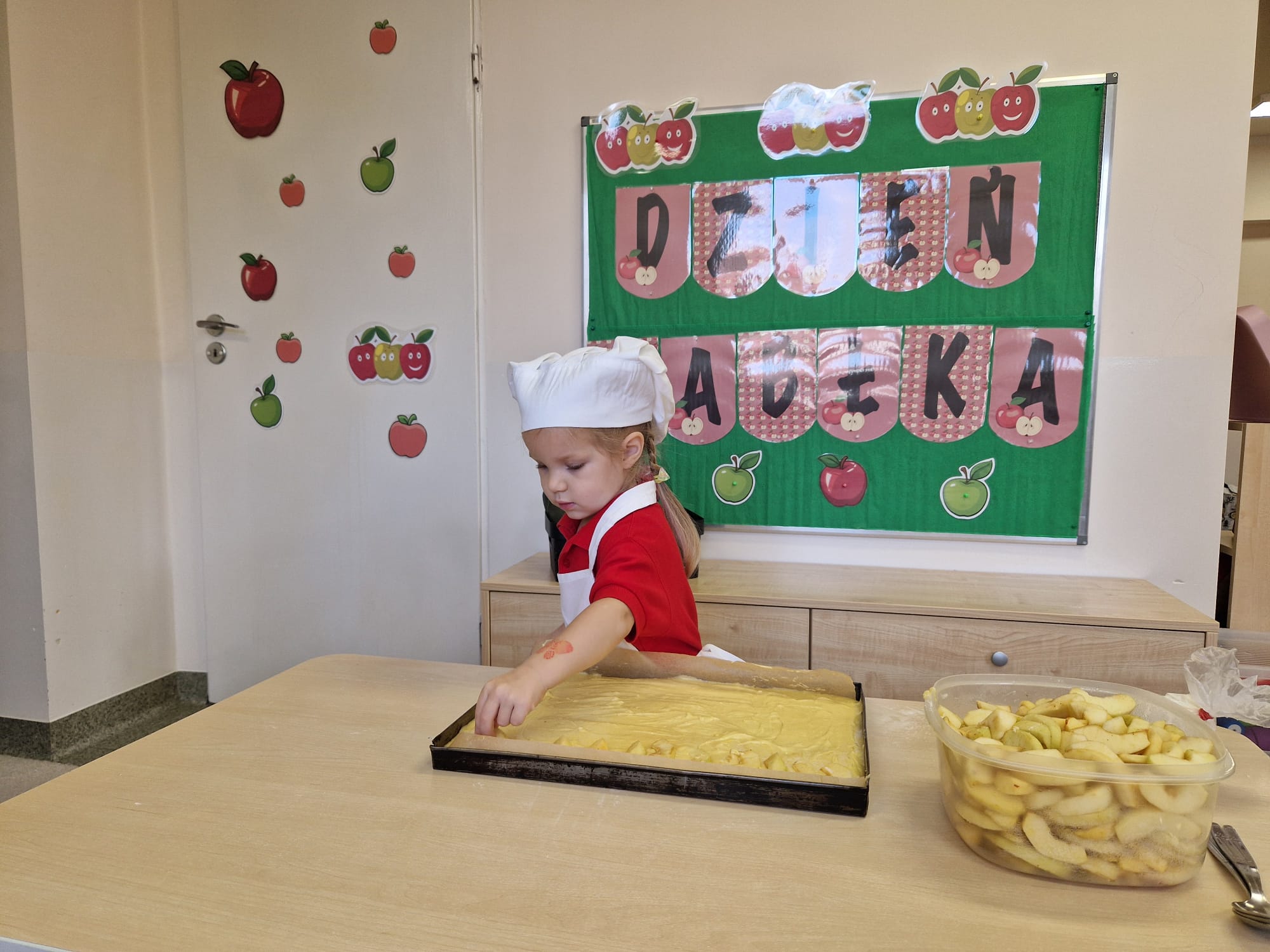 Najwięcej radości sprawiło nam pieczenie ciasta jabłkowego. Mali kucharze z zapałem obierali jabłka, mieszali składniki i z niecierpliwością czekali, aż w całym przedszkolu rozniesie się zapach świeżo upieczonego ciasta. Gdy ciasto było gotowe, wszyscy z apetytem zjedli swoje porcje – było pyszne!