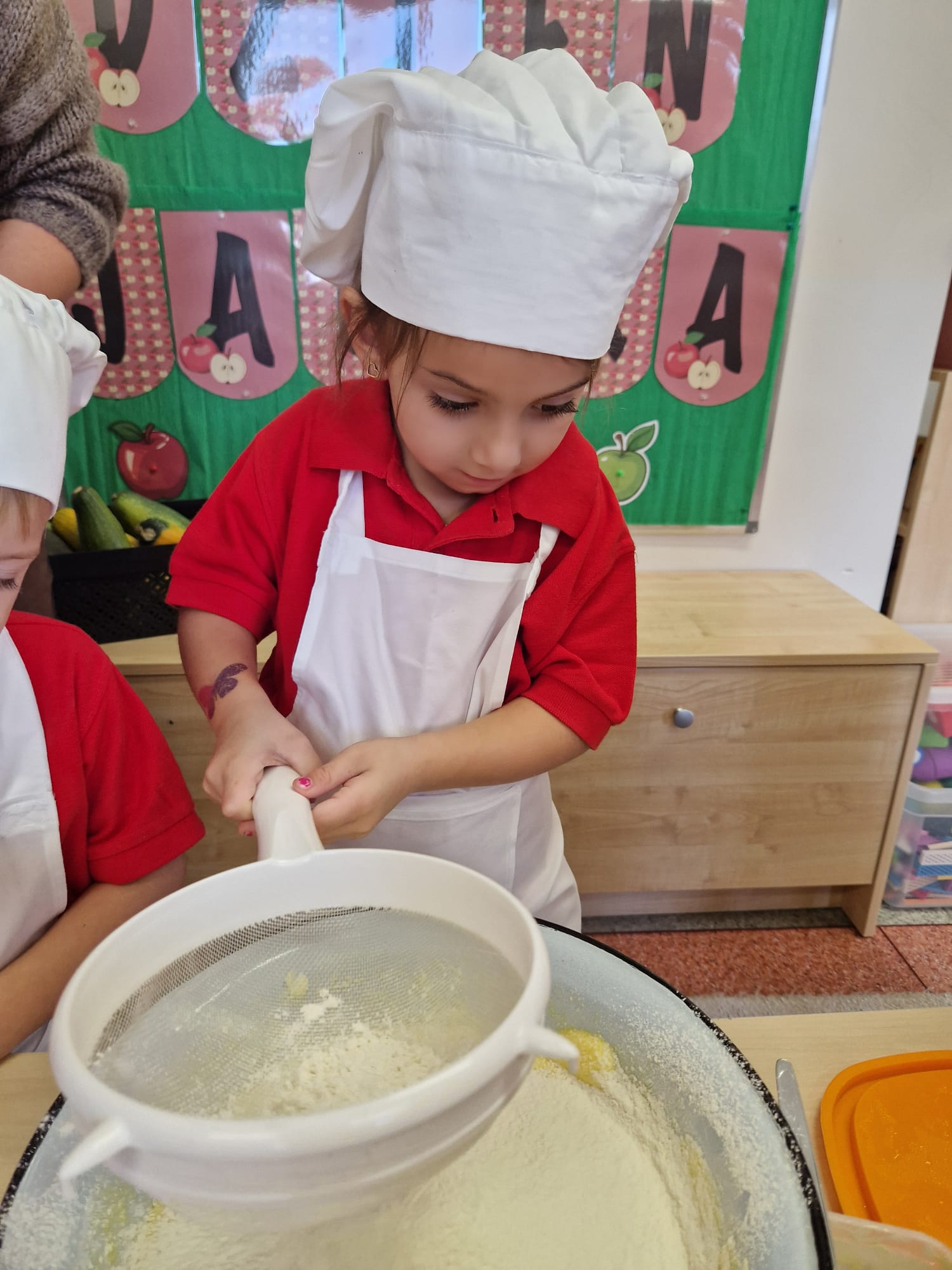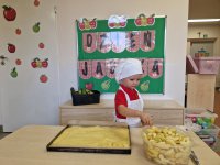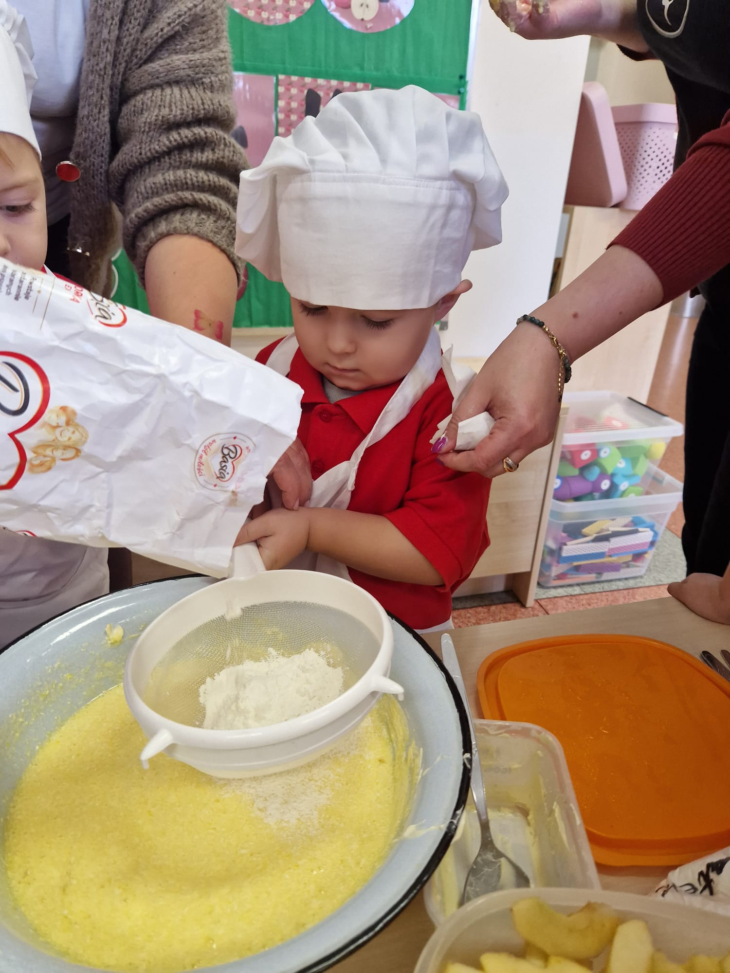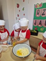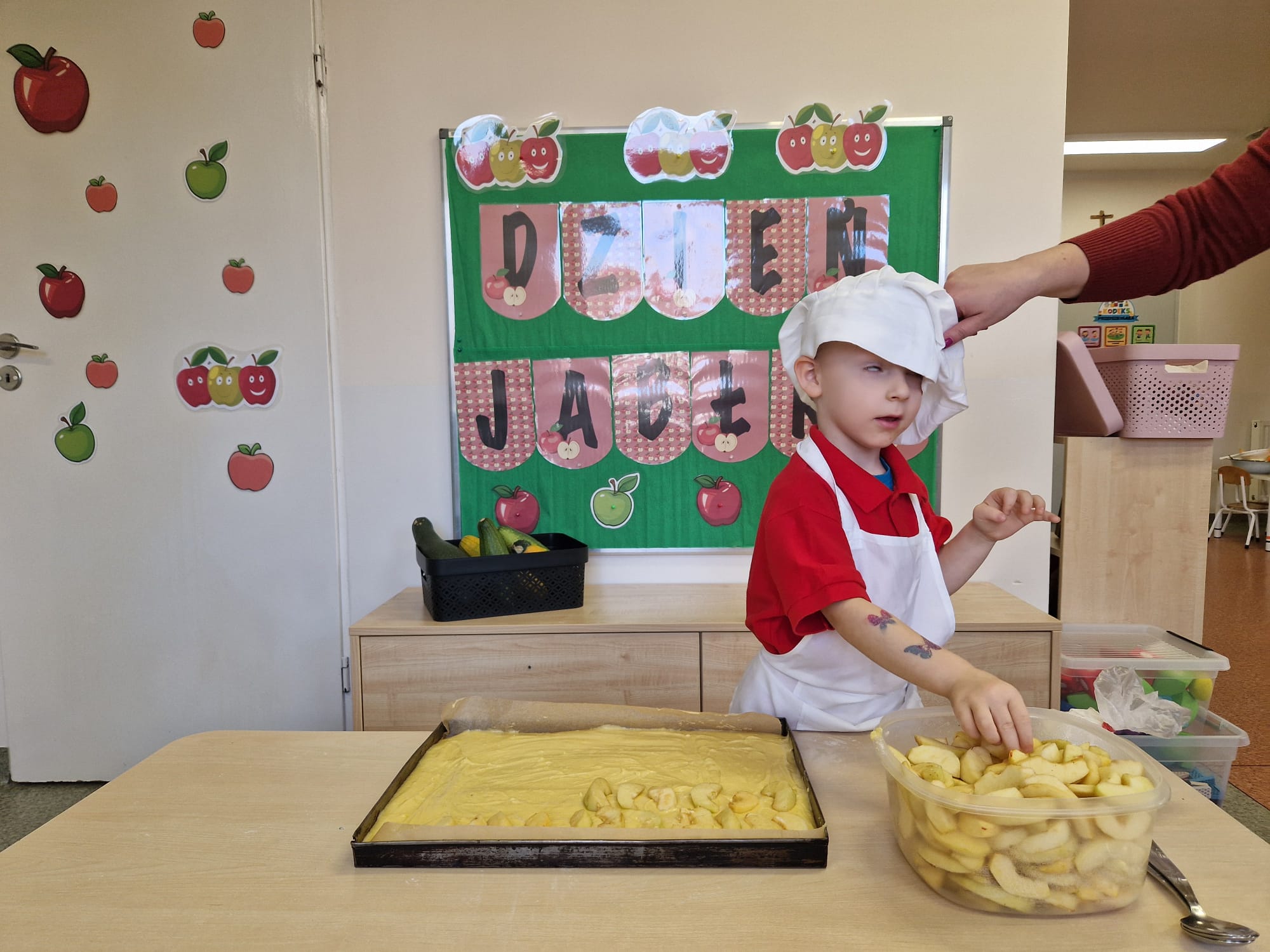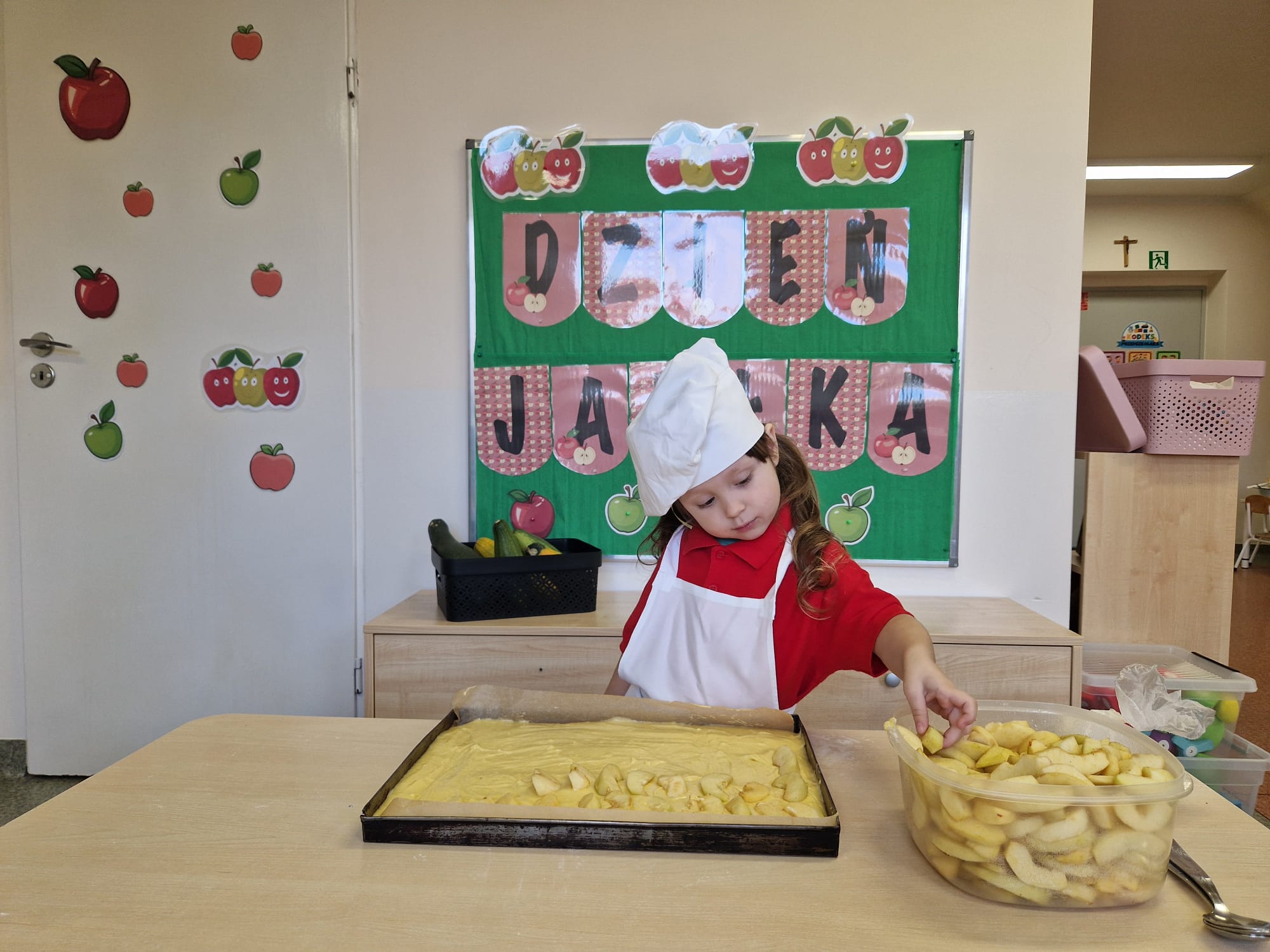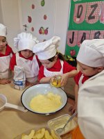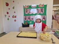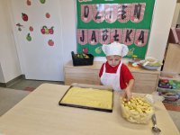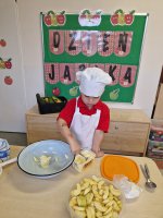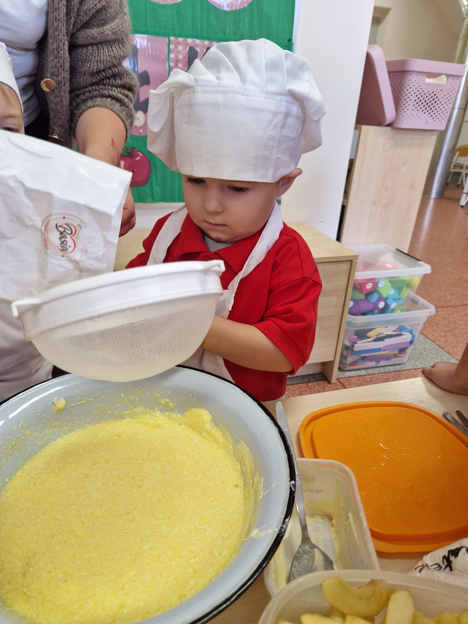 Najwięcej radości sprawiło nam pieczenie ciasta jabłkowego. Mali kucharze z zapałem obierali jabłka, mieszali składniki i z niecierpliwością czekali, aż w całym przedszkolu rozniesie się zapach świeżo upieczonego ciasta. Gdy ciasto było gotowe, wszyscy z apetytem zjedli swoje porcje – było pyszne!