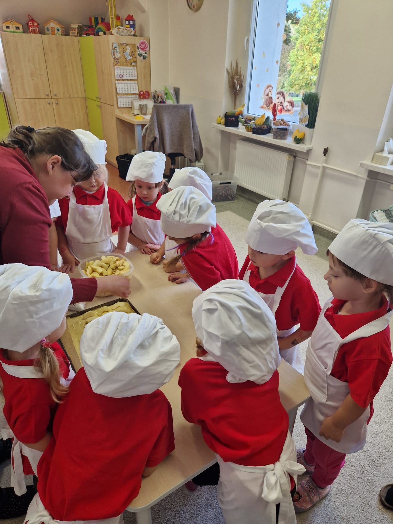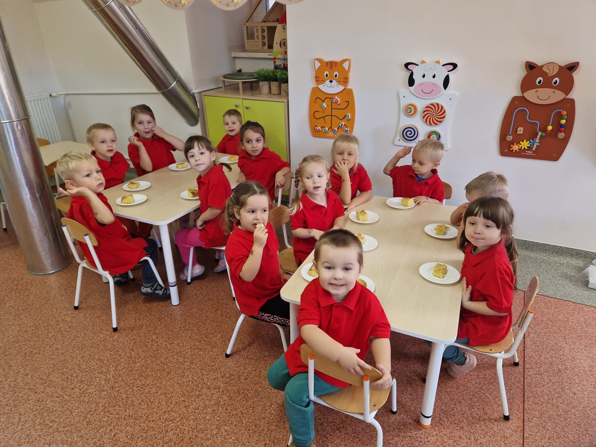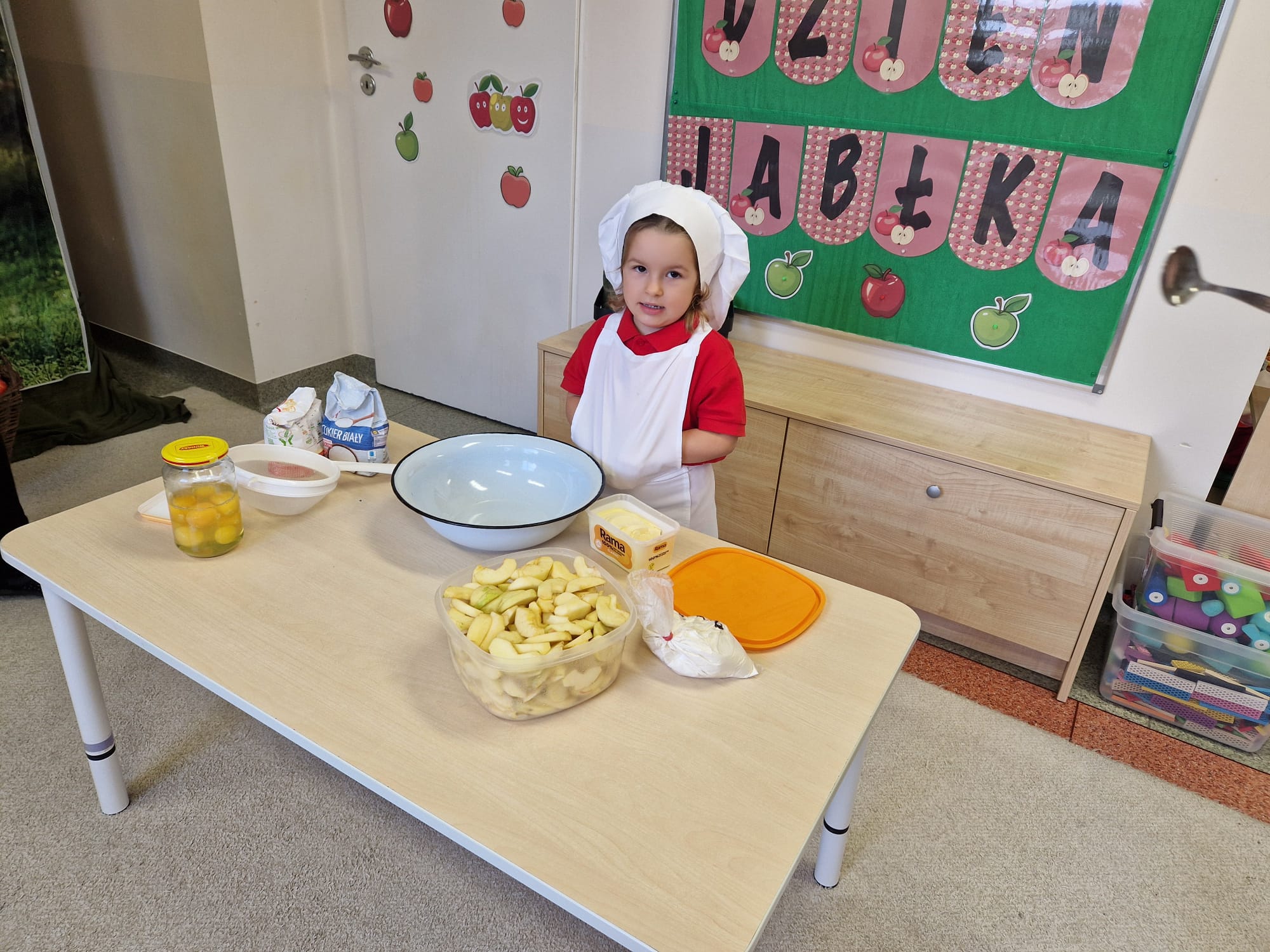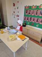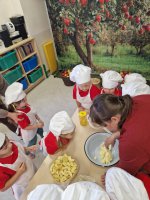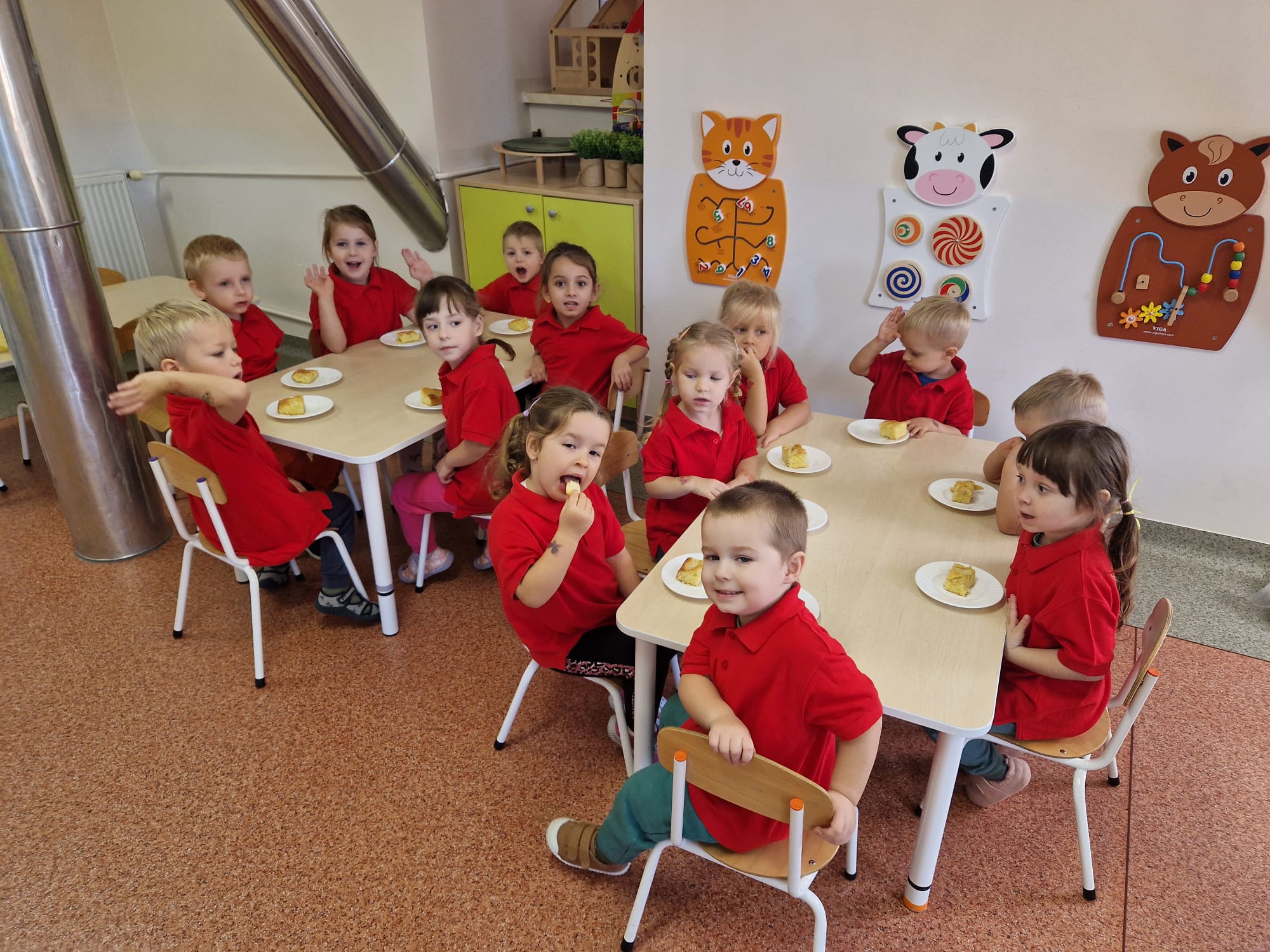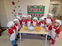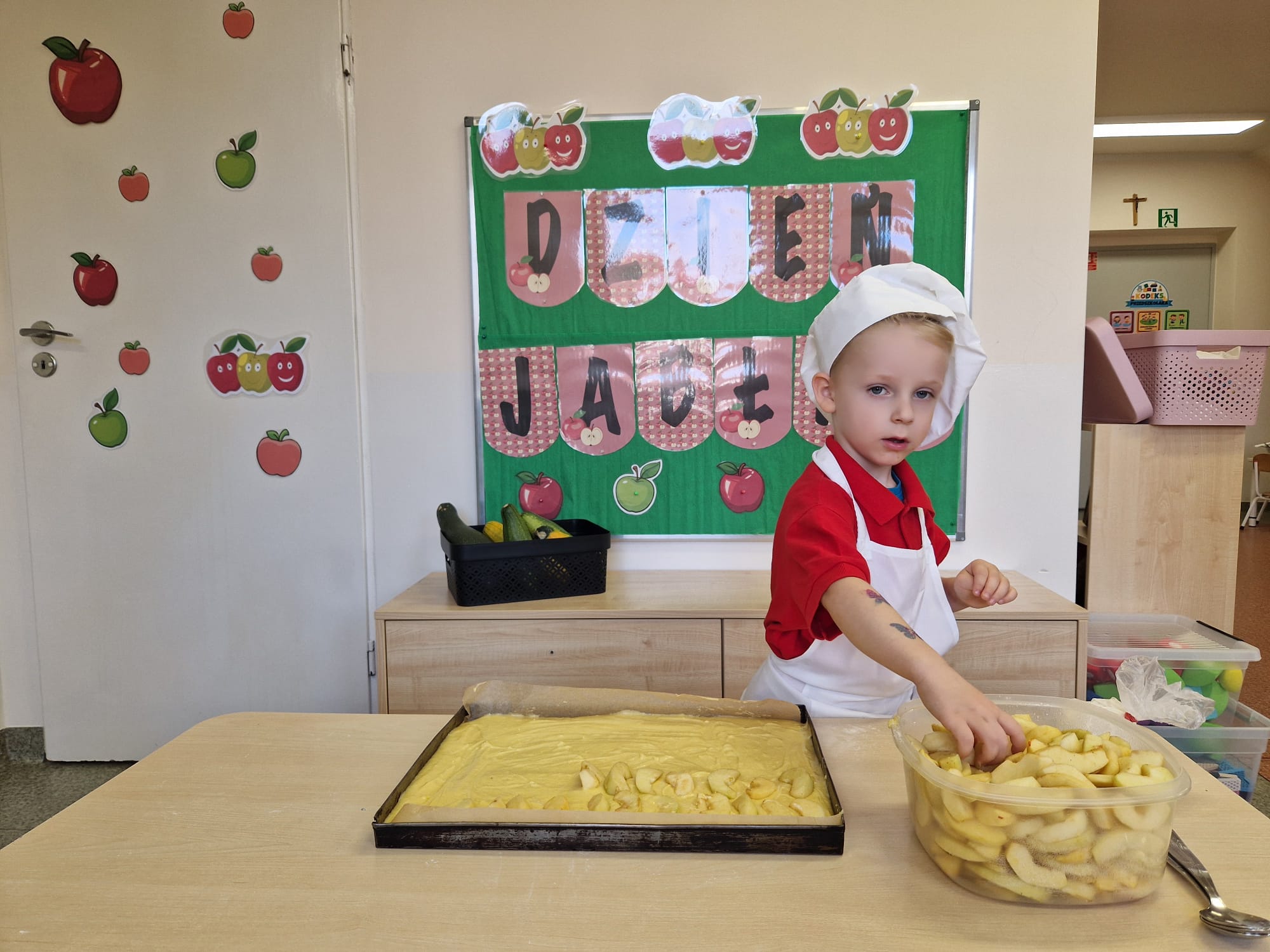 Najwięcej radości sprawiło nam pieczenie ciasta jabłkowego. Mali kucharze z zapałem obierali jabłka, mieszali składniki i z niecierpliwością czekali, aż w całym przedszkolu rozniesie się zapach świeżo upieczonego ciasta. Gdy ciasto było gotowe, wszyscy z apetytem zjedli swoje porcje – było pyszne!