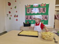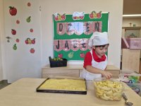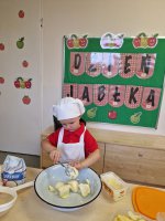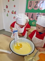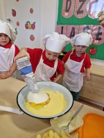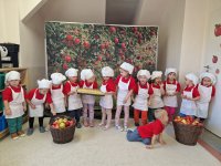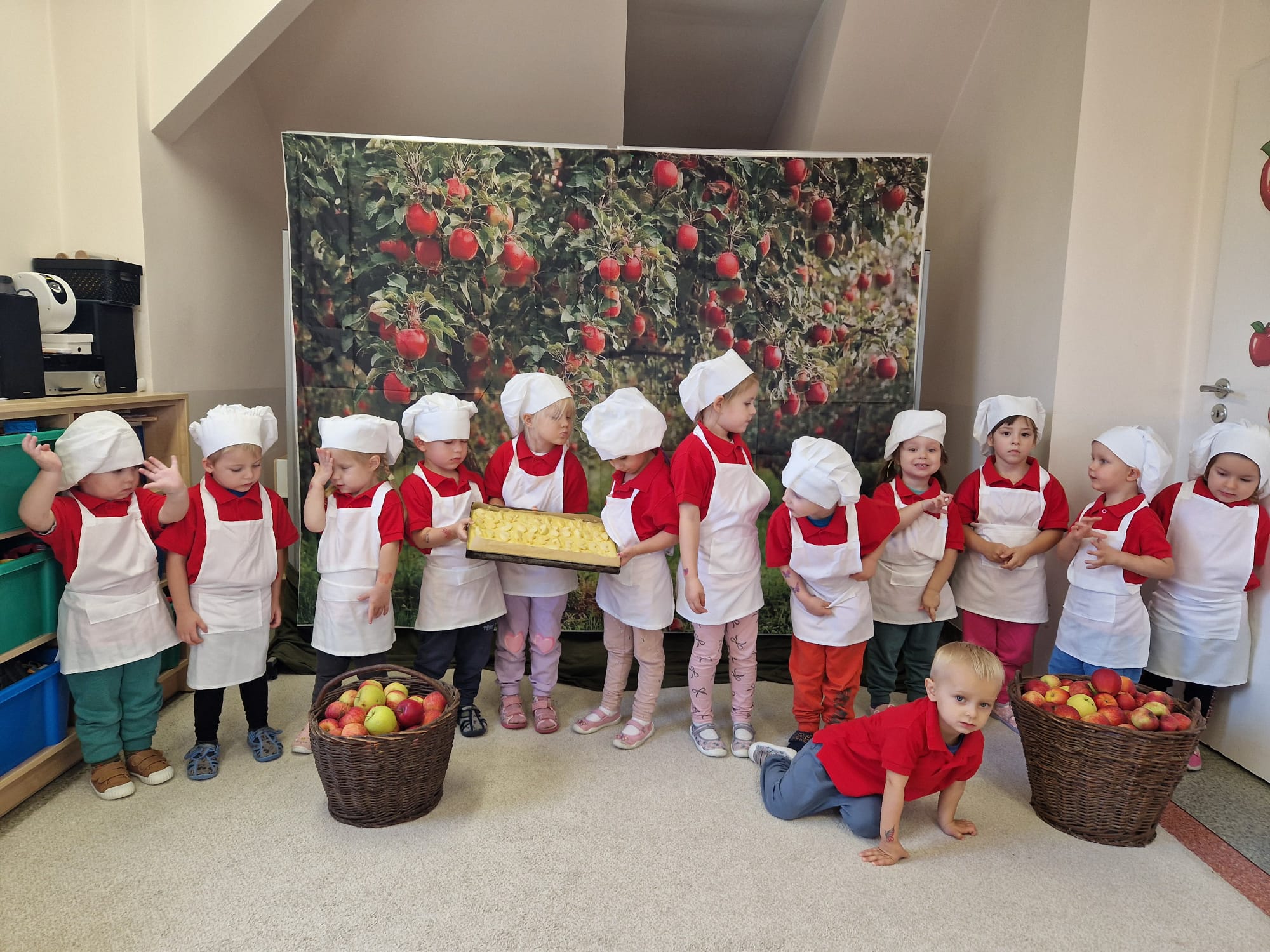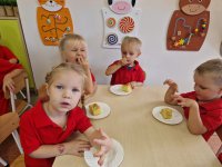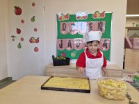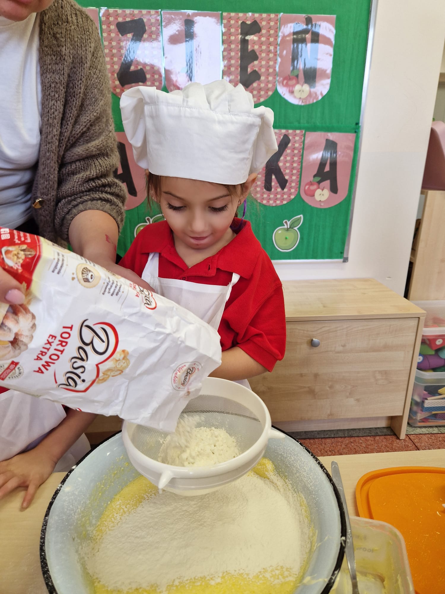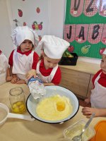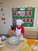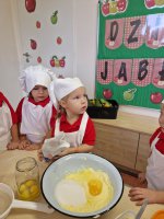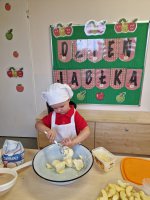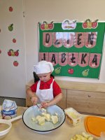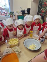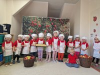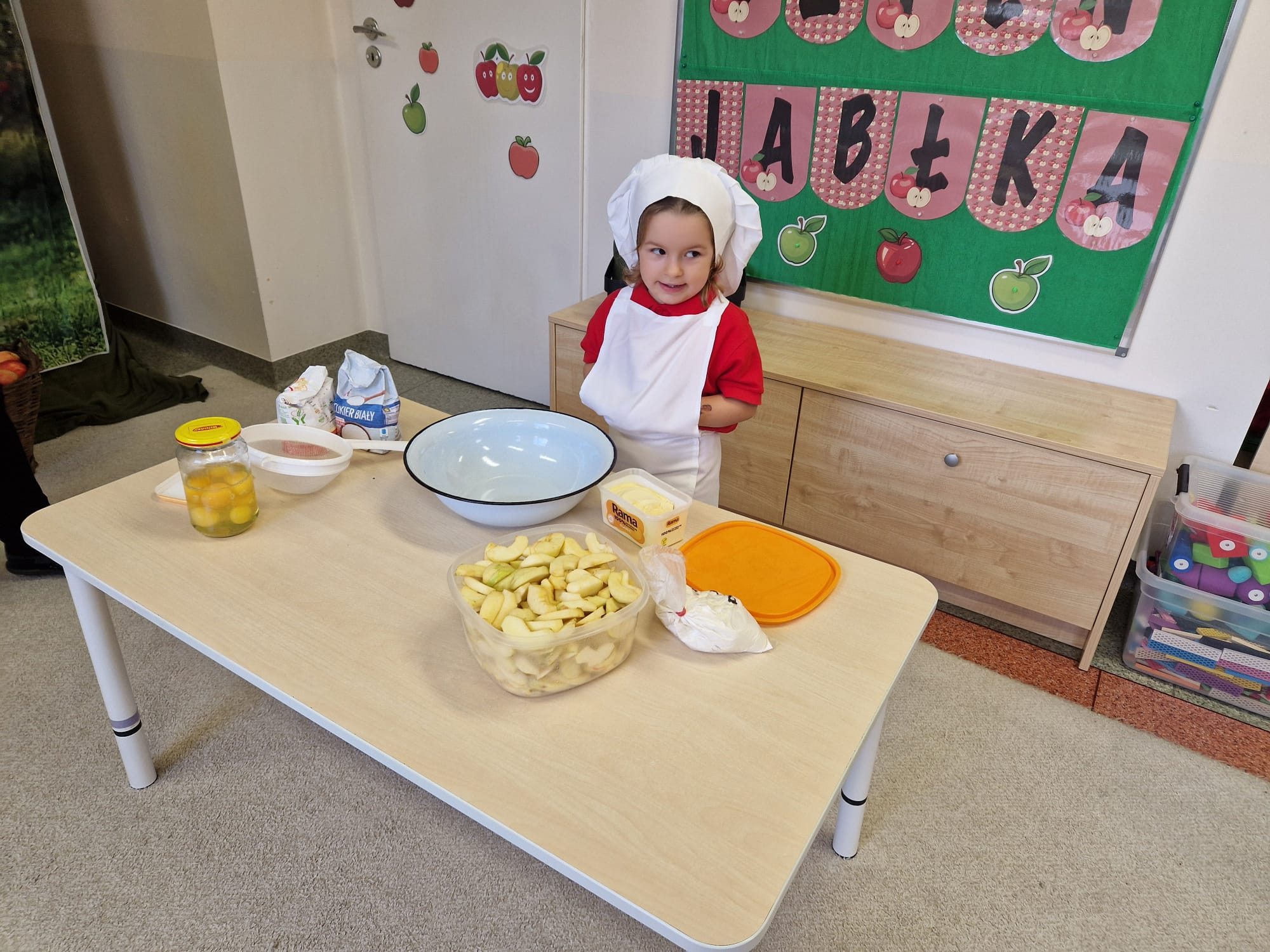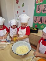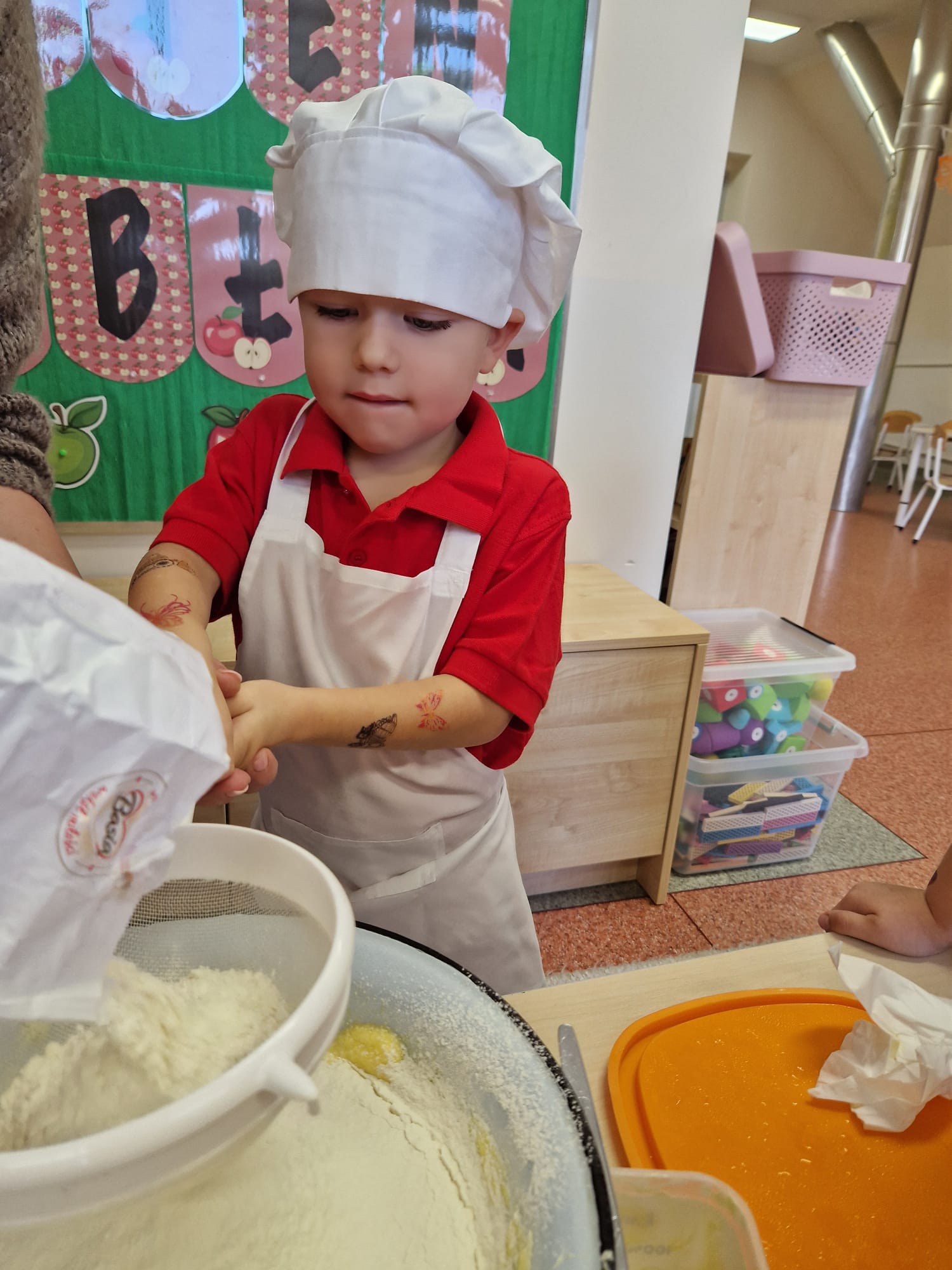 Najwięcej radości sprawiło nam pieczenie ciasta jabłkowego. Mali kucharze z zapałem obierali jabłka, mieszali składniki i z niecierpliwością czekali, aż w całym przedszkolu rozniesie się zapach świeżo upieczonego ciasta. Gdy ciasto było gotowe, wszyscy z apetytem zjedli swoje porcje – było pyszne!