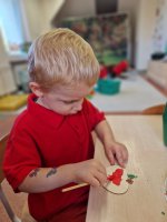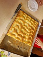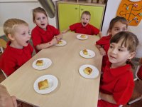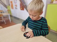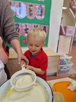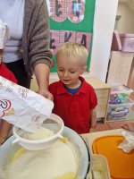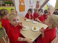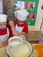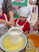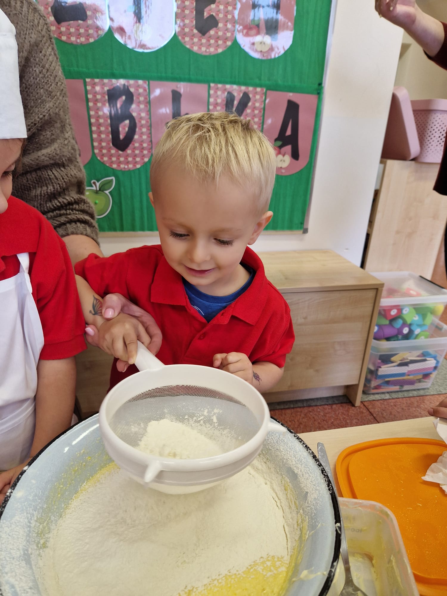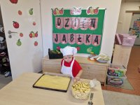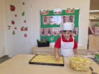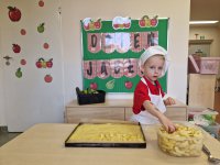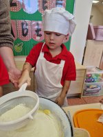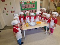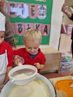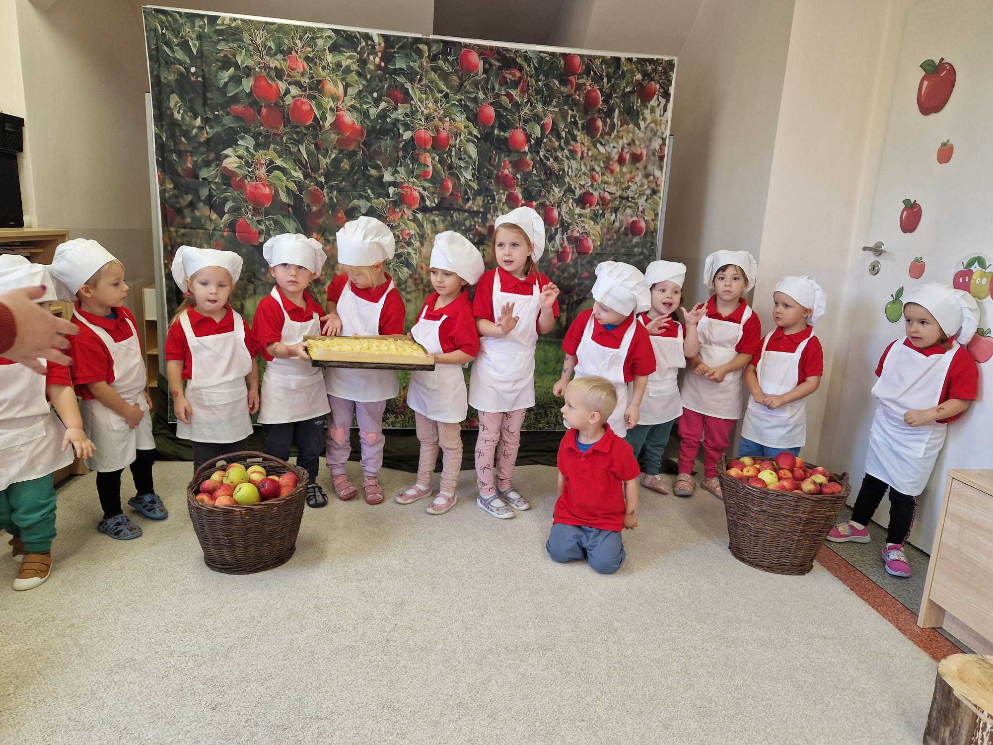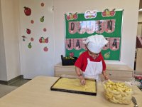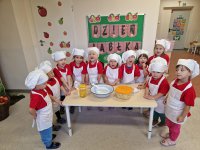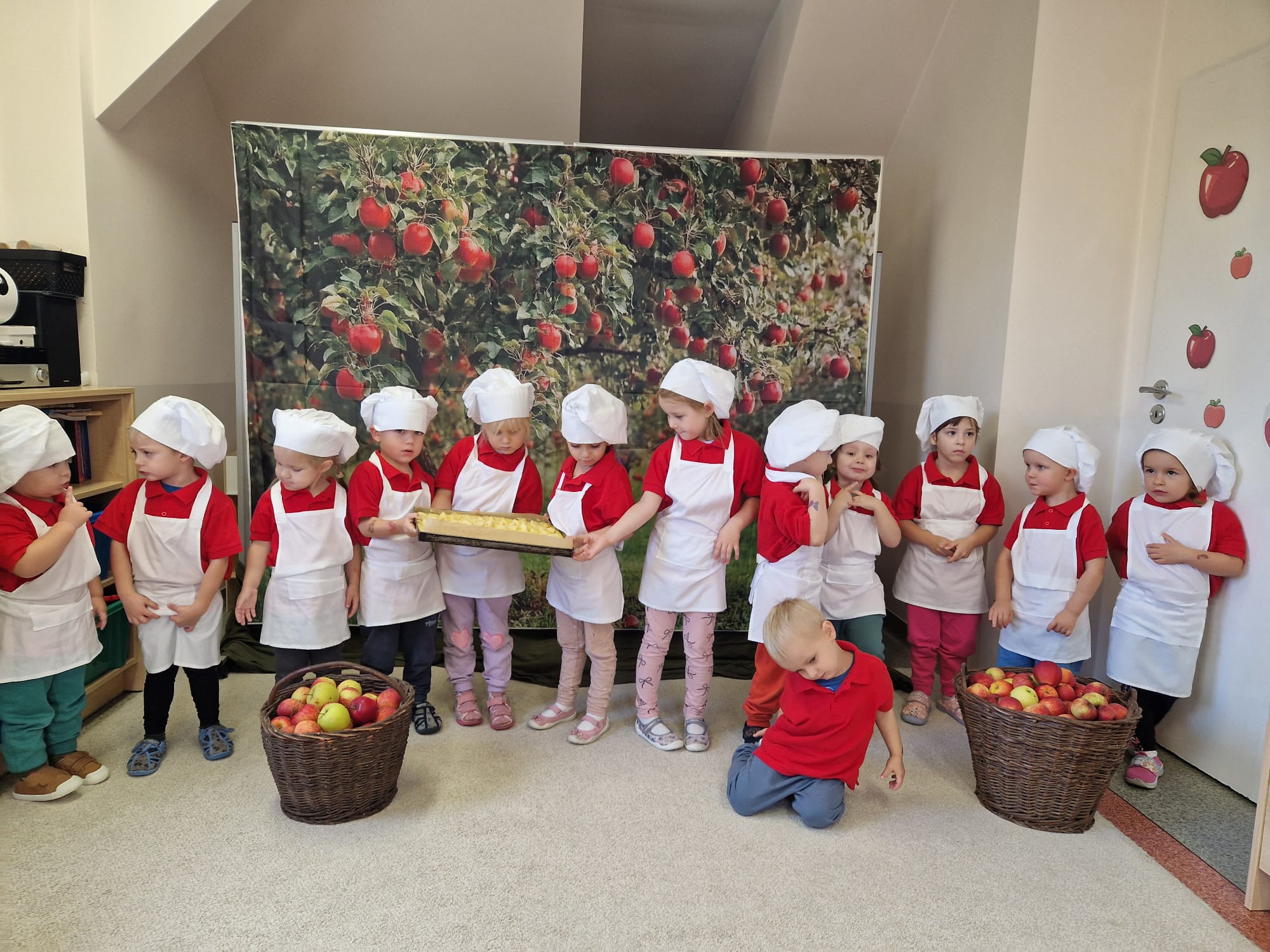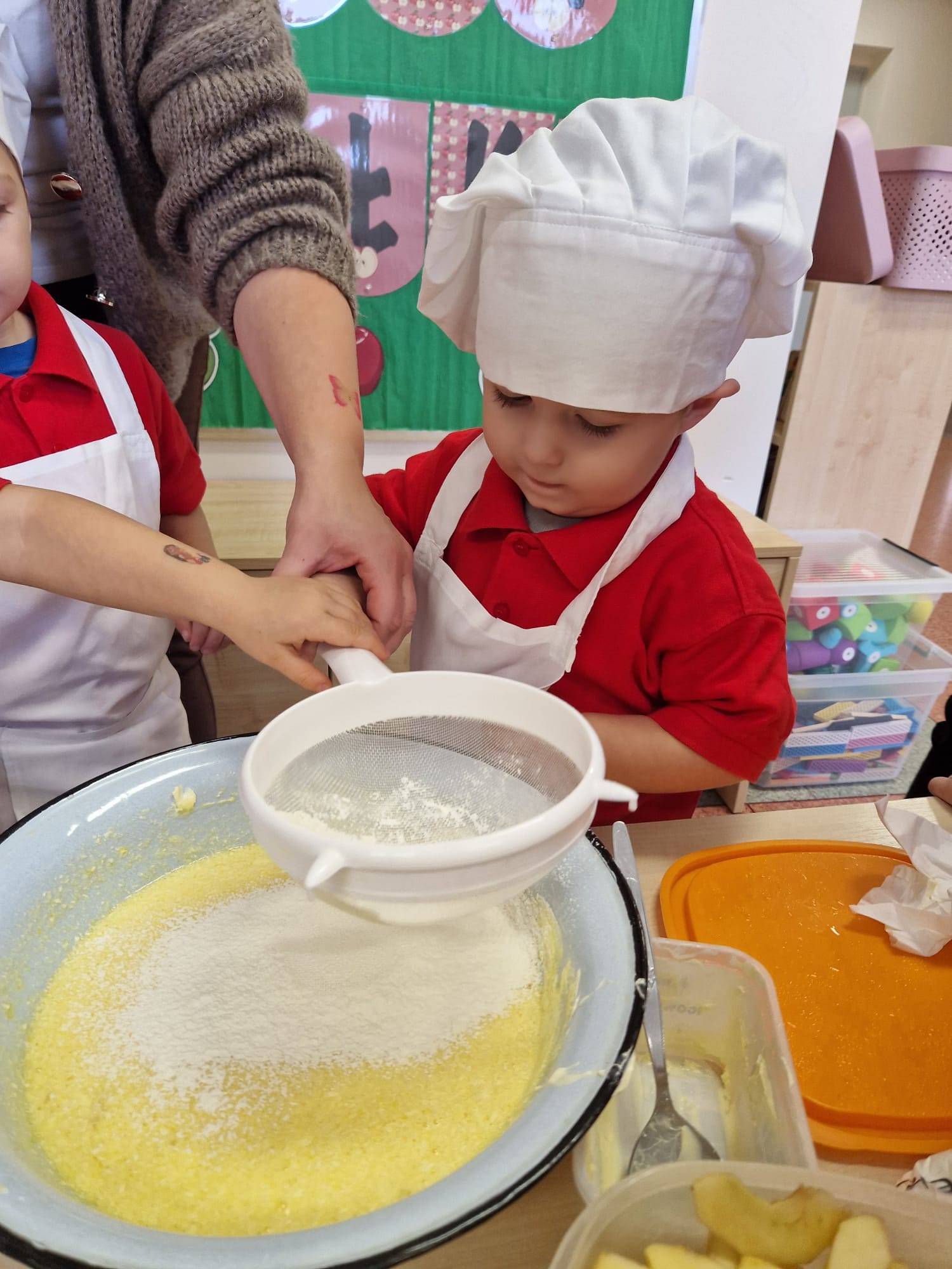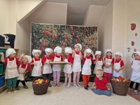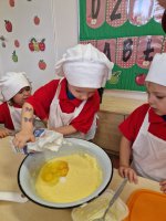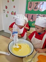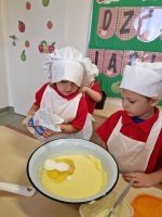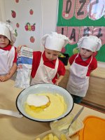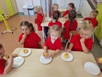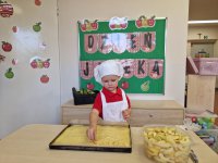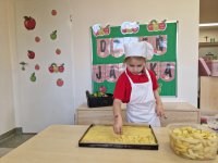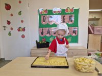 Najwięcej radości sprawiło nam pieczenie ciasta jabłkowego. Mali kucharze z zapałem obierali jabłka, mieszali składniki i z niecierpliwością czekali, aż w całym przedszkolu rozniesie się zapach świeżo upieczonego ciasta. Gdy ciasto było gotowe, wszyscy z apetytem zjedli swoje porcje – było pyszne!