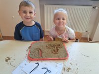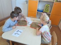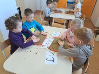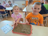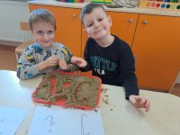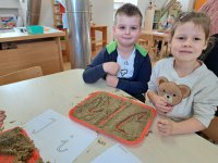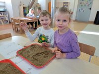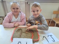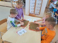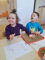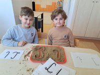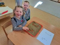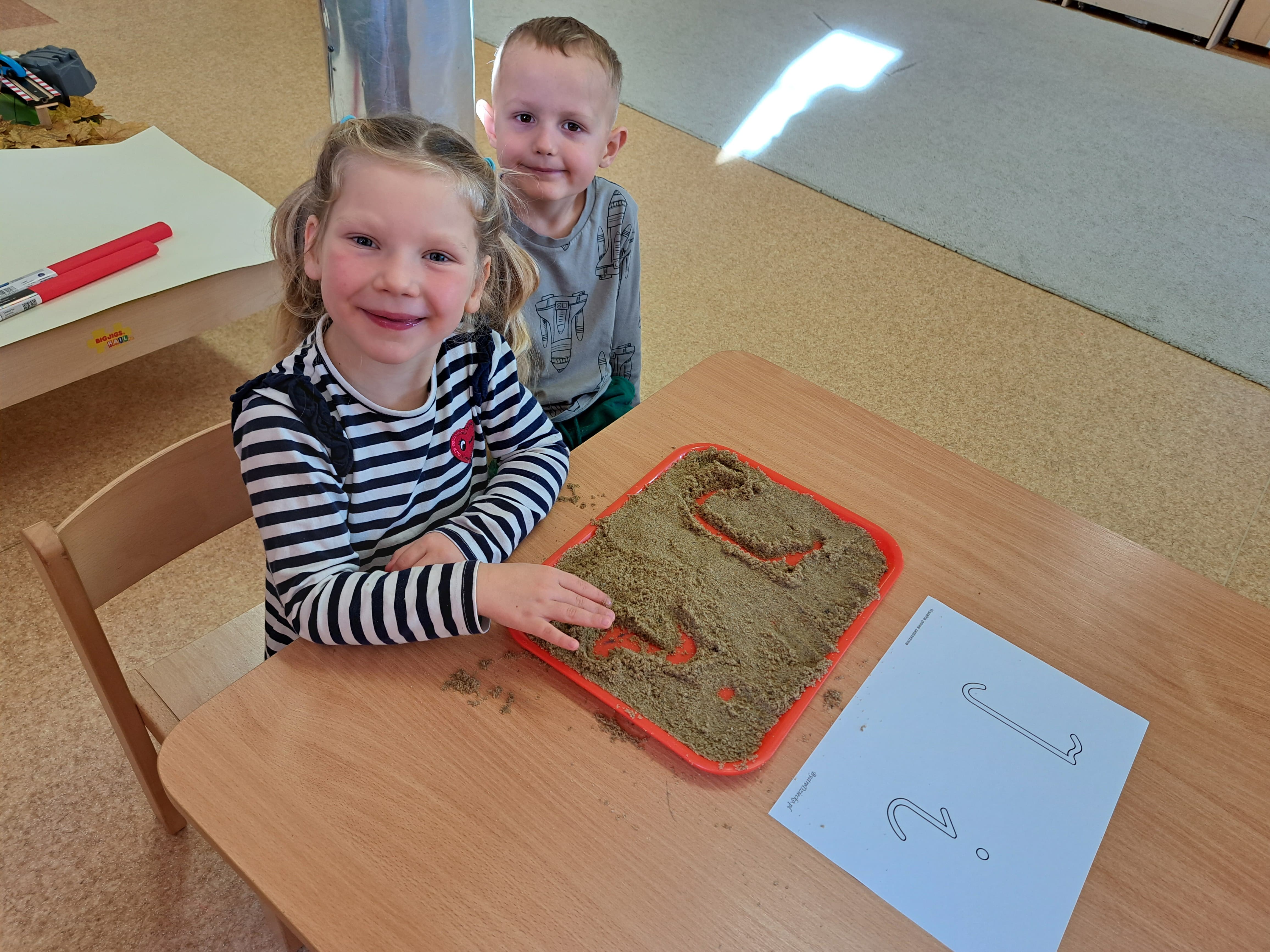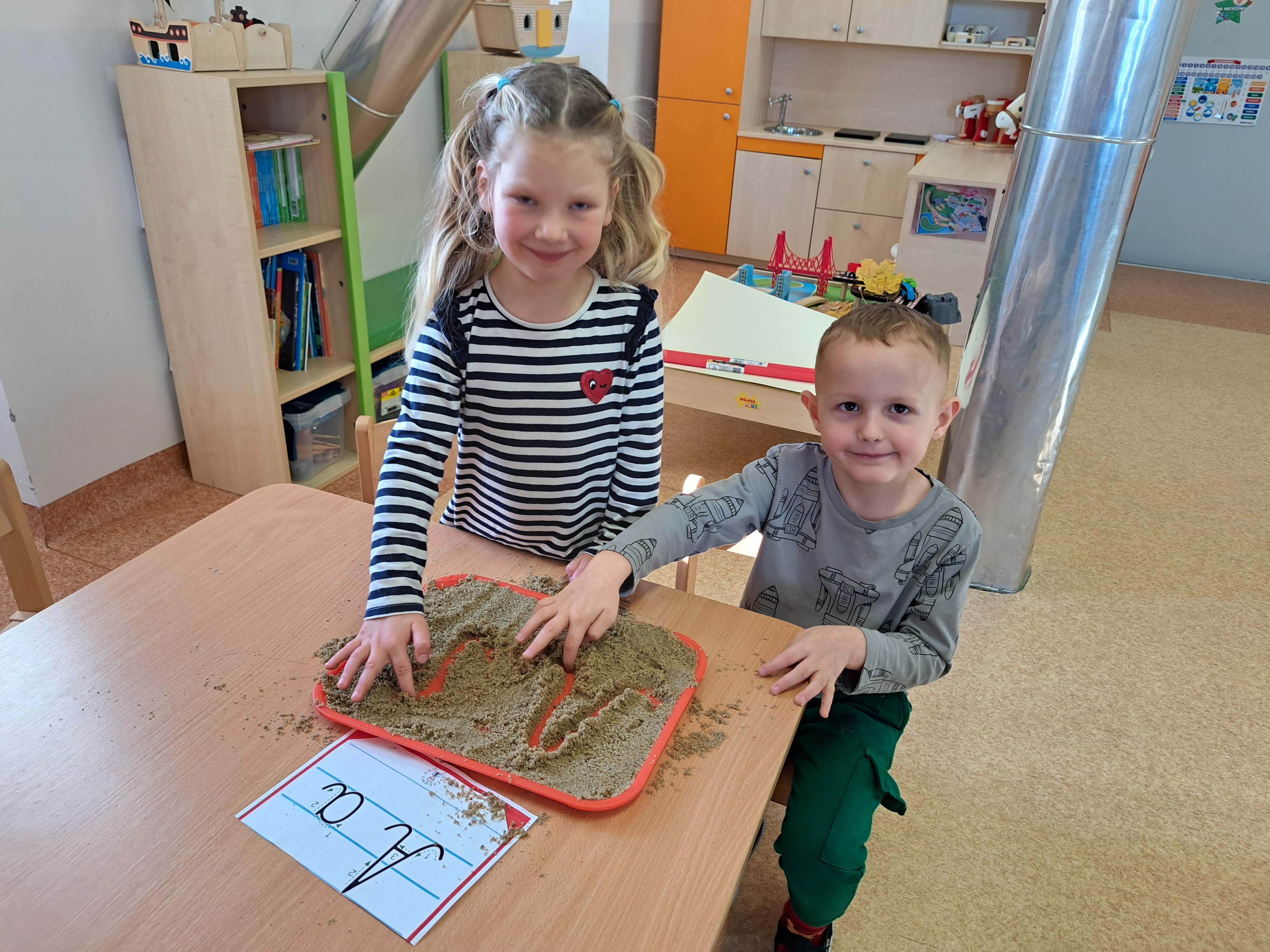 Podczas zajęć przedszkolaki wyszukiwały litery w swoich imionach, dopasowywały je do ilustracji, układały wyrazy z ruchomego alfabetu oraz próbowały zapisywać litery palcem na tackach z piaskiem.