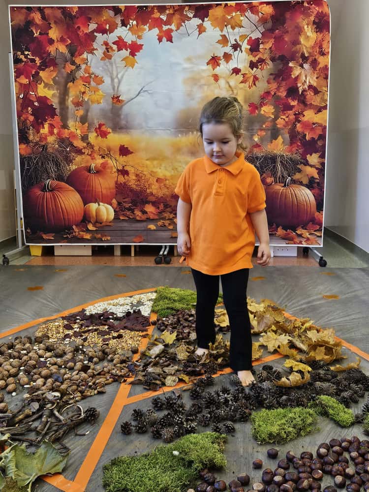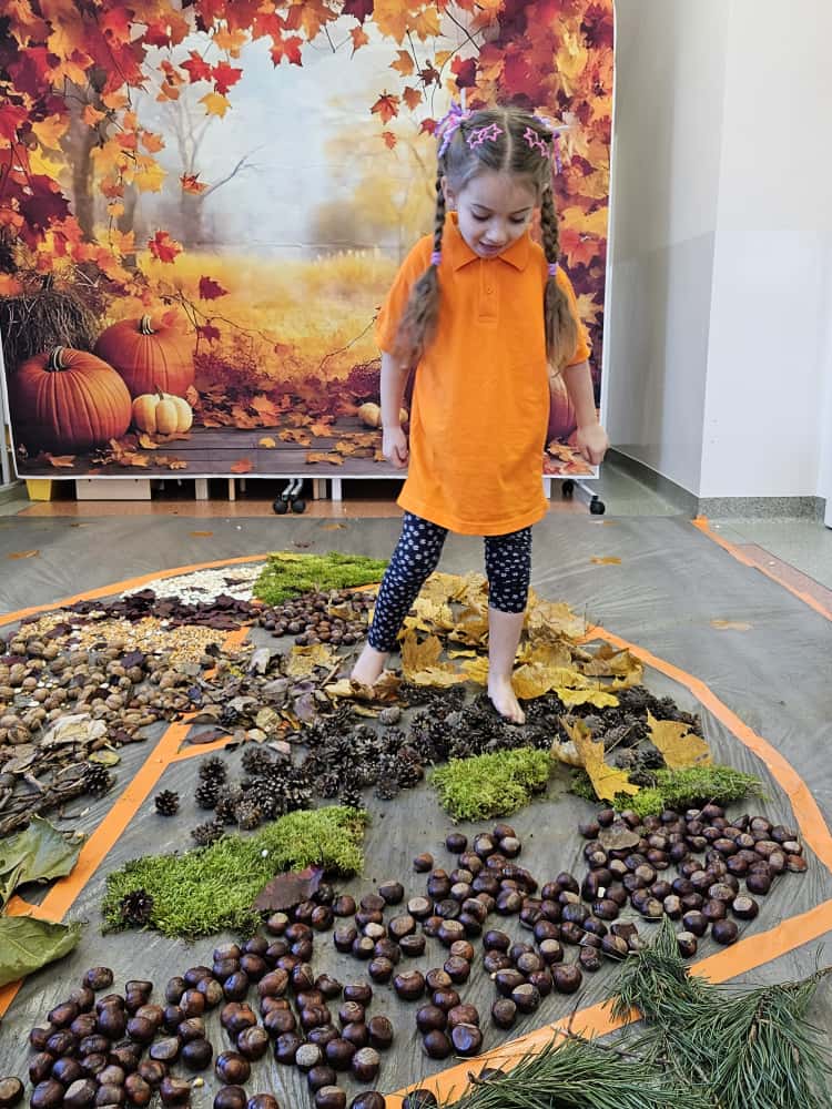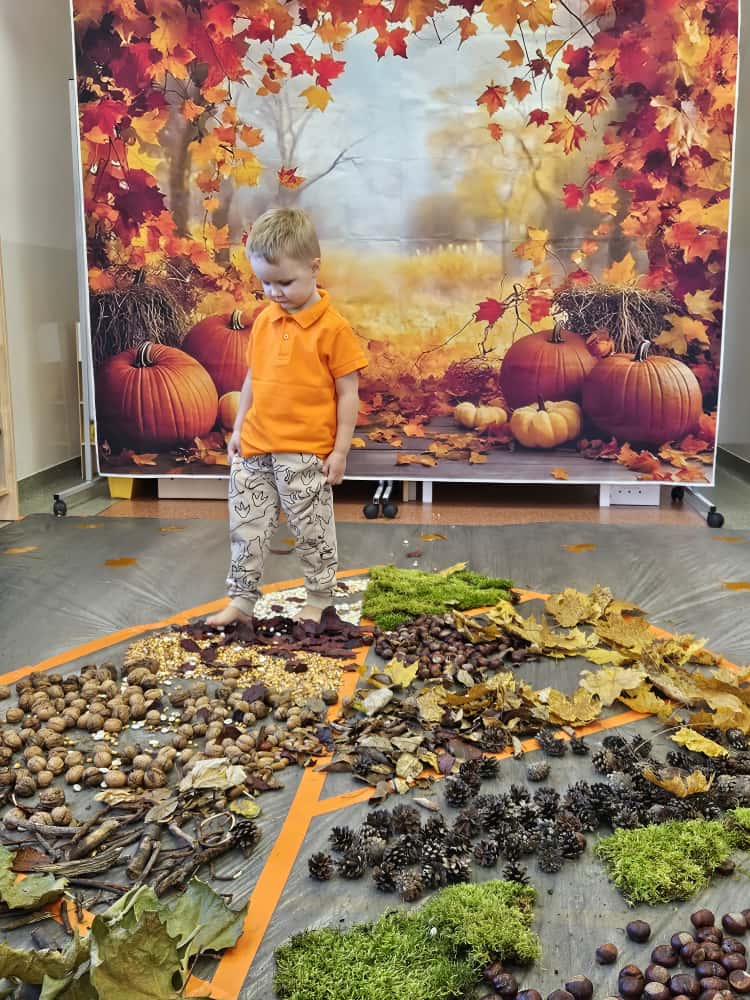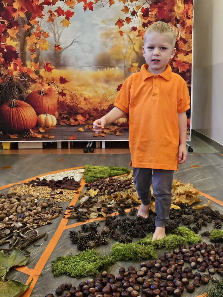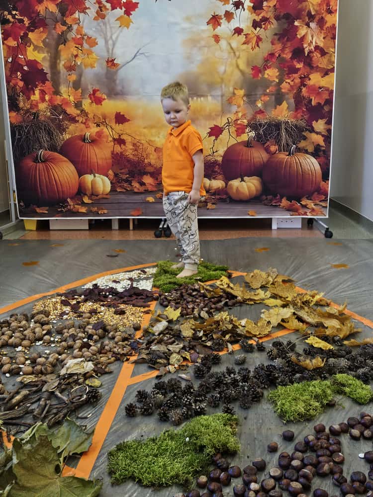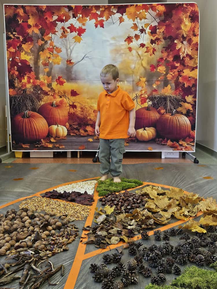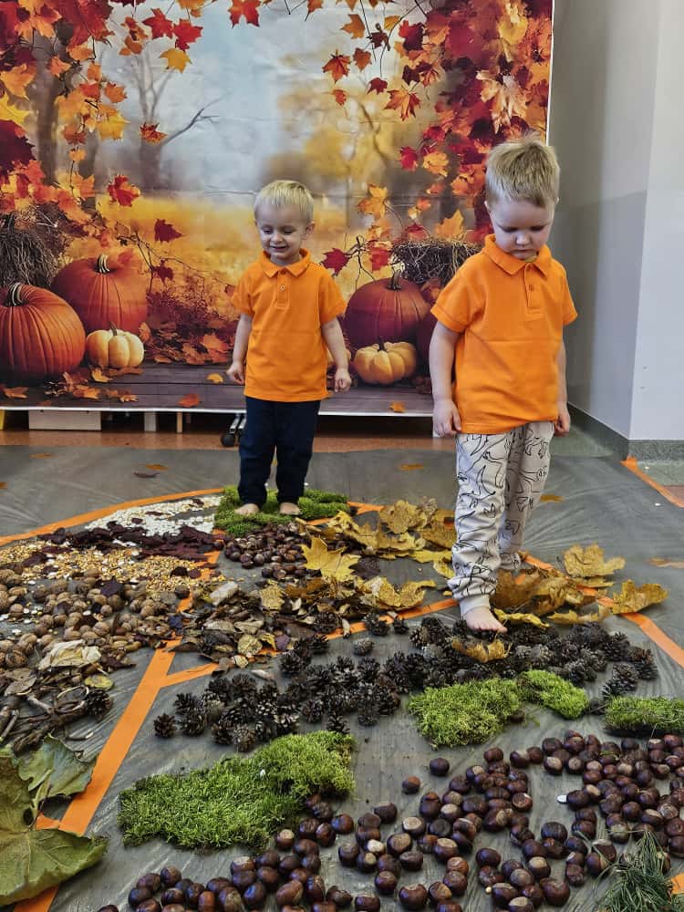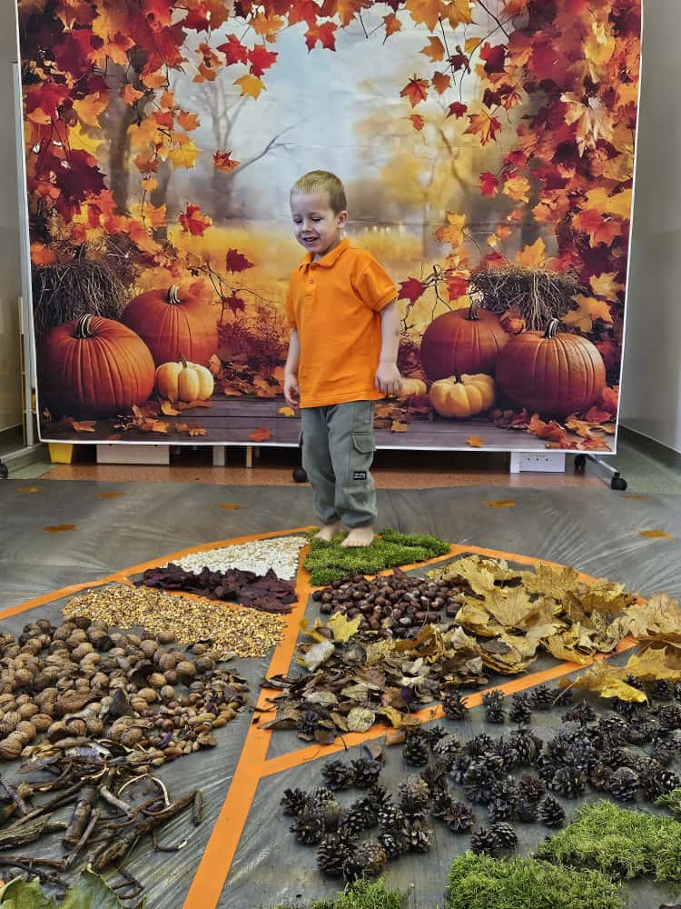 W naszym przedszkolu odbyły się wyjątkowe zajęcia sensoryczne o tematyce jesiennej. Dzieci z radością odkrywały uroki tej pięknej pory roku, uczestnicząc w tworzeniu jesiennej ścieżki sensorycznej z naturalnych darów przyrody — liści, kasztanów, szyszek, żołędzi, orzechów i mchu.