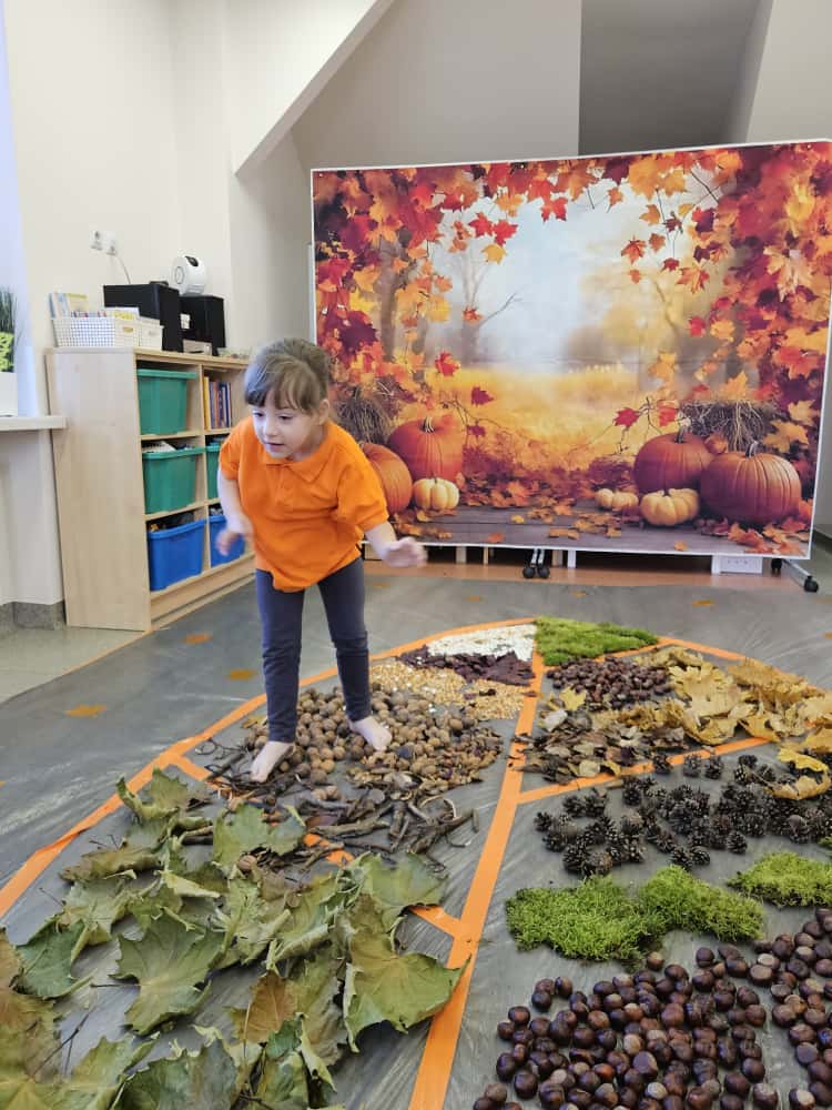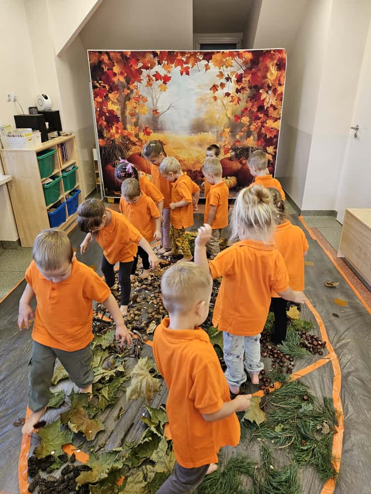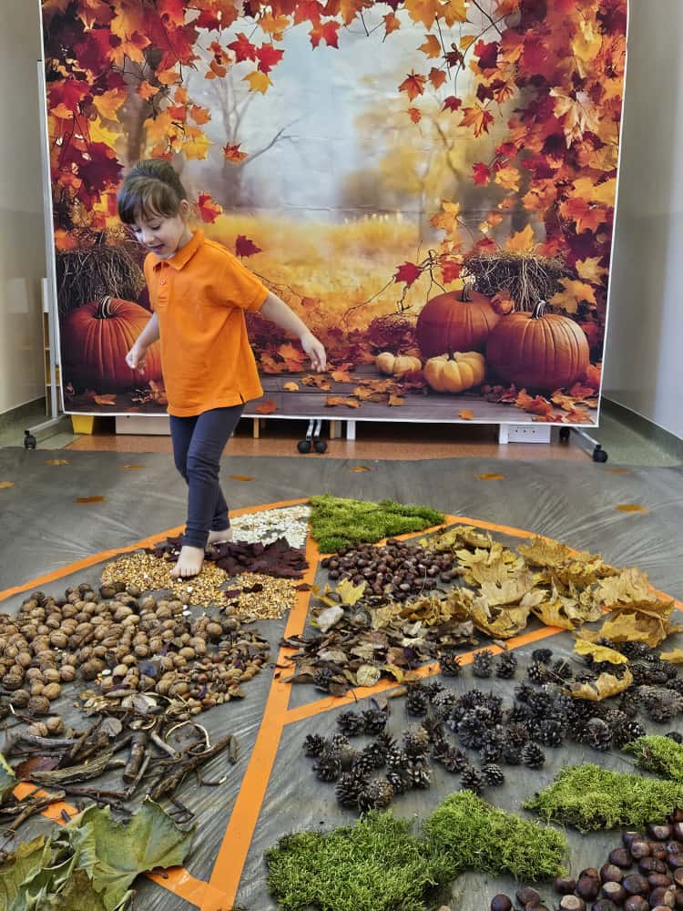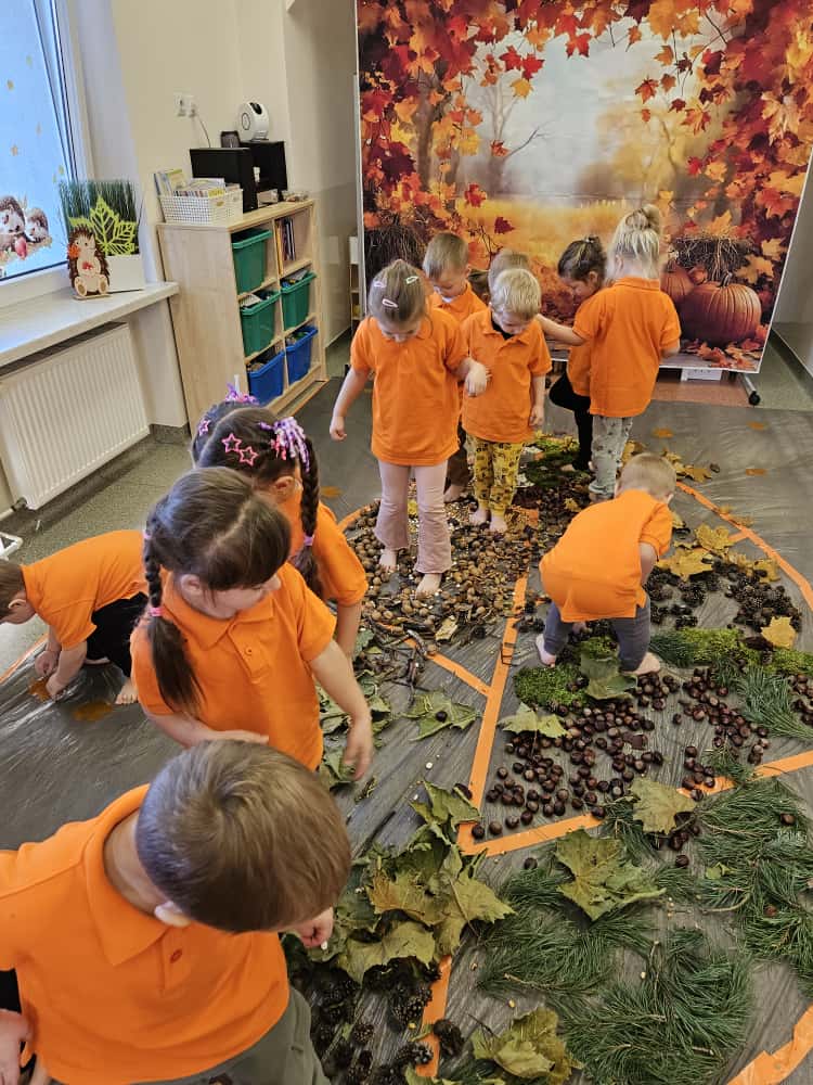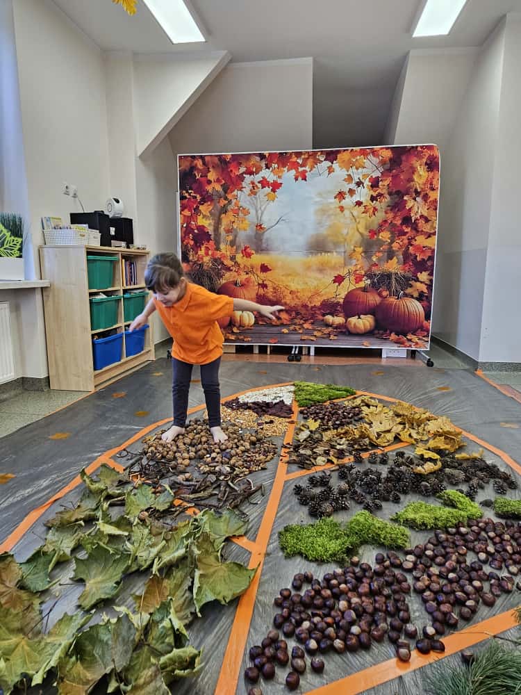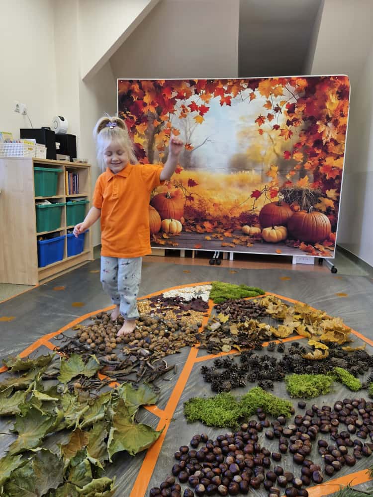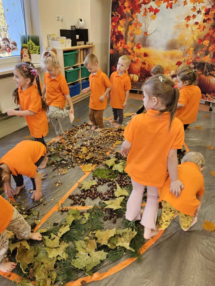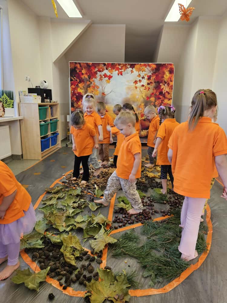 W naszym przedszkolu odbyły się wyjątkowe zajęcia sensoryczne o tematyce jesiennej. Dzieci z radością odkrywały uroki tej pięknej pory roku, uczestnicząc w tworzeniu jesiennej ścieżki sensorycznej z naturalnych darów przyrody — liści, kasztanów, szyszek, żołędzi, orzechów i mchu.