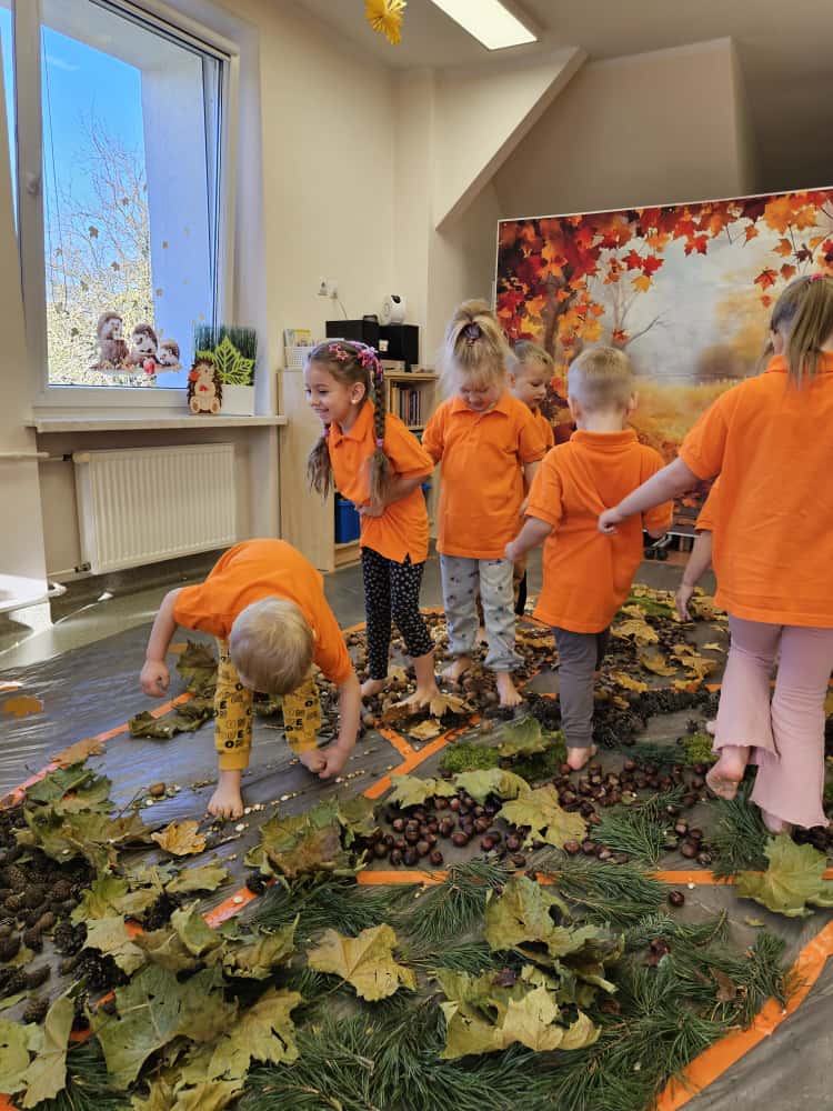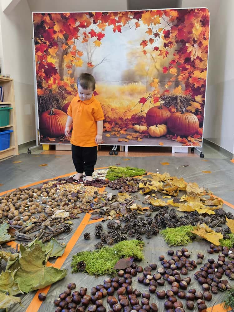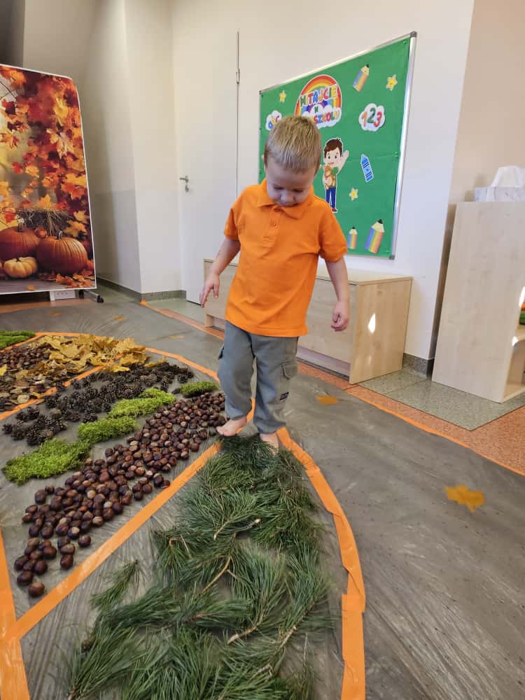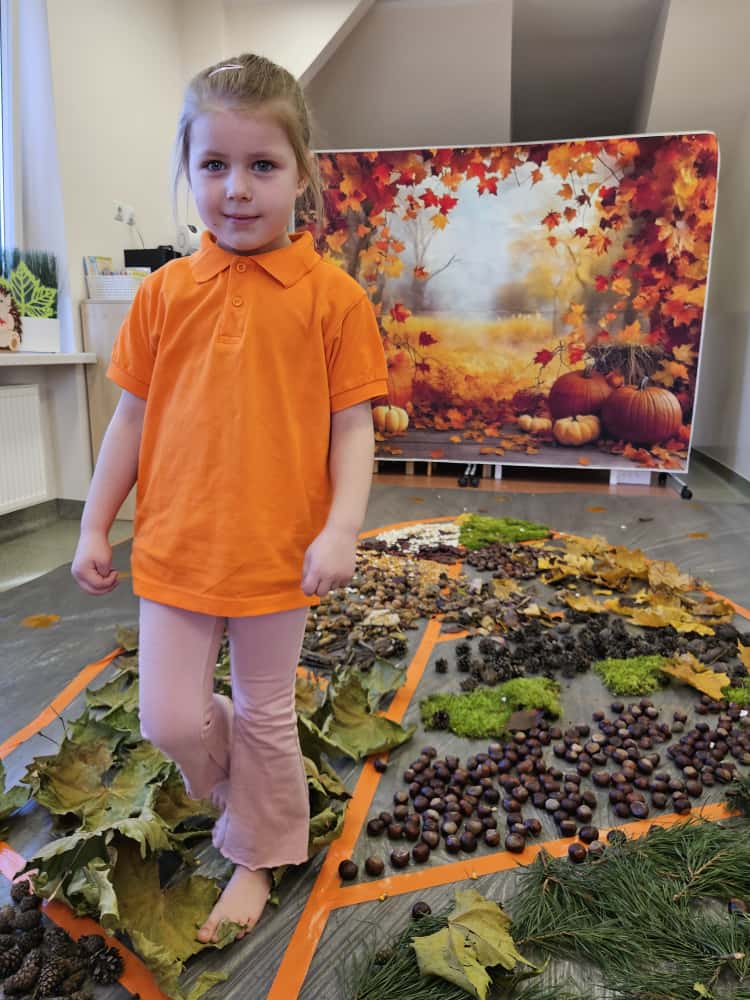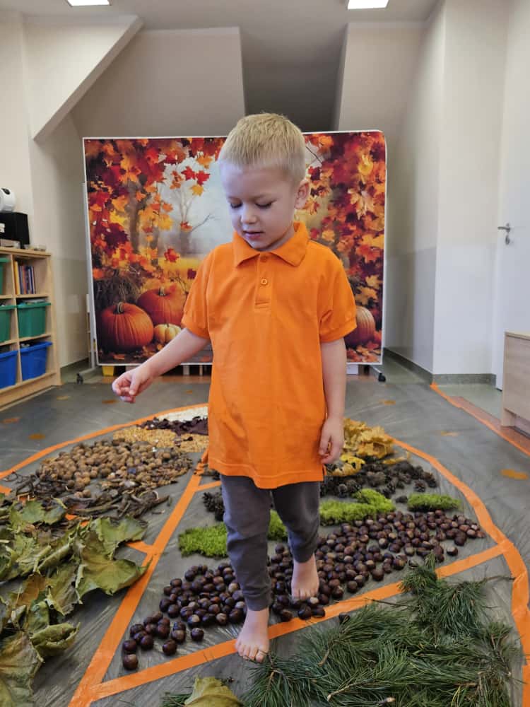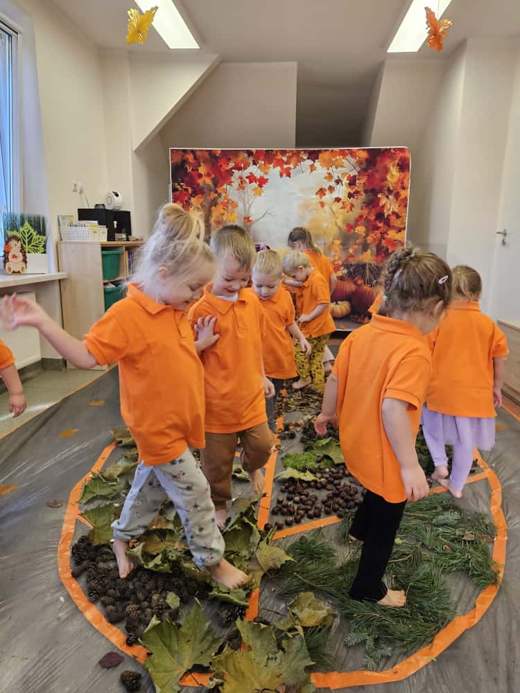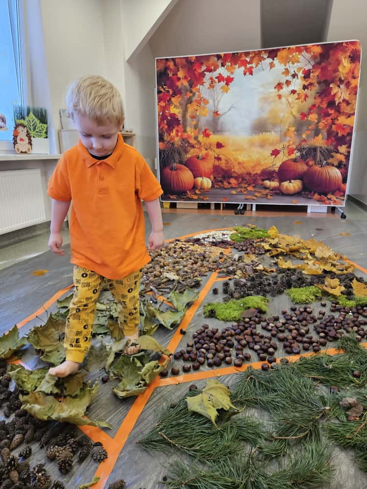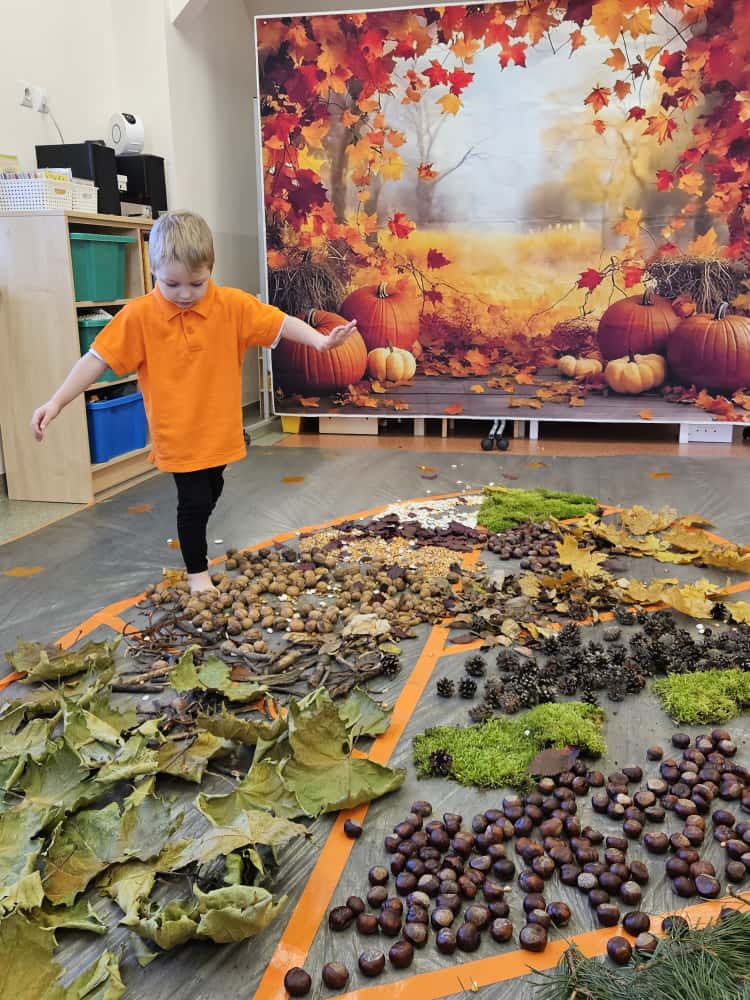 W naszym przedszkolu odbyły się wyjątkowe zajęcia sensoryczne o tematyce jesiennej. Dzieci z radością odkrywały uroki tej pięknej pory roku, uczestnicząc w tworzeniu jesiennej ścieżki sensorycznej z naturalnych darów przyrody — liści, kasztanów, szyszek, żołędzi, orzechów i mchu.