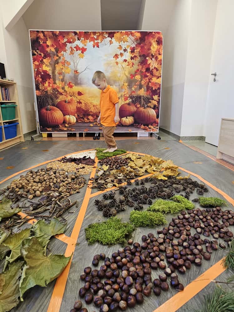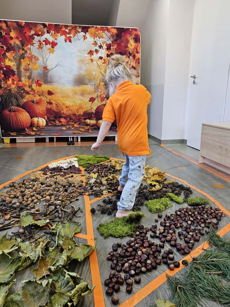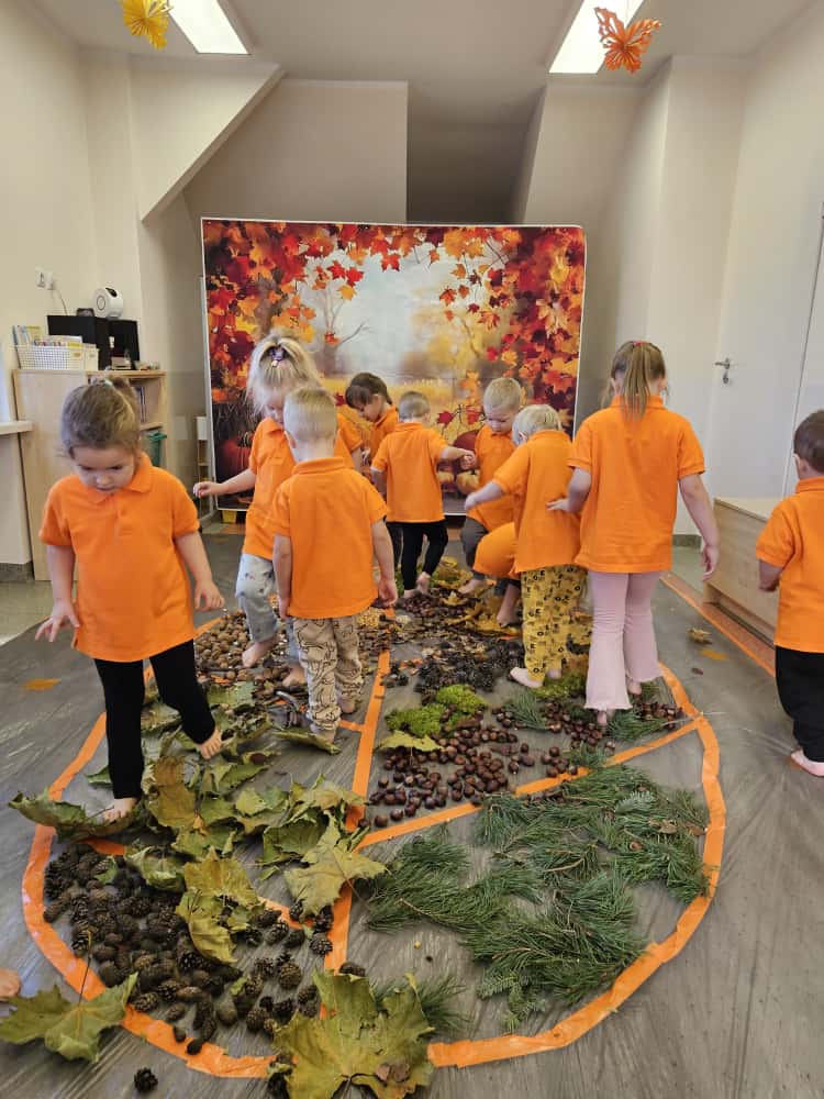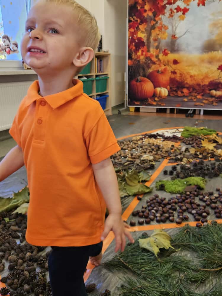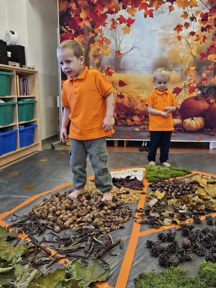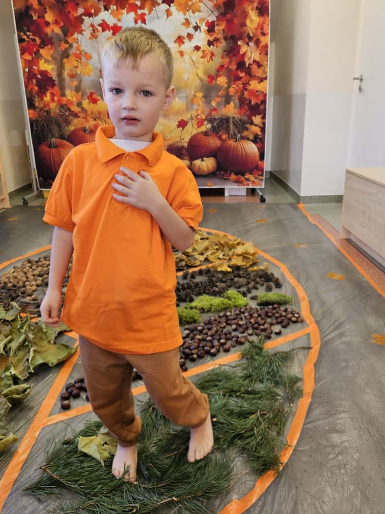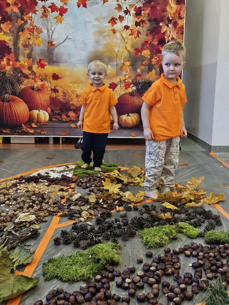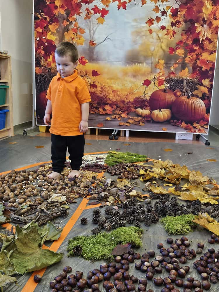 W naszym przedszkolu odbyły się wyjątkowe zajęcia sensoryczne o tematyce jesiennej. Dzieci z radością odkrywały uroki tej pięknej pory roku, uczestnicząc w tworzeniu jesiennej ścieżki sensorycznej z naturalnych darów przyrody — liści, kasztanów, szyszek, żołędzi, orzechów i mchu.
