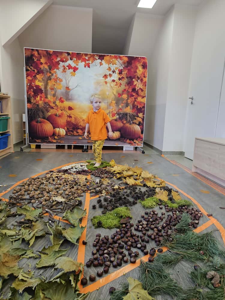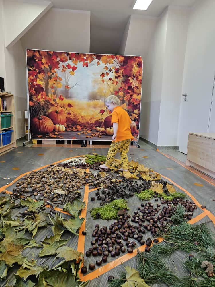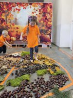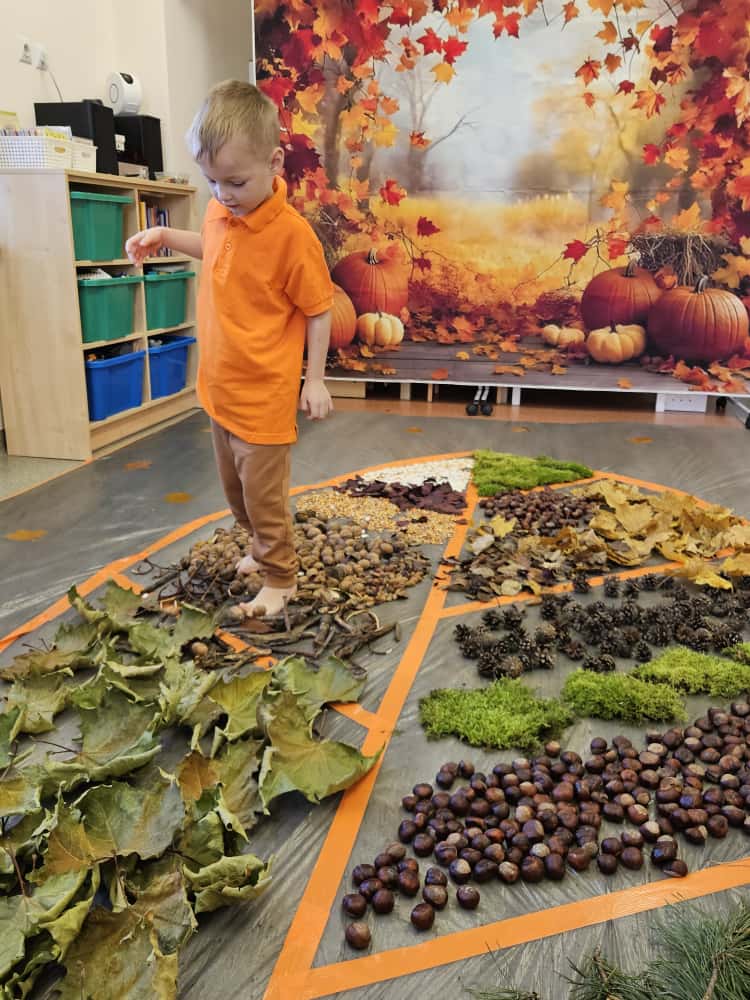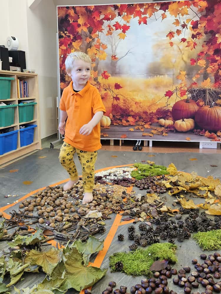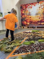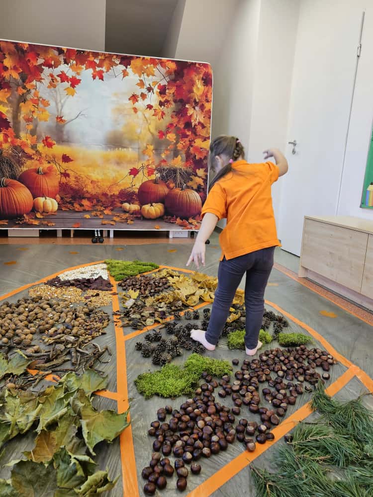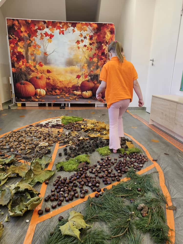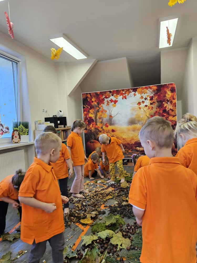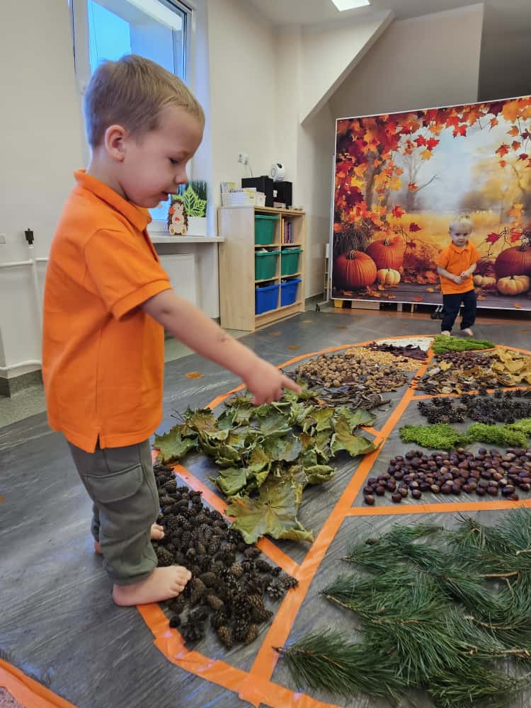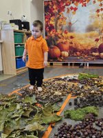 W naszym przedszkolu odbyły się wyjątkowe zajęcia sensoryczne o tematyce jesiennej. Dzieci z radością odkrywały uroki tej pięknej pory roku, uczestnicząc w tworzeniu jesiennej ścieżki sensorycznej z naturalnych darów przyrody — liści, kasztanów, szyszek, żołędzi, orzechów i mchu.