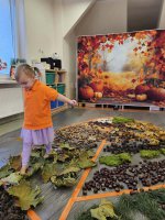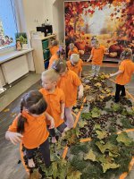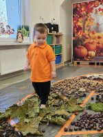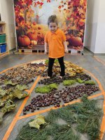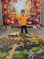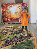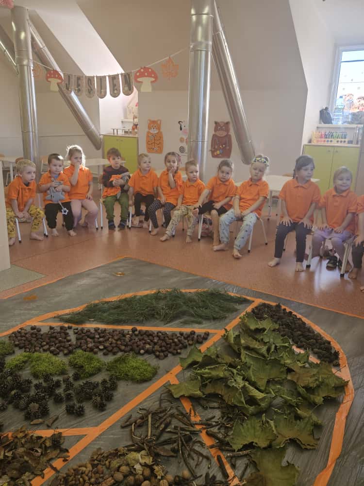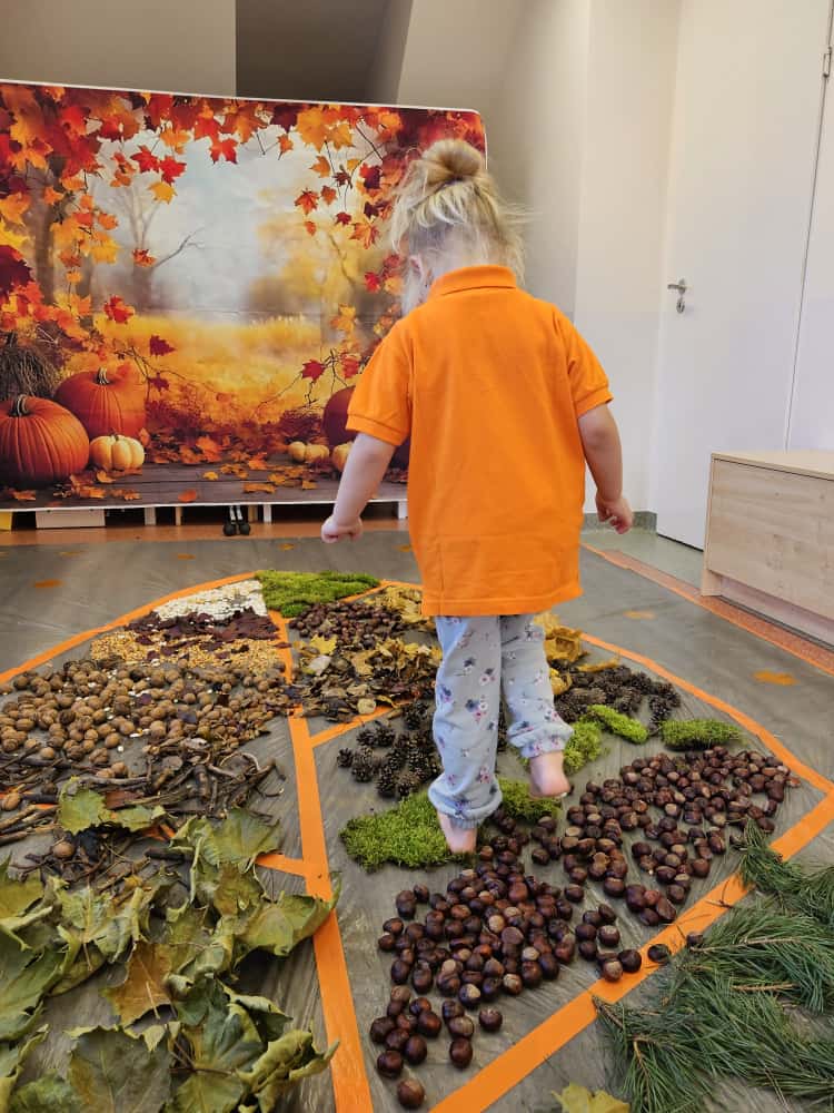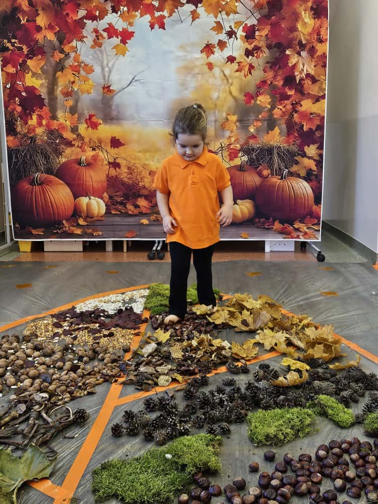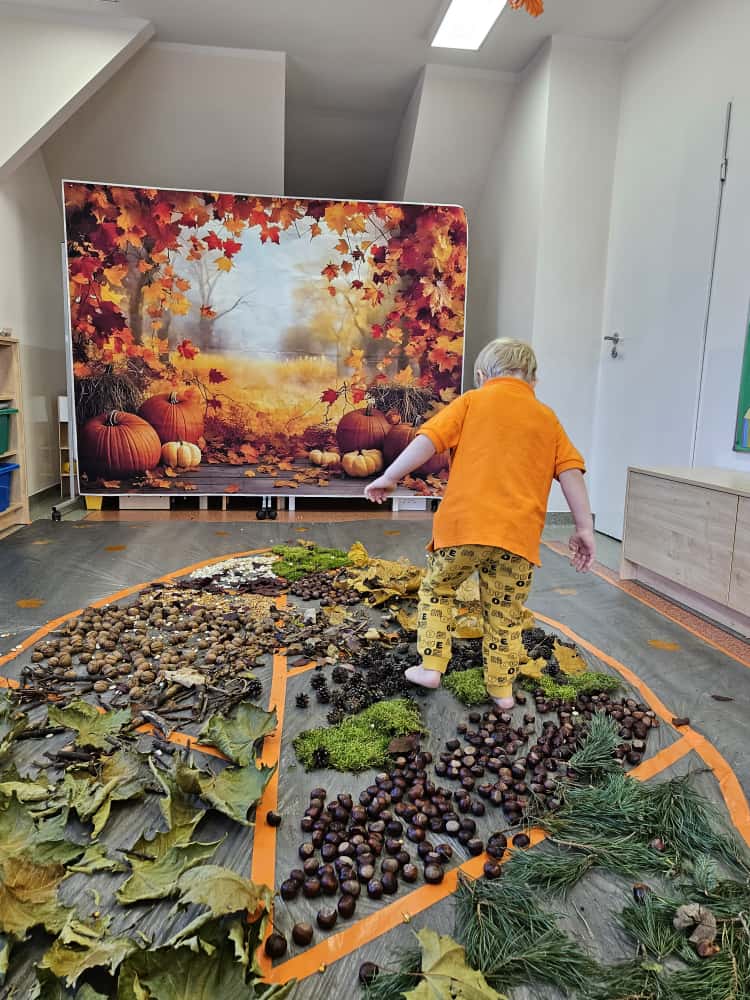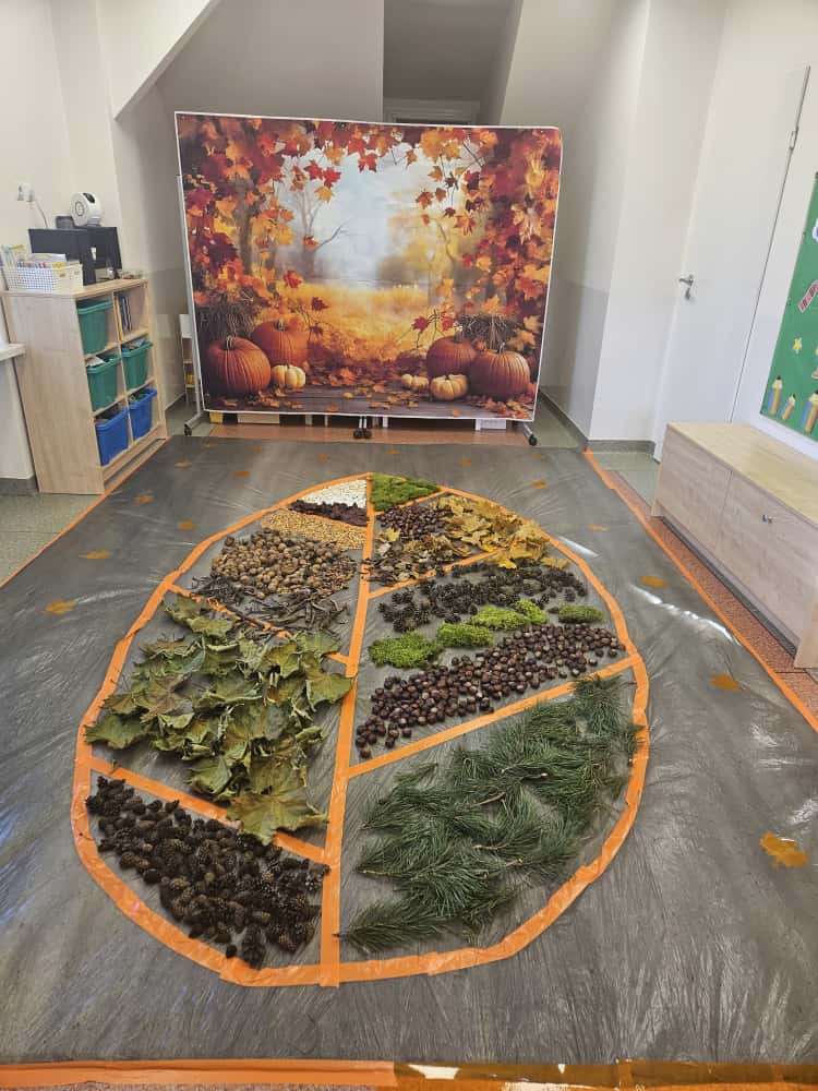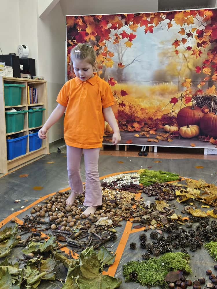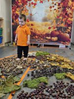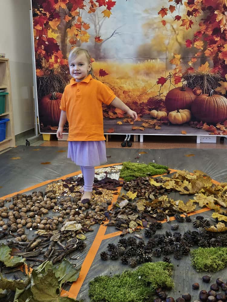 W naszym przedszkolu odbyły się wyjątkowe zajęcia sensoryczne o tematyce jesiennej. Dzieci z radością odkrywały uroki tej pięknej pory roku, uczestnicząc w tworzeniu jesiennej ścieżki sensorycznej z naturalnych darów przyrody — liści, kasztanów, szyszek, żołędzi, orzechów i mchu.
