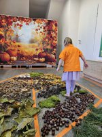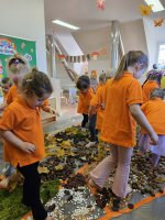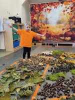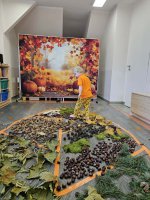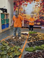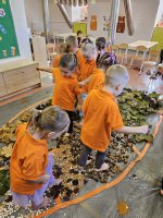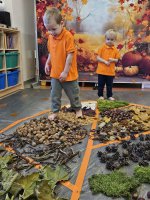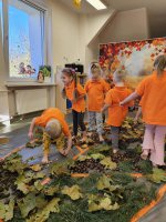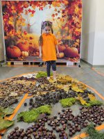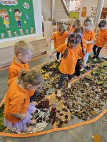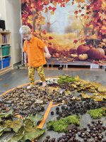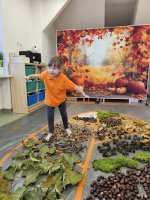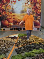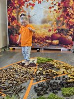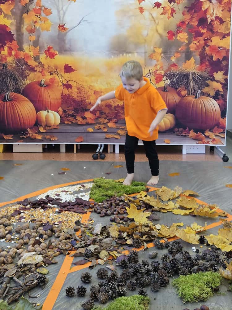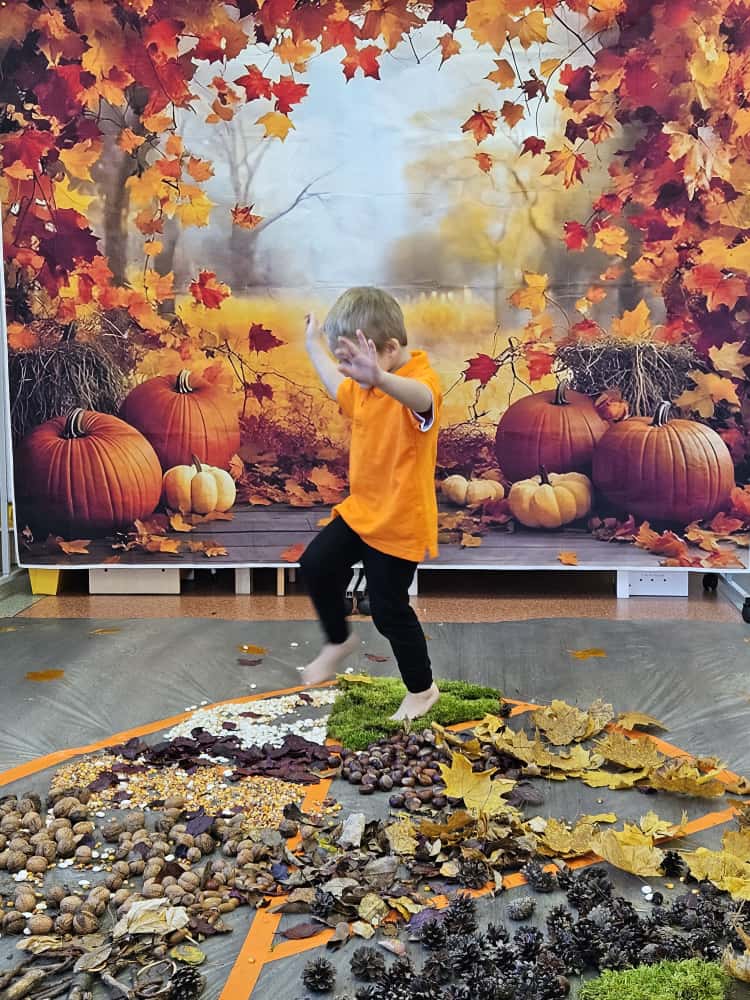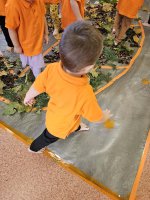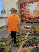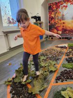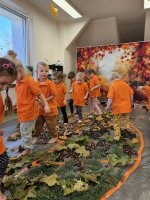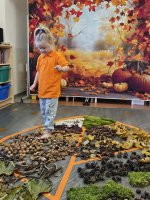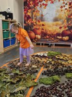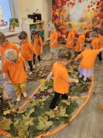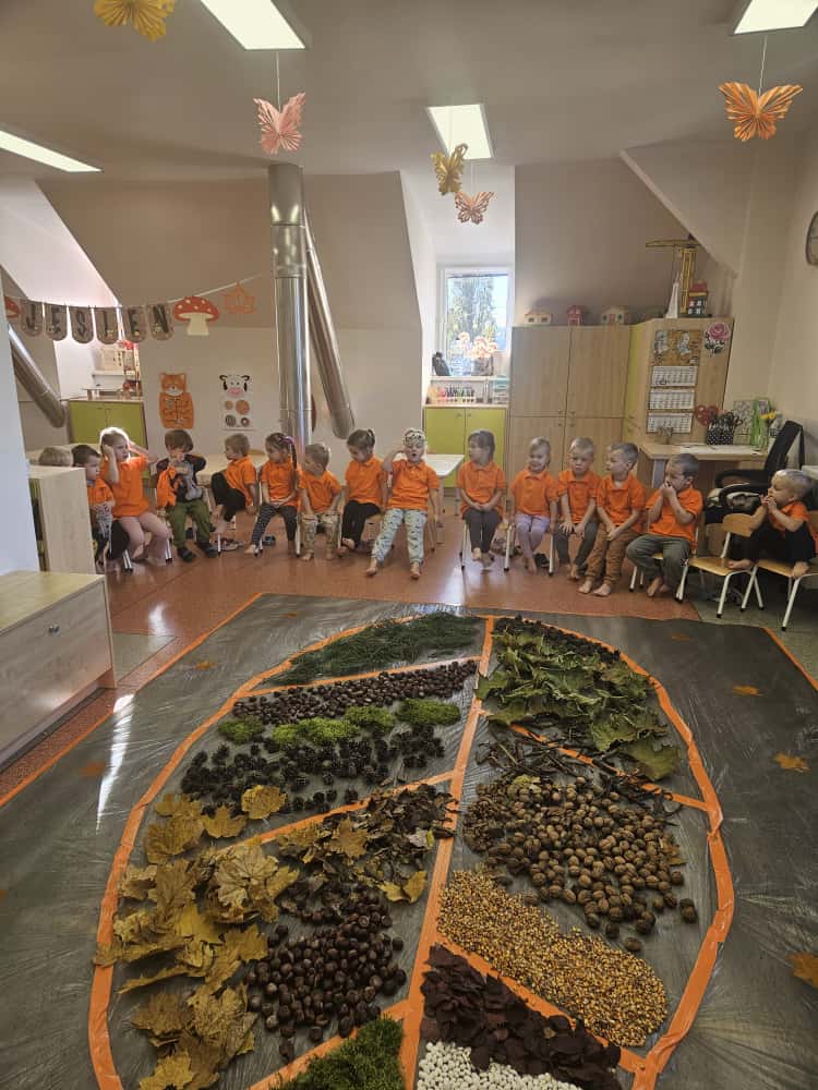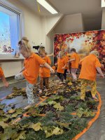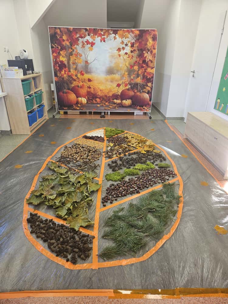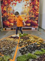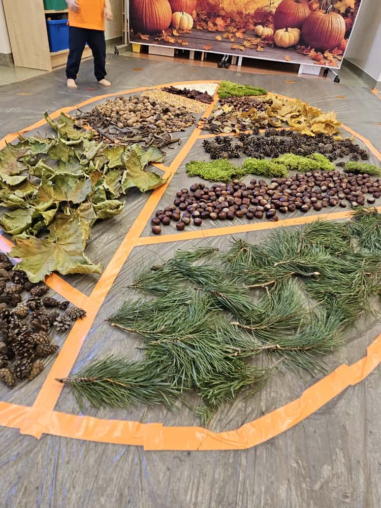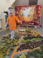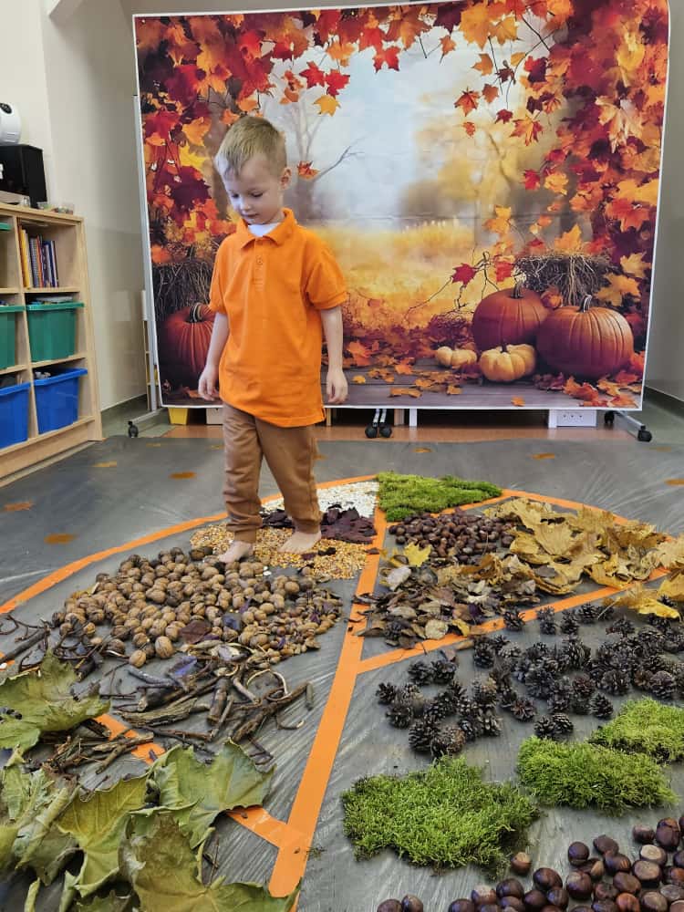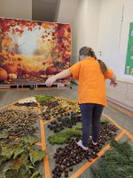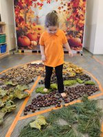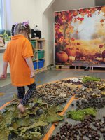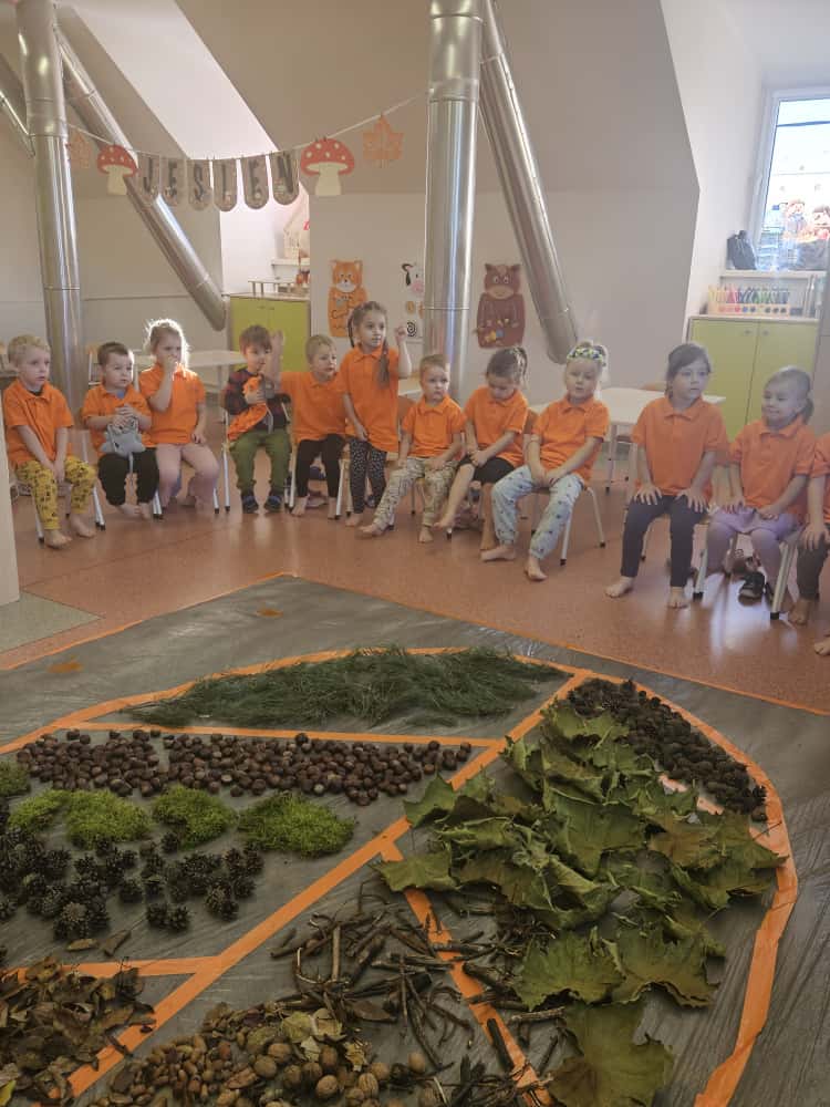 W naszym przedszkolu odbyły się wyjątkowe zajęcia sensoryczne o tematyce jesiennej. Dzieci z radością odkrywały uroki tej pięknej pory roku, uczestnicząc w tworzeniu jesiennej ścieżki sensorycznej z naturalnych darów przyrody — liści, kasztanów, szyszek, żołędzi, orzechów i mchu.