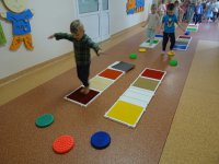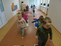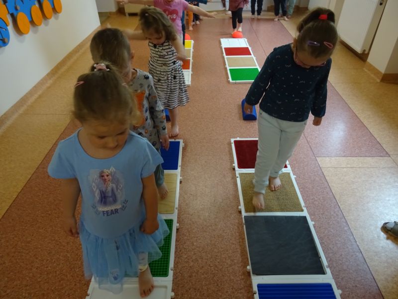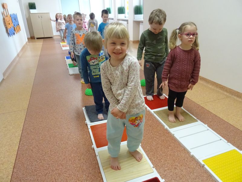 Stymulowaliśmy zmysł smaku i węchu oraz zrealizowaliśmy ścieżkę sensoryczną. Dzieci ochoczo sprawdzały, które faktury są przyjemne dla stóp, które mniej.