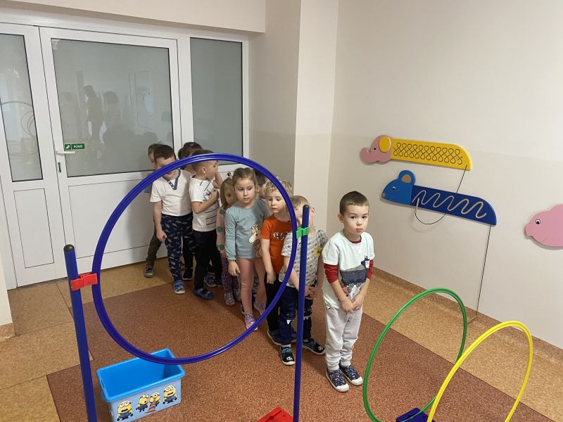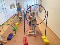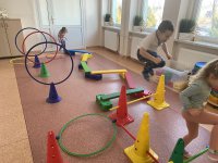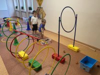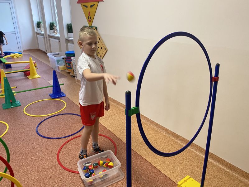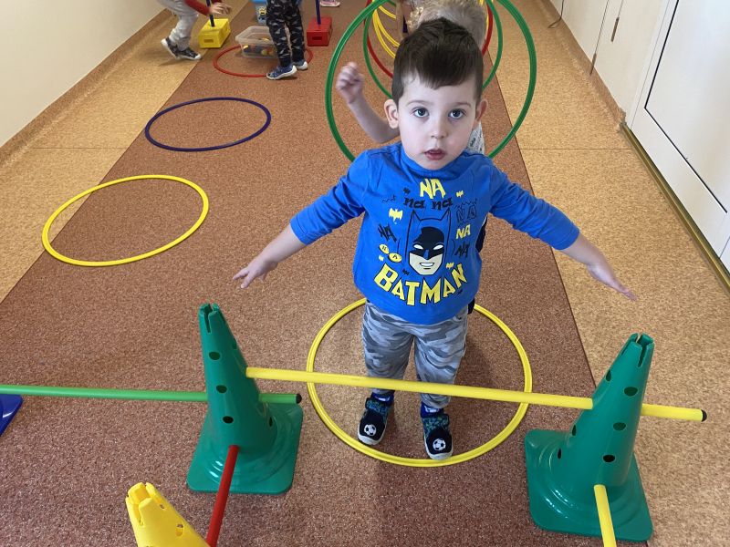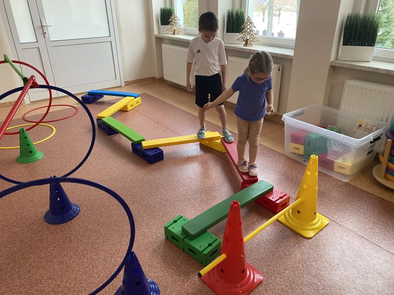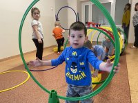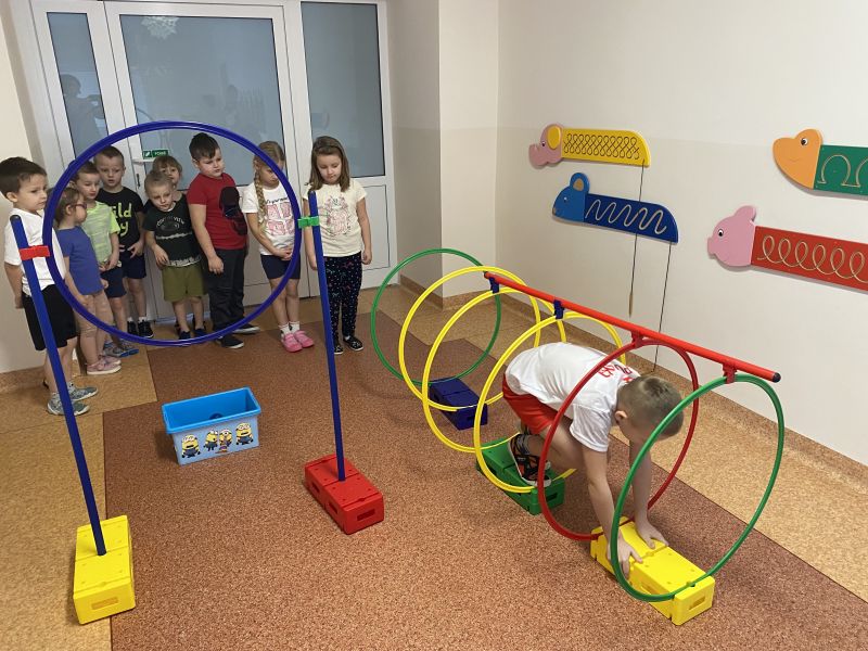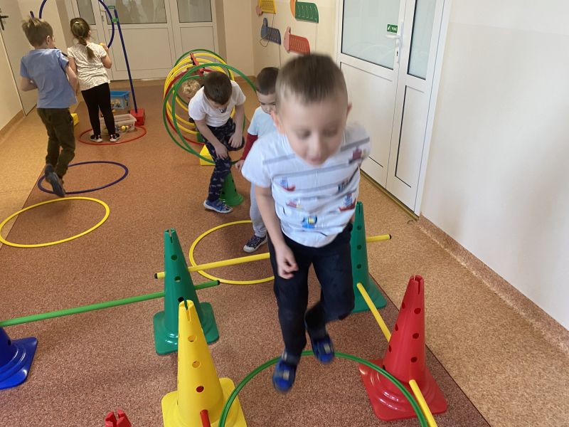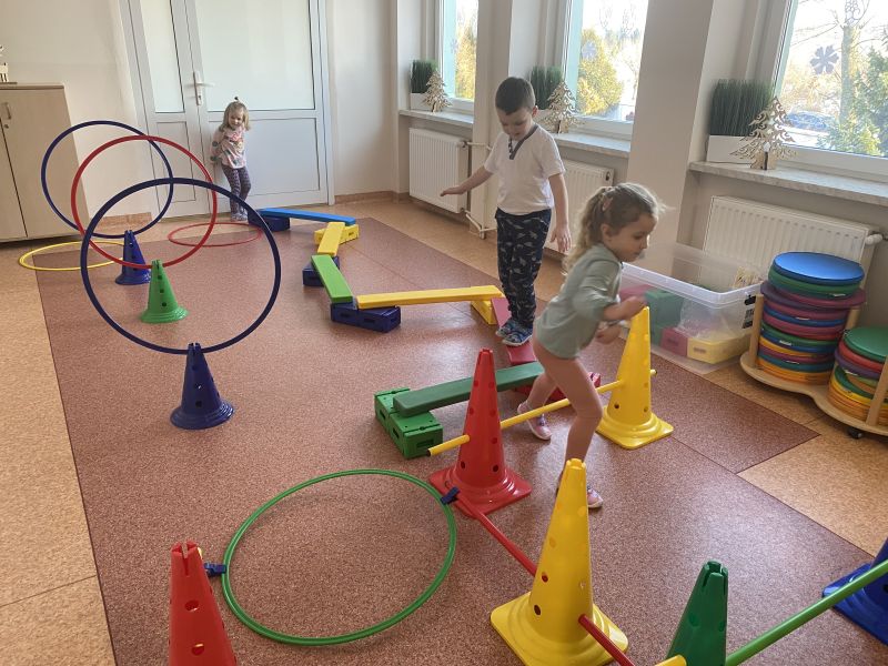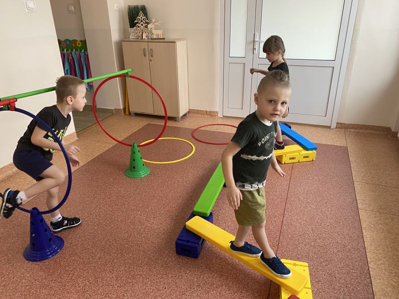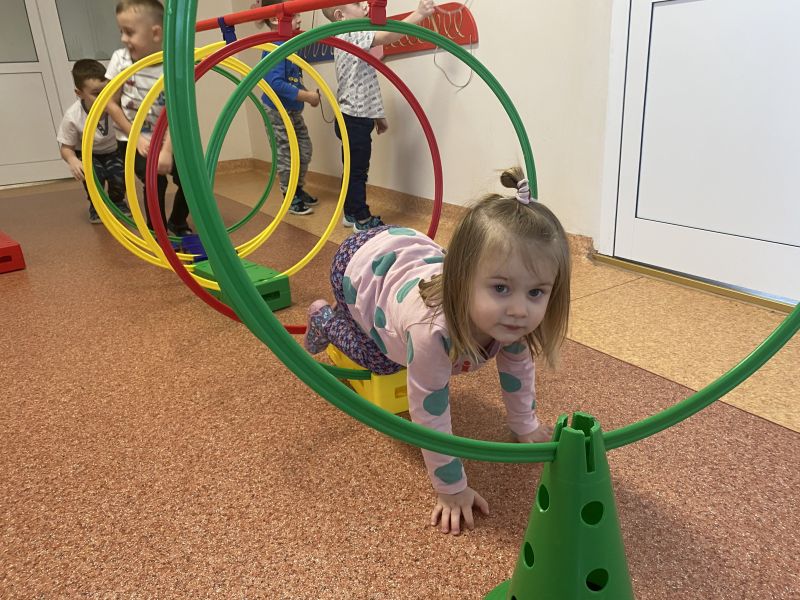 Dzieci podczas zajęć gimnastycznych rozwijały swoje umiejętności ruchowe, zwinność, gibkość oraz ćwiczyły zmysł równowagi na specjalnie przygotowanym kolorowym torze przeszkód. Zajęcia dostarczyły przedszkolakom wiele radości.