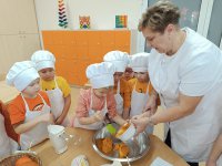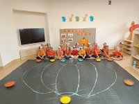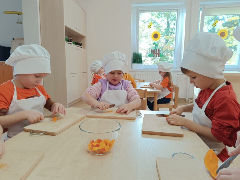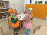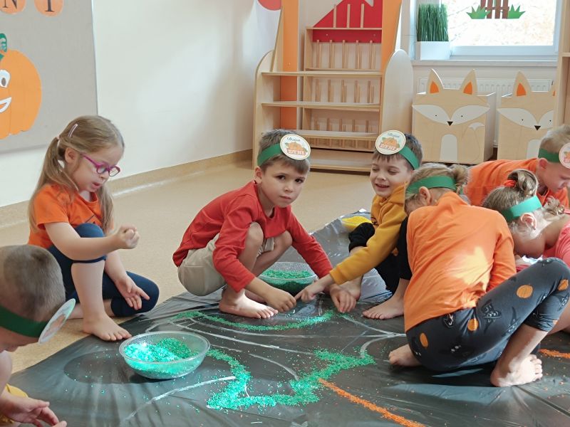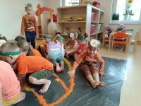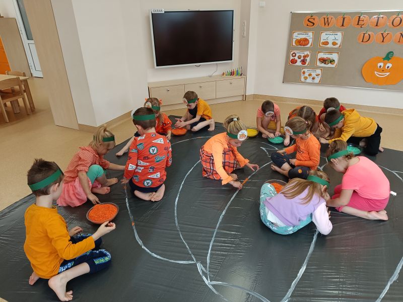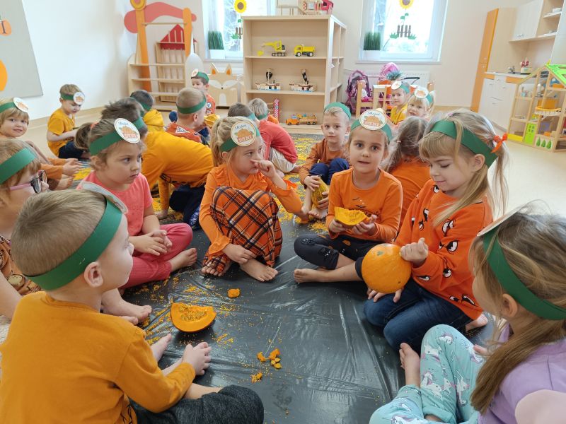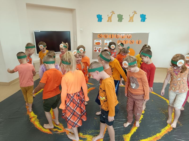 Dynia to bardzo zdrowe, urodziwe i łatwe do współpracy warzywo-przekonały się o tym Biedronki w czasie obchodów "Święta Dyni". Tego dnia w przedszkolu zrobiło się pomarańczowo, gdyż dzieci przyszły do przedszkola ubrane właśnie w tych kolorach. "Święto Dyni" pozwoliło poznać Biedronkom wielkąróżnorodność dyń i wzbogaciło wiedzę na ich temat. Przekonały się, że z dyni można przygotować wiele smacznych dań. Dynia zainspirowała ich do wykorzystania metod sensoplastycznych i stworzenia obrazu jesiennego warzywa, rozwijając przy tym zmysły: węchu, słuchu i smaku. Wszyscy byli zachwyceniefektem końcowym.