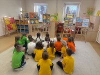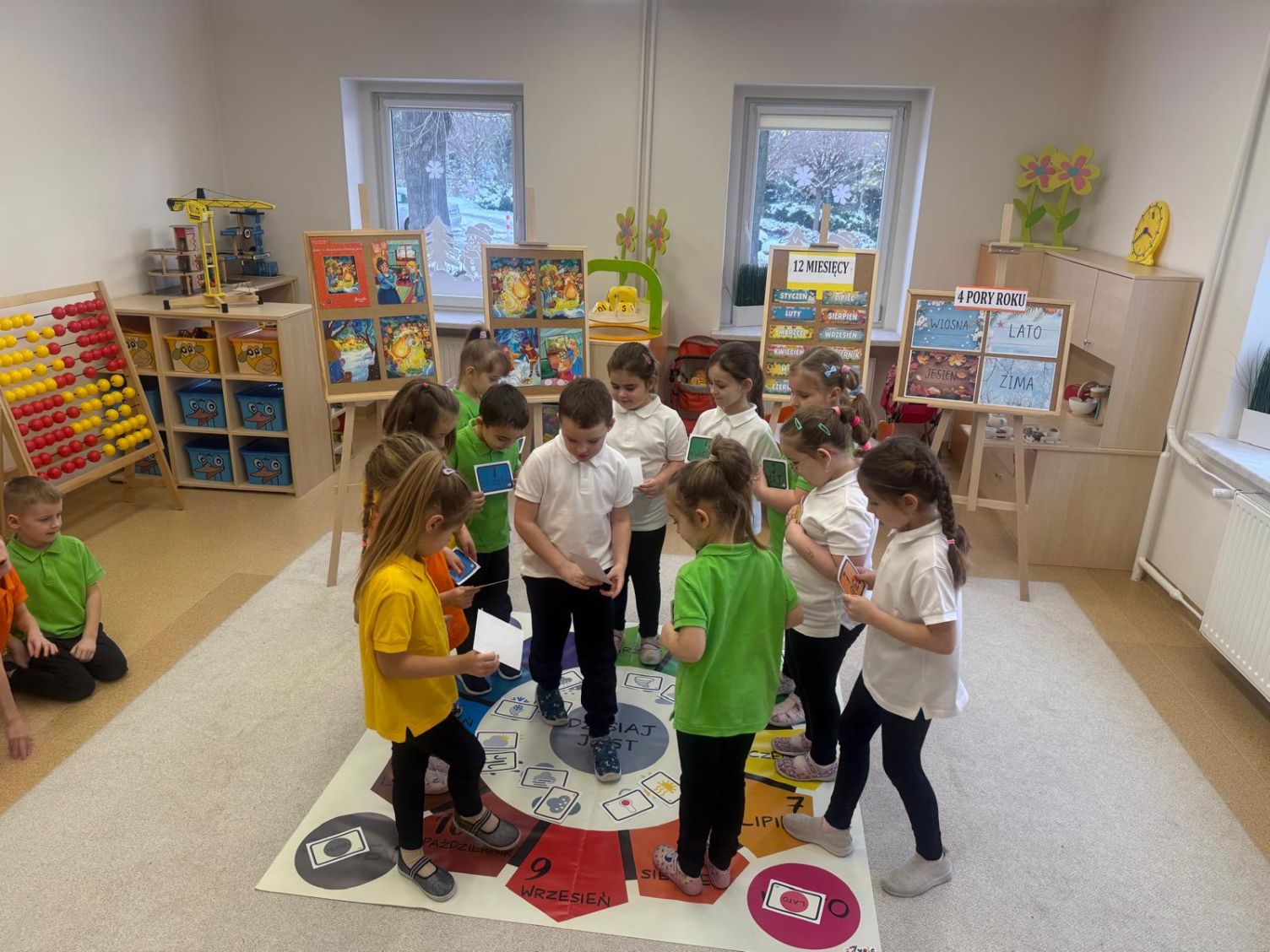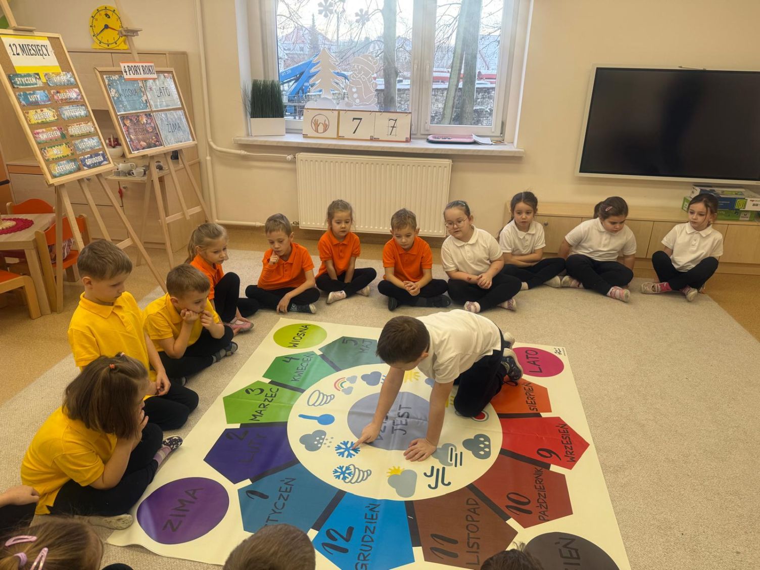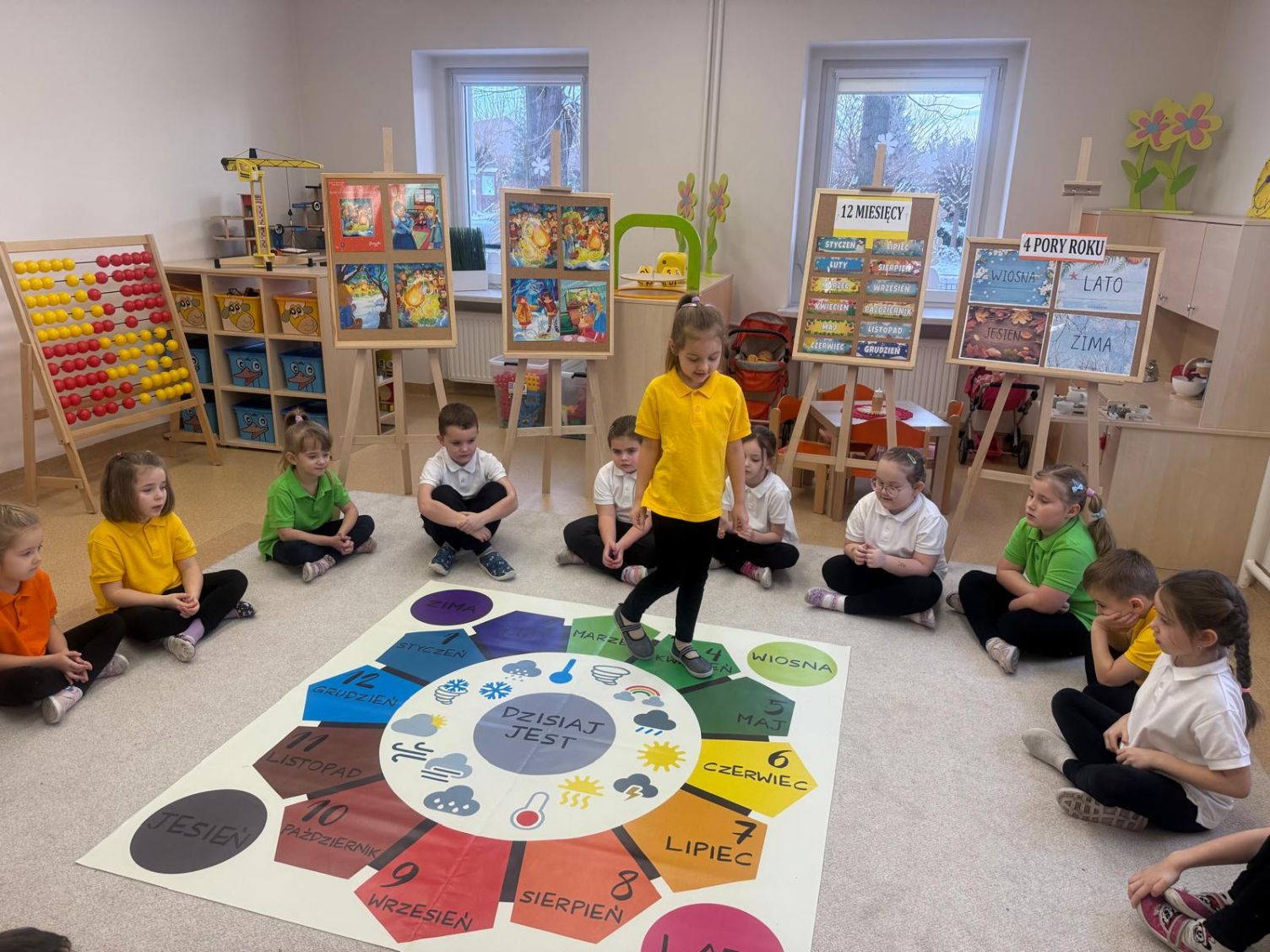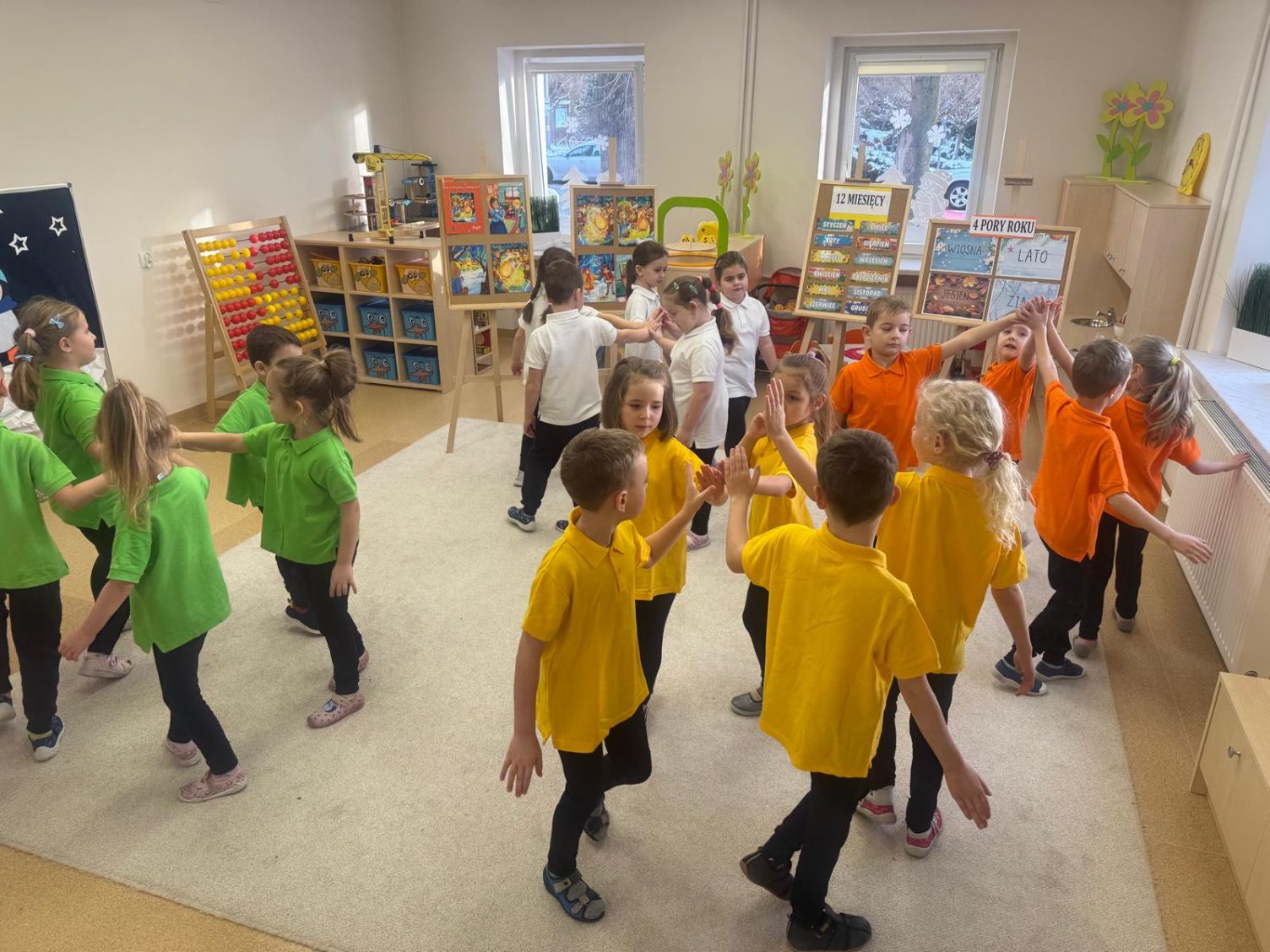 Dzieci świetnie się bawiły i uczyły wykorzystując matę edukacyjną pt " Kalendarz pogody". Poprzez różnego rodzaju aktywność utrwalały cykliczność pór roku, następstwa miesięcy, zjawiska pogodowe itp. Zajęcie to było też okazją do utrwalania kolorów, przeliczania i rozwijania wyobraźni. Był to super udany dzień jak widać w galerii.