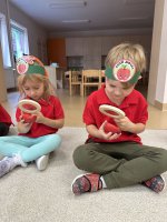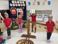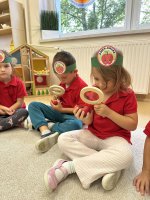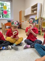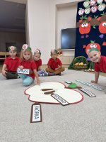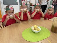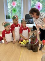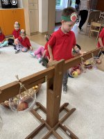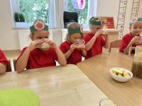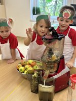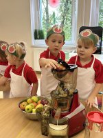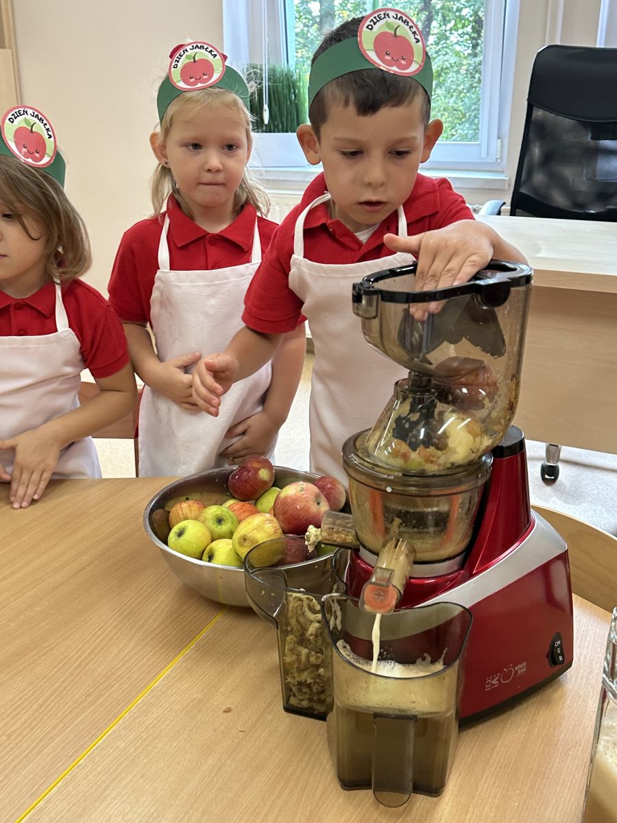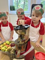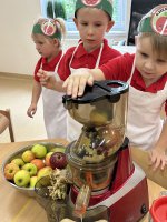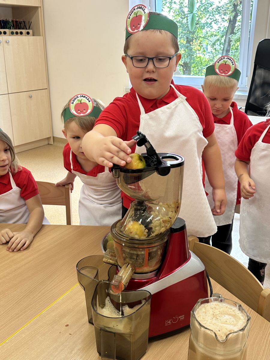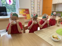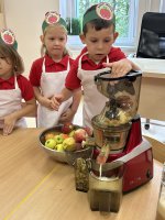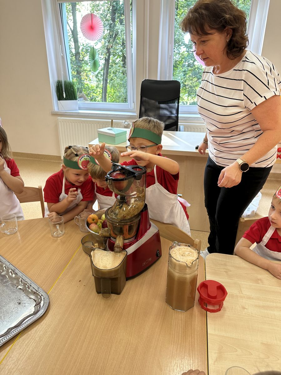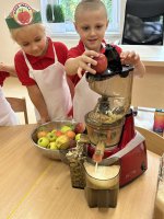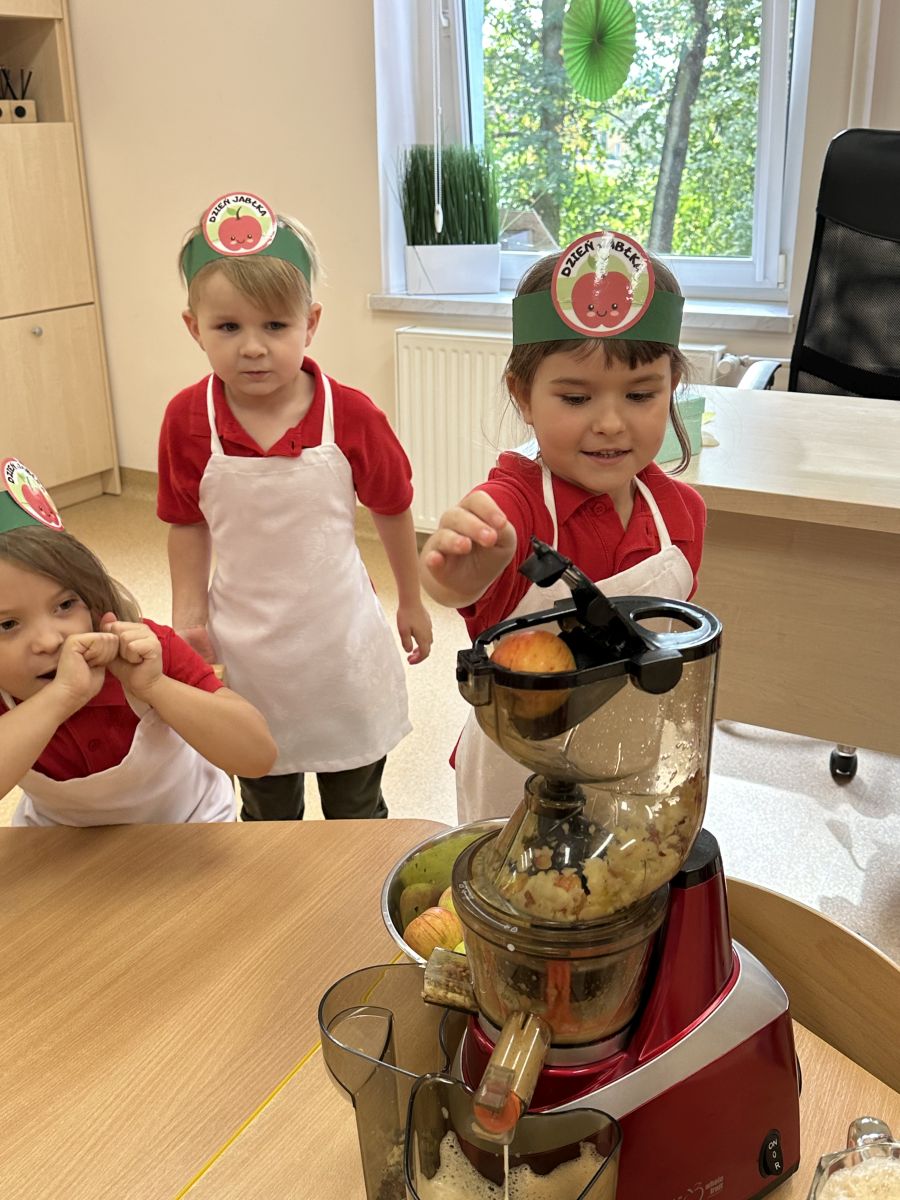 Motylki poznały nie tylko budowę jabłka, ale również rozwijały umiejętności matematyczne poprzez przelicznie, ważenie, określanie wielkości itp. Na koniec dzieci pod okiem Pań przygotowały pyszny, naturalny sok jabłkowy, który zniknął w mgnieniu oka podczas drugiego śniadania.