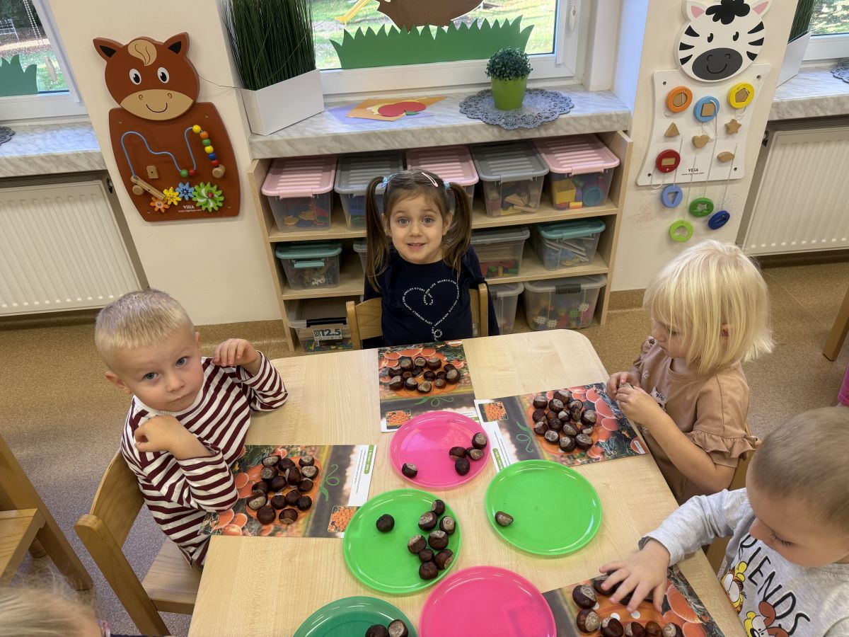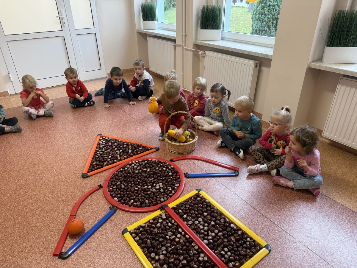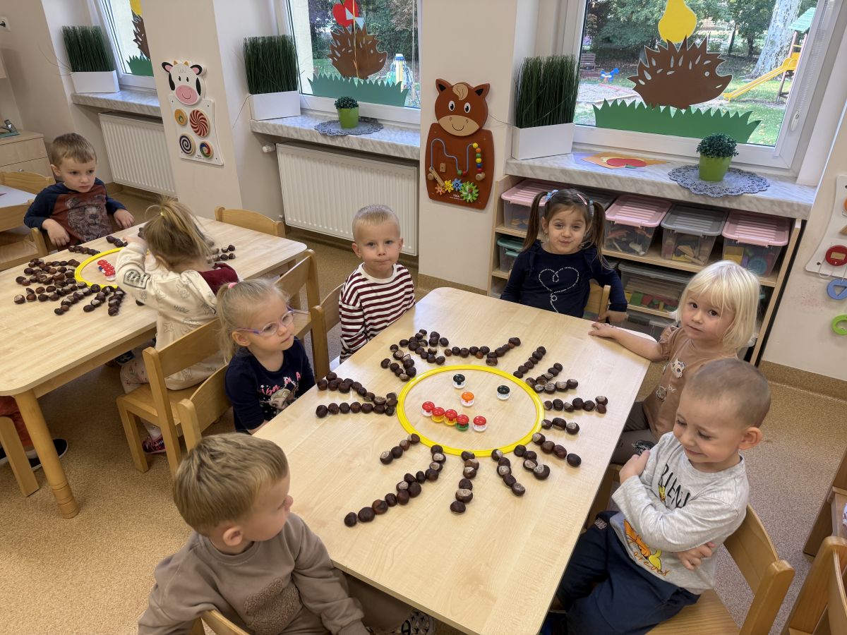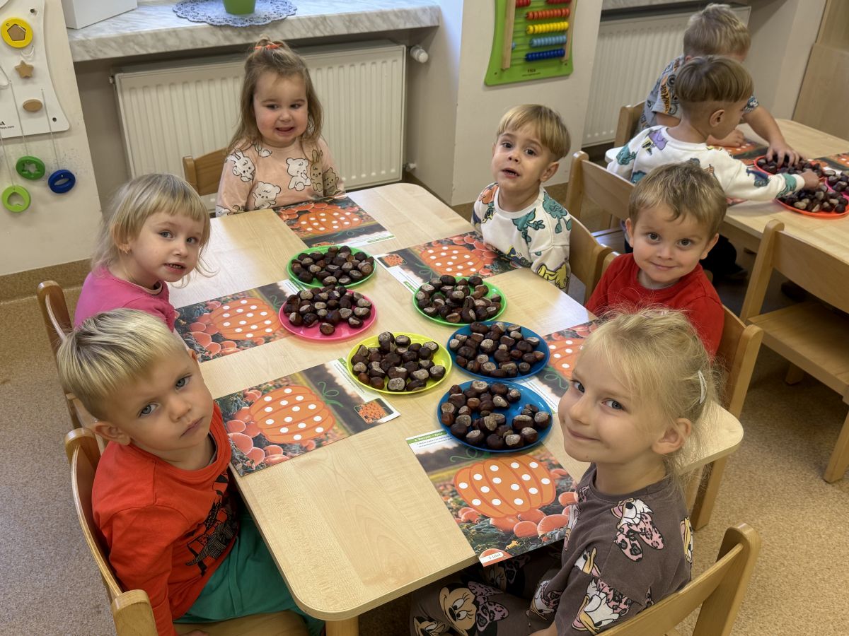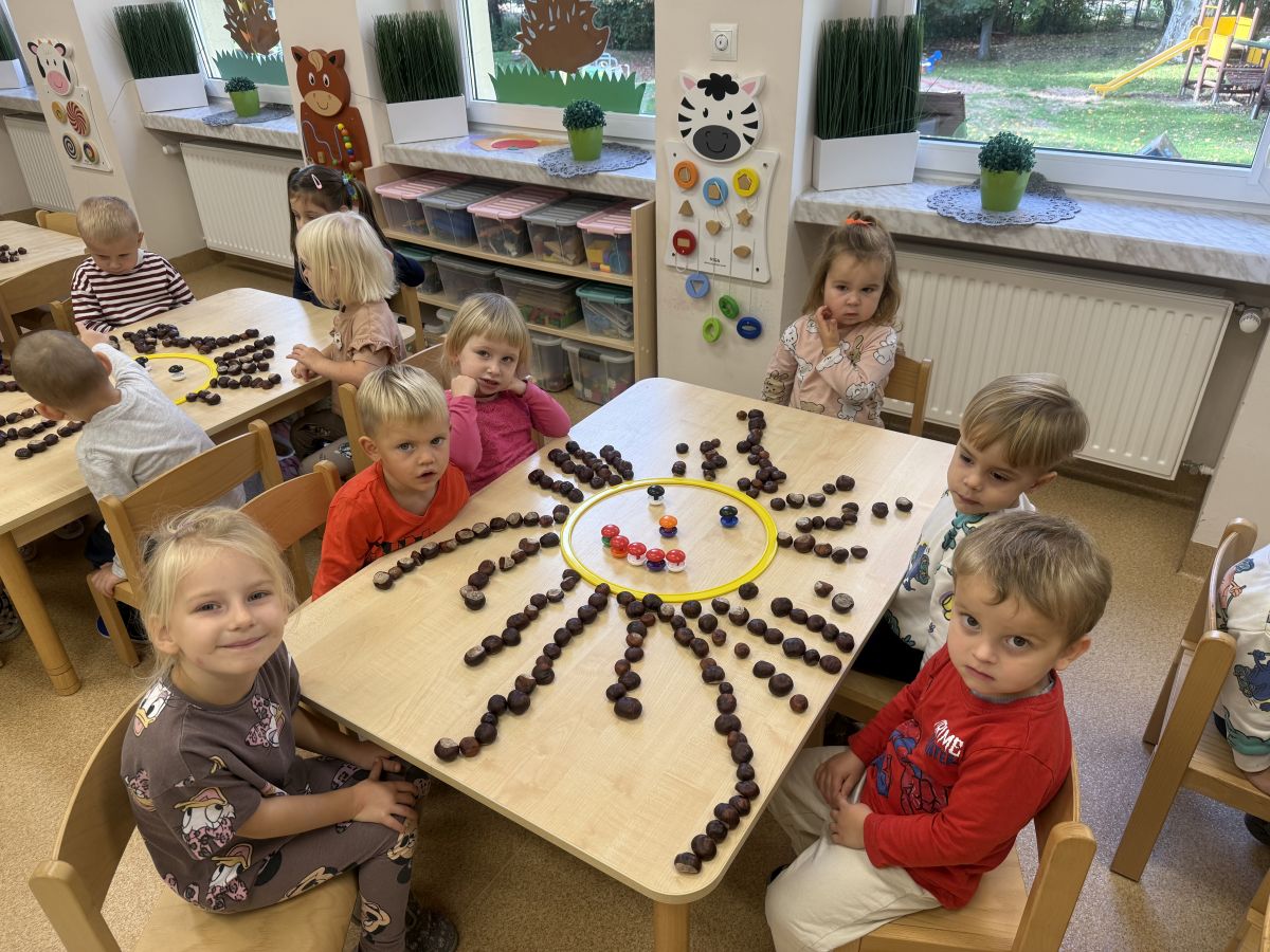 Jesień to pora roku podczas której można na wiele sposobów bawić się darami przyrody, zwłaszcza kasztanami. Krasnale w swojej grupie wykorzystały kasztany do zabaw matematycznych, doskonalimy wtedy umiejętność przeliczania na konkretach, układaliśmy z kasztanów słoneczka oraz tworzyliśmy prace plastyczne .Po zajęciach wybraliśmy się na jesienny spacer aby podziwiać jesienną aurę. Zabawy kasztanami oraz spacer dostarczył przedszkolakom wiele wrażeń i radości.