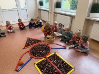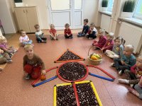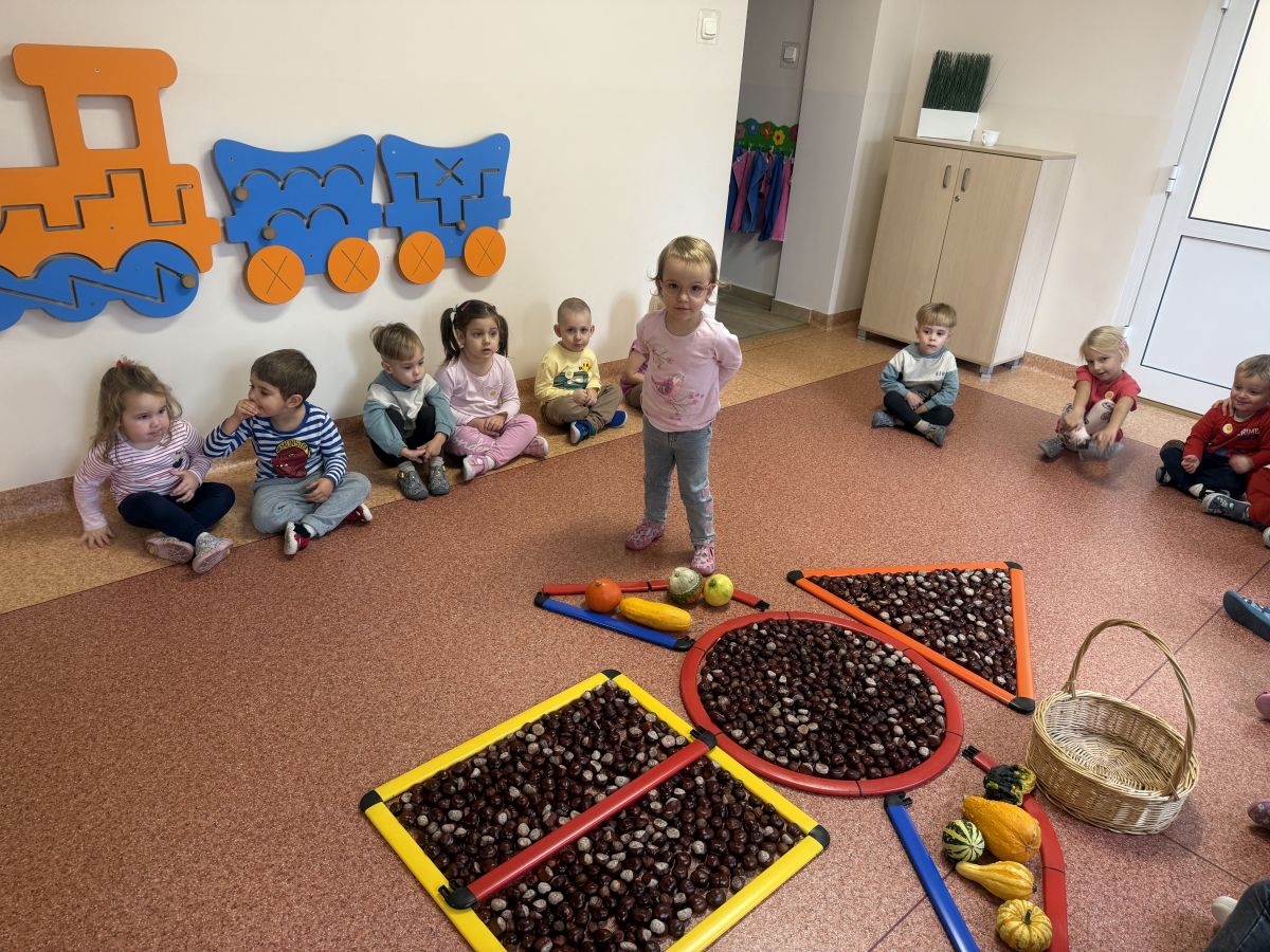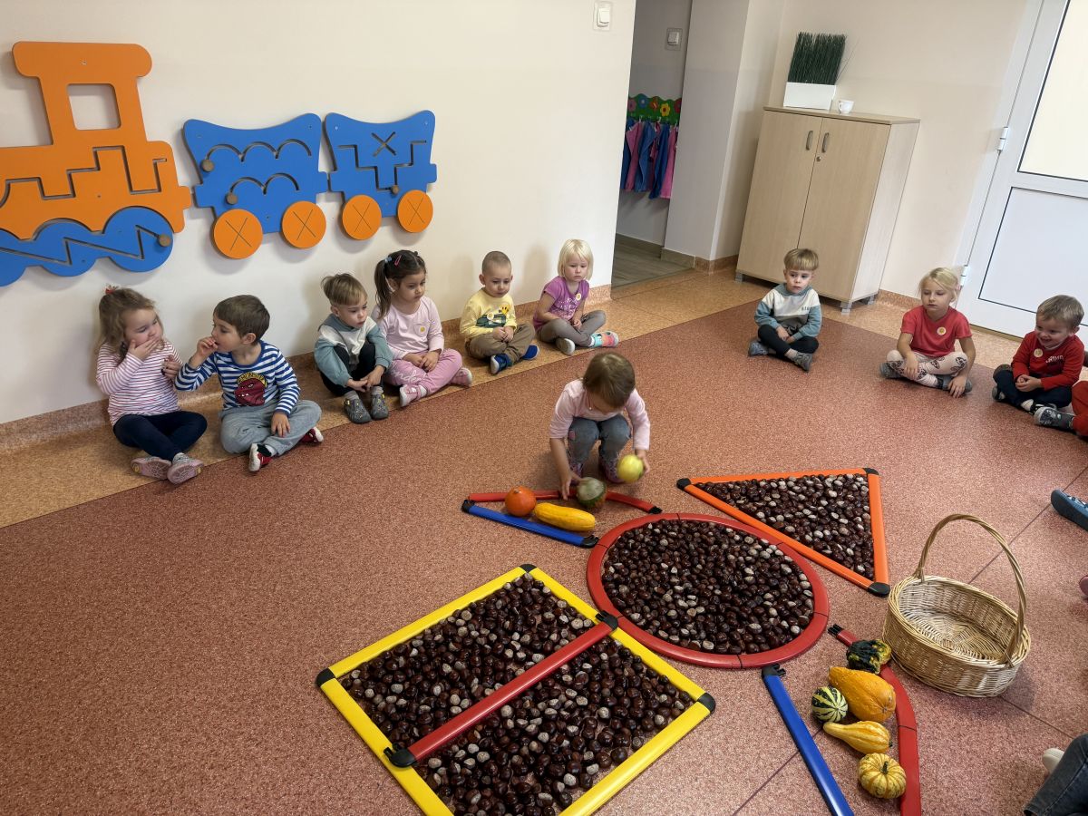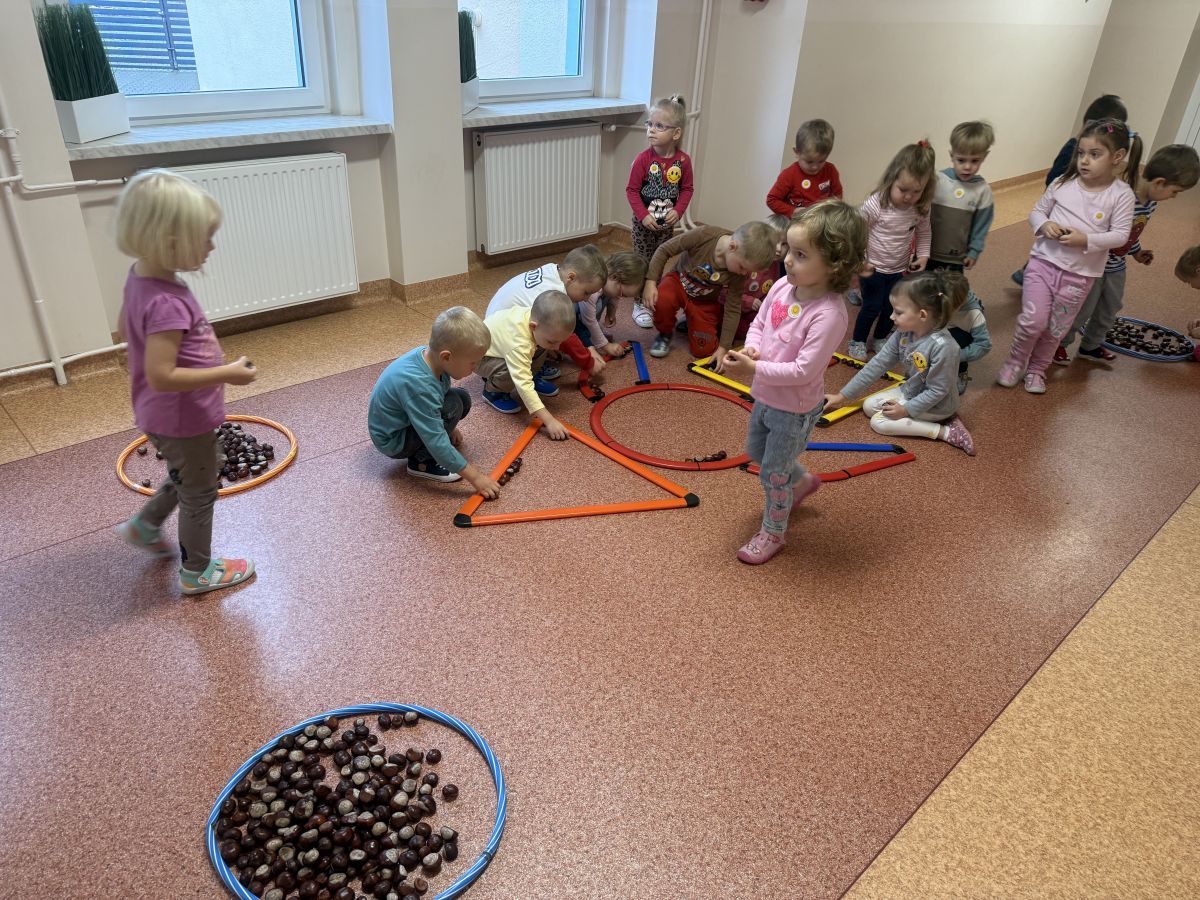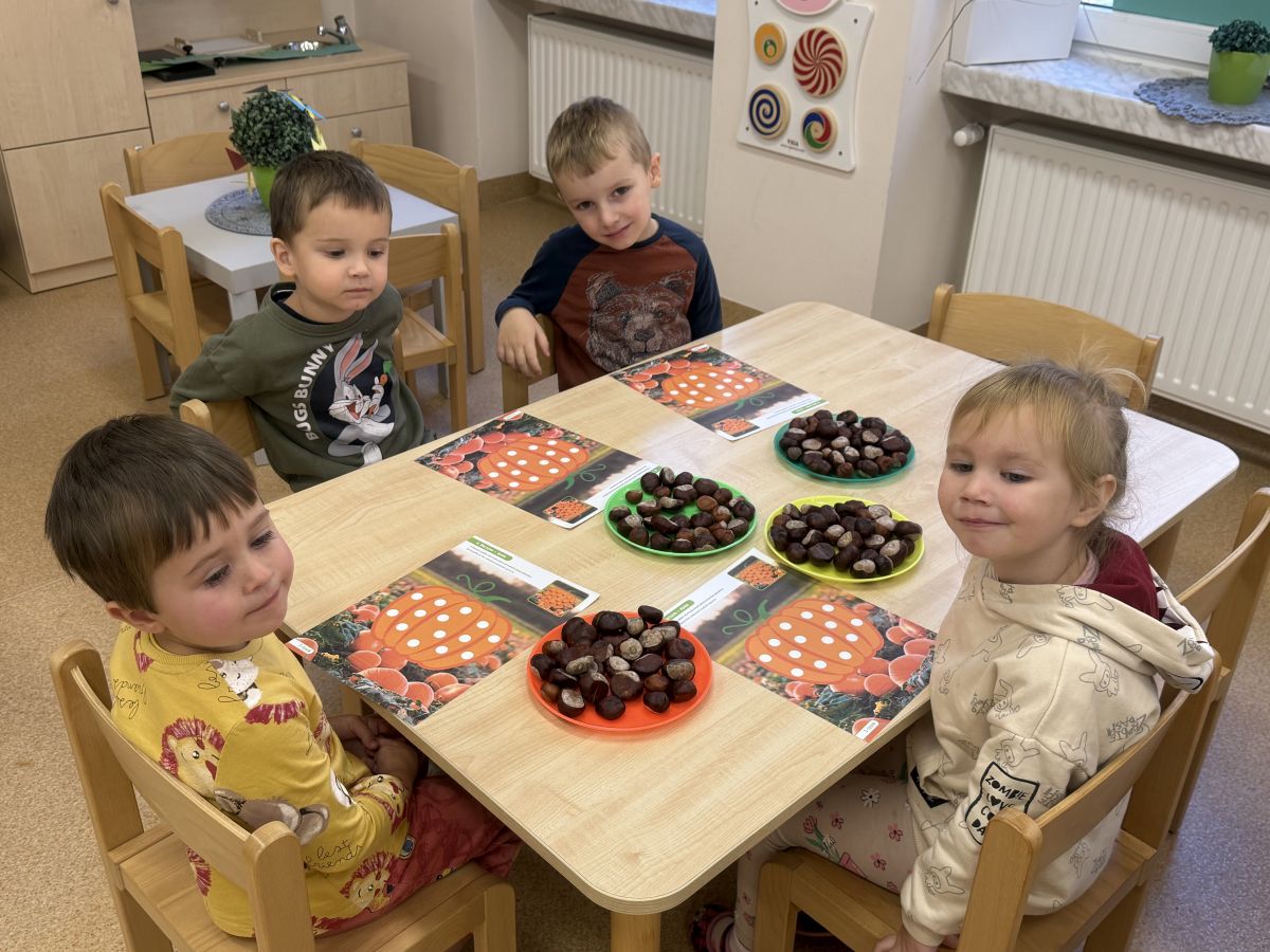 Jesień to pora roku podczas której można na wiele sposobów bawić się darami przyrody, zwłaszcza kasztanami. Krasnale w swojej grupie wykorzystały kasztany do zabaw matematycznych, doskonalimy wtedy umiejętność przeliczania na konkretach, układaliśmy z kasztanów słoneczka oraz tworzyliśmy prace plastyczne .Po zajęciach wybraliśmy się na jesienny spacer aby podziwiać jesienną aurę. Zabawy kasztanami oraz spacer dostarczył przedszkolakom wiele wrażeń i radości.