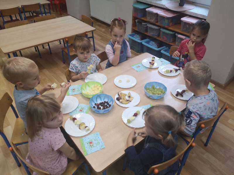 Drugi październikowy tydzień w grupie „Sówek” miał smak jesiennych owoców. Zaczęliśmy od poznania najpopularniejszych drzew owocowych wraz z ich darami. Oglądaliśmy, wąchaliśmy, dotykaliśmy, delektowaliśmy się ich smakiem i aromatem. Nie zabrakło zabaw w przeliczanie, porównywanie, układanie rytmów, porównywanie wielkości, kolorów. Bawiliśmy się przy muzyce i śpiewaliśmy piosenki. Bardzo przyjemnym zwieńczeniem prac badawczych i edukacyjnych było przygotowanie pysznych szaszłyków owocowych z sosem truskawkowym. Natomiast na zajęciach z języka angielskiego utrwalaliśmy kolory z wykorzystaniem kolorowych liści, poznaliśmy również nowe – takie, które kojarzą się właśnie z jesienią.