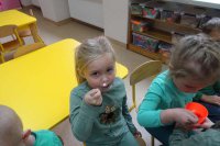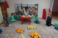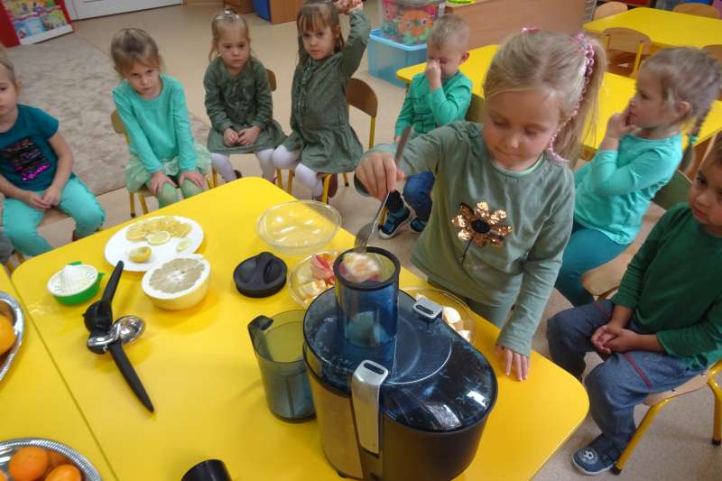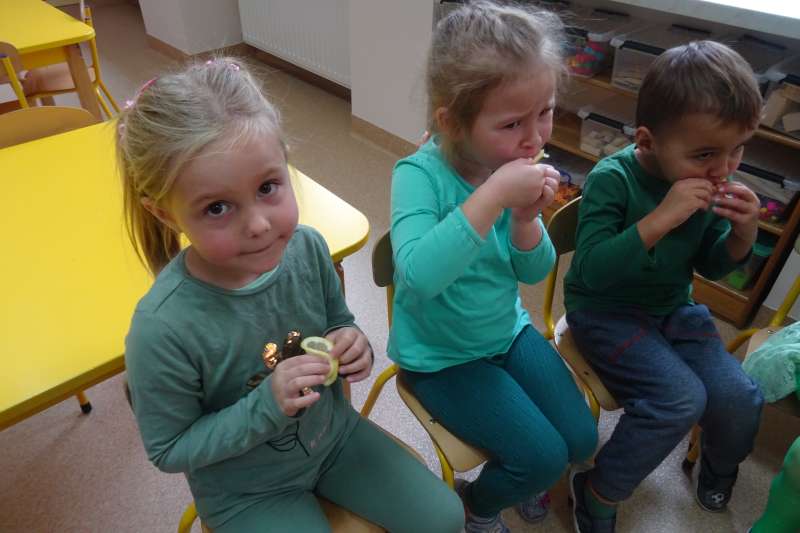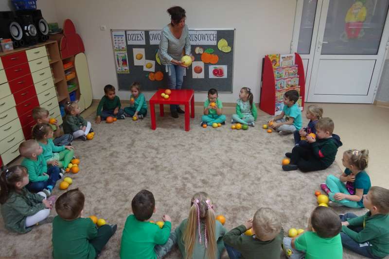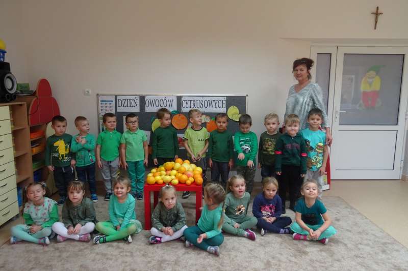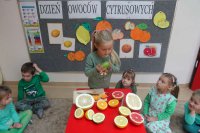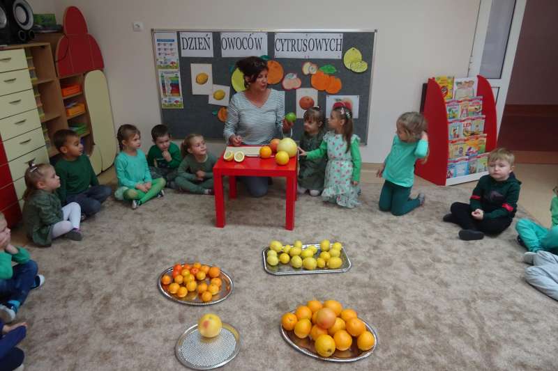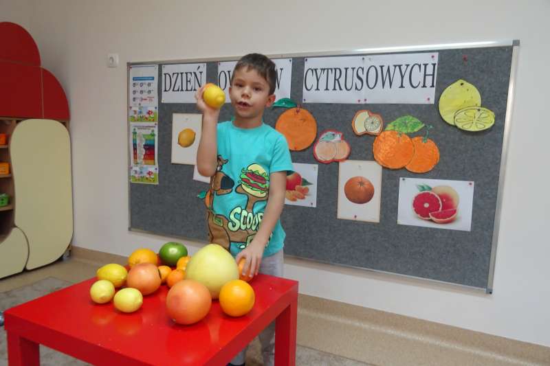 Dzisiaj poświęciliśmy dzień na poznanie owoców cytrusowych. Dzieci przyszły do przedszkola ubrane w kolorze zielonym i przyniosły owoce cytrusowe. Nazywaliśmy, oglądaliśmy, porównywaliśmy i wąchaliśmy różne owoce cytrusowe. Zrobiliśmy z nich pyszne soczki oraz degustowaliśmy np.cytrynkę. Dowiedzieliśmy się jakie zawierają witaminy. a na koniec wykonaliśmy pracę plastyczną zainspirowaną wybranymi owocami cytrusowymi.