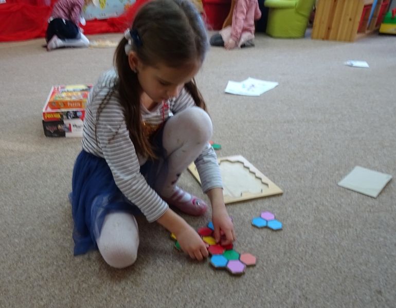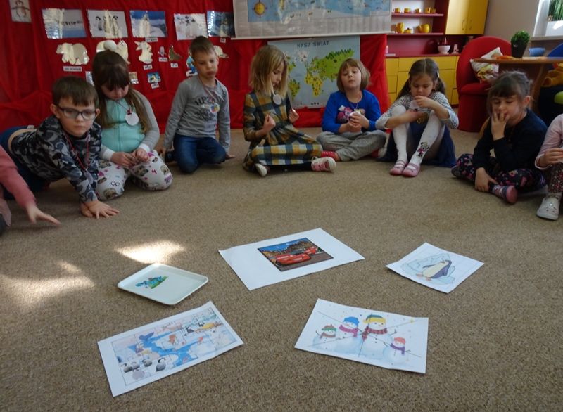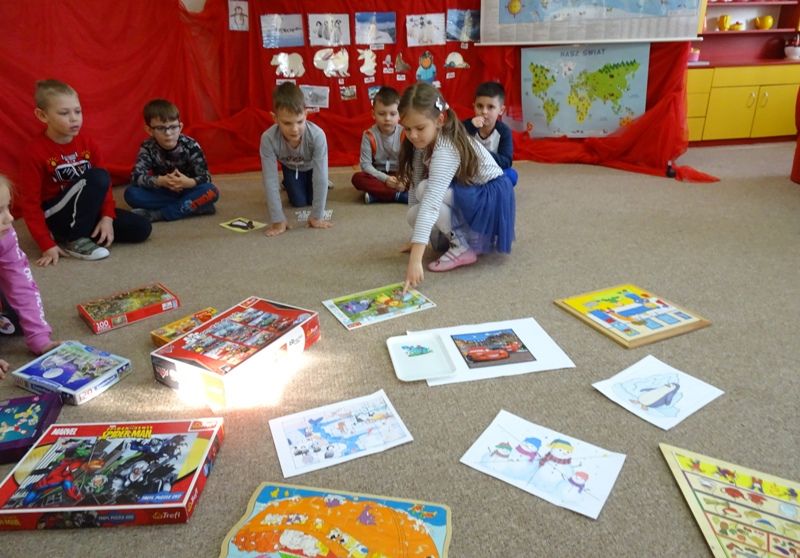 Międzynarodowy Dzień Puzzli obchodzimy 29 stycznia. Wspólne układanie puzzli to wspaniała zabawa, która posiada walory edukacyjne. Pierwsze puzzle powstały ponad 200 lat temu. Zabawę stworzył John Spilsbury, który zauważył problemy dzieci w nauce geografii. Układanie map pociętych wzdłuż granic to pierwsze zabawy z puzzlami. Czego uczy układnie puzzli? Choćby wytrwałości w dążeniu do celu i koncentracji na zadaniu, bo jeśli się chce zobaczyć, co wyjdzie po złożeniu wszystkich kawałków (a kto by nie chciał?), nie ma rady: trzeba się do tego przyłożyć. Układanie puzzli od małego sprawia, że dziecko rozwija tak zwaną zdolność analizy i syntezy wzrokowej, czyli rozkładania całości na poszczególne elementy i ponownego składania ich w całość. Ponadto stymuluje rozwój mózgu, ćwiczy spostrzegawczość, koncentrację i cierpliwość. Buduje wiarę we własne możliwości, trenuje pamięć i rozwija się manualnie. Daje dziecku poczucie, że coś tworzy, ponieważ z rozsypanych elementów, które osobno nic nie przedstawiają, powstaje nagle spójny obraz. Nasze przedszkolaki chętnie sięgają po różnego typu układanki, dlatego też idea tego dnia bardzo im się spodobała i wiele czasu w tym dniu przeznaczyły na układanie różnych obrazów, zarówno z gotowych oryginalnych elementów jak i z kawałków pociętych obrazków.