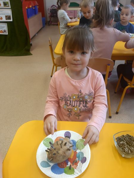 Dnia 9.11.2022 grupa "Kotki" obchodziły "Dzień Jeża". Dzieci dowiedziały się wiele ciekawostek nt.życia tego zwierzątka. Były bardzo zaskoczone tym - że jeże nie zjadają jabłuszek, które noszą na swoim grzbiecie. Zrobiły również wykorzystując materiały przyrodnicze " Katoflanego jeżyka". Na zakończenie były zdjęcia w "Jeżowej fotobudce"
