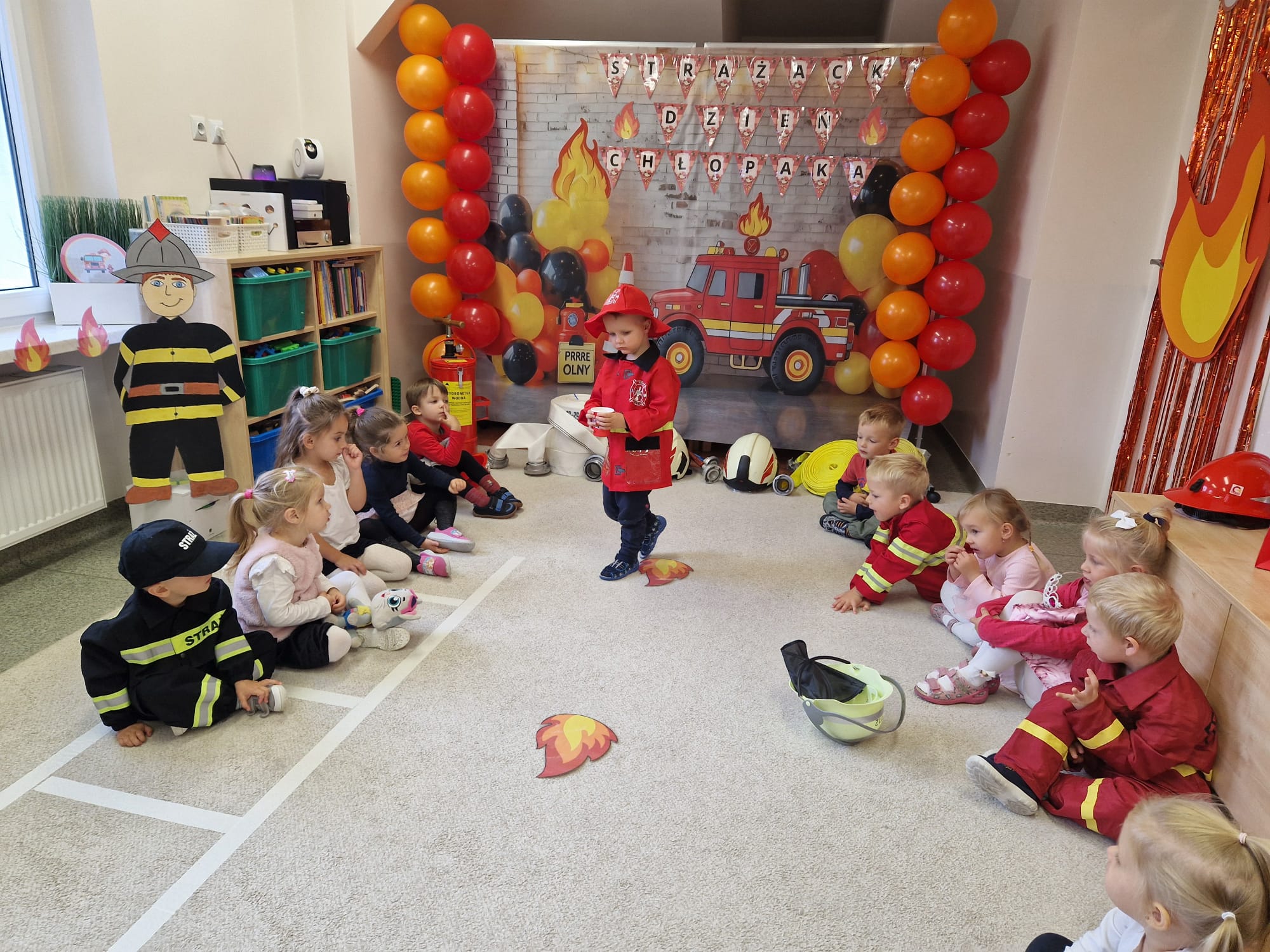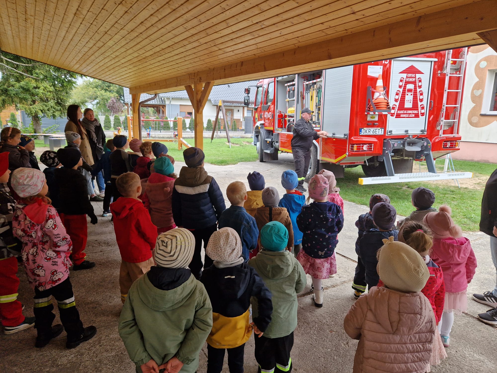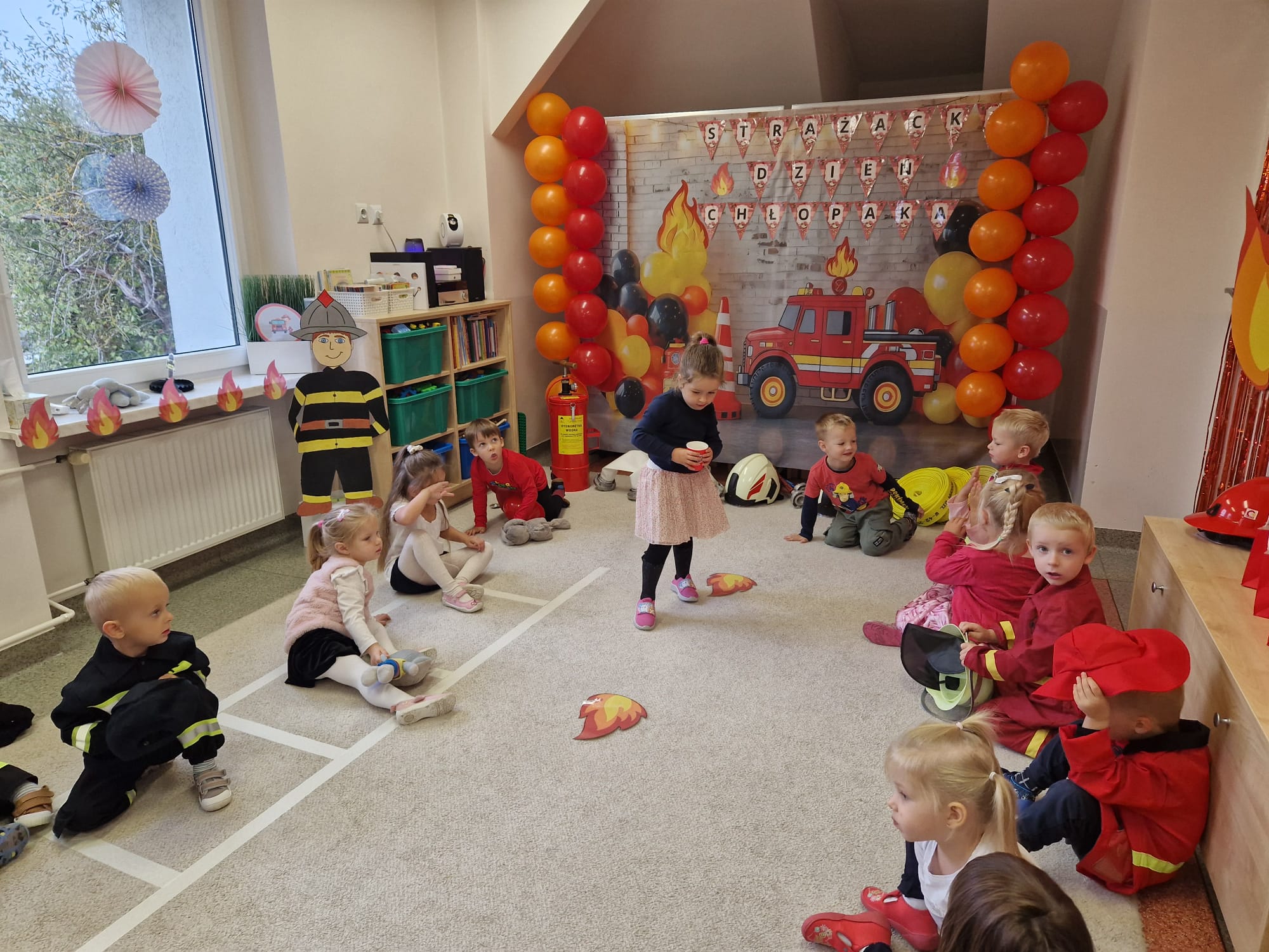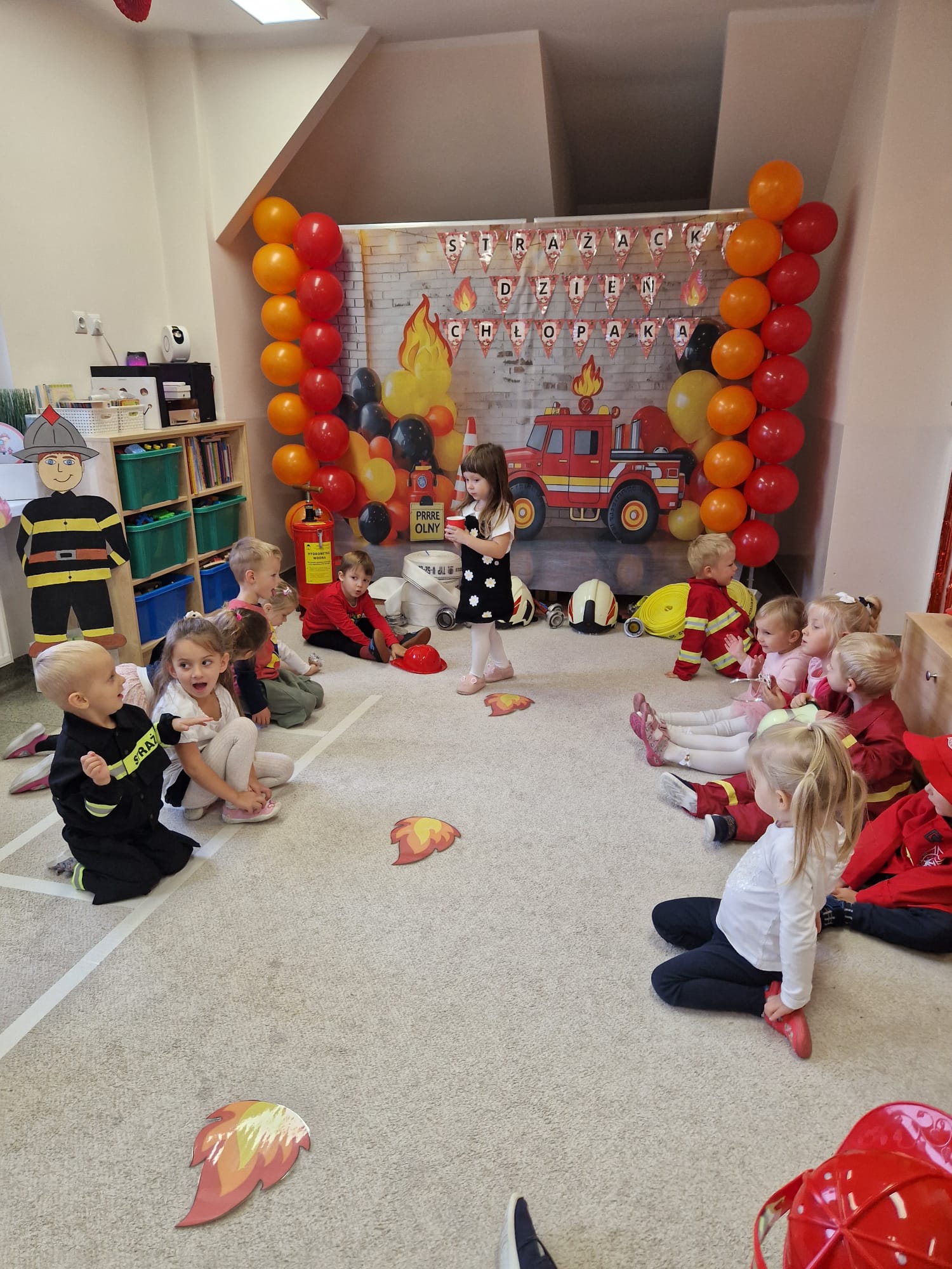 Największą niespodzianką dnia była wizyta strażaka, który przyjechał do przedszkola dużym wozem strażackim. Dzieci miały okazję zobaczyć z bliska sprzęt strażacki, posłuchać ciekawych opowieści i przekonać się, jak ważna i odpowiedzialna jest praca strażaka. Spotkanie wzbudziło ogromne zainteresowanie i zachwyt u wszystkich.
