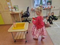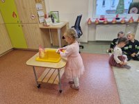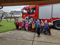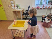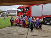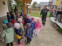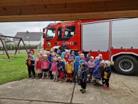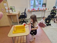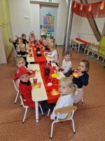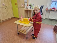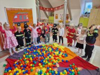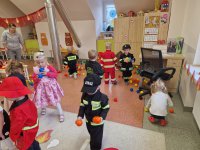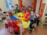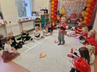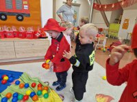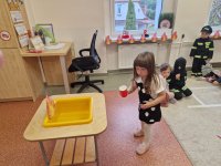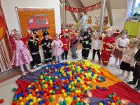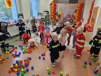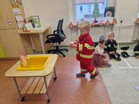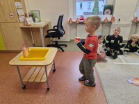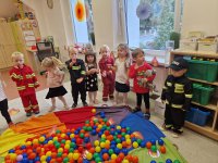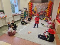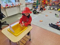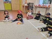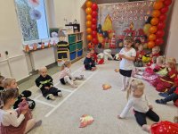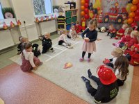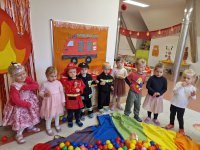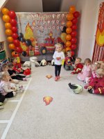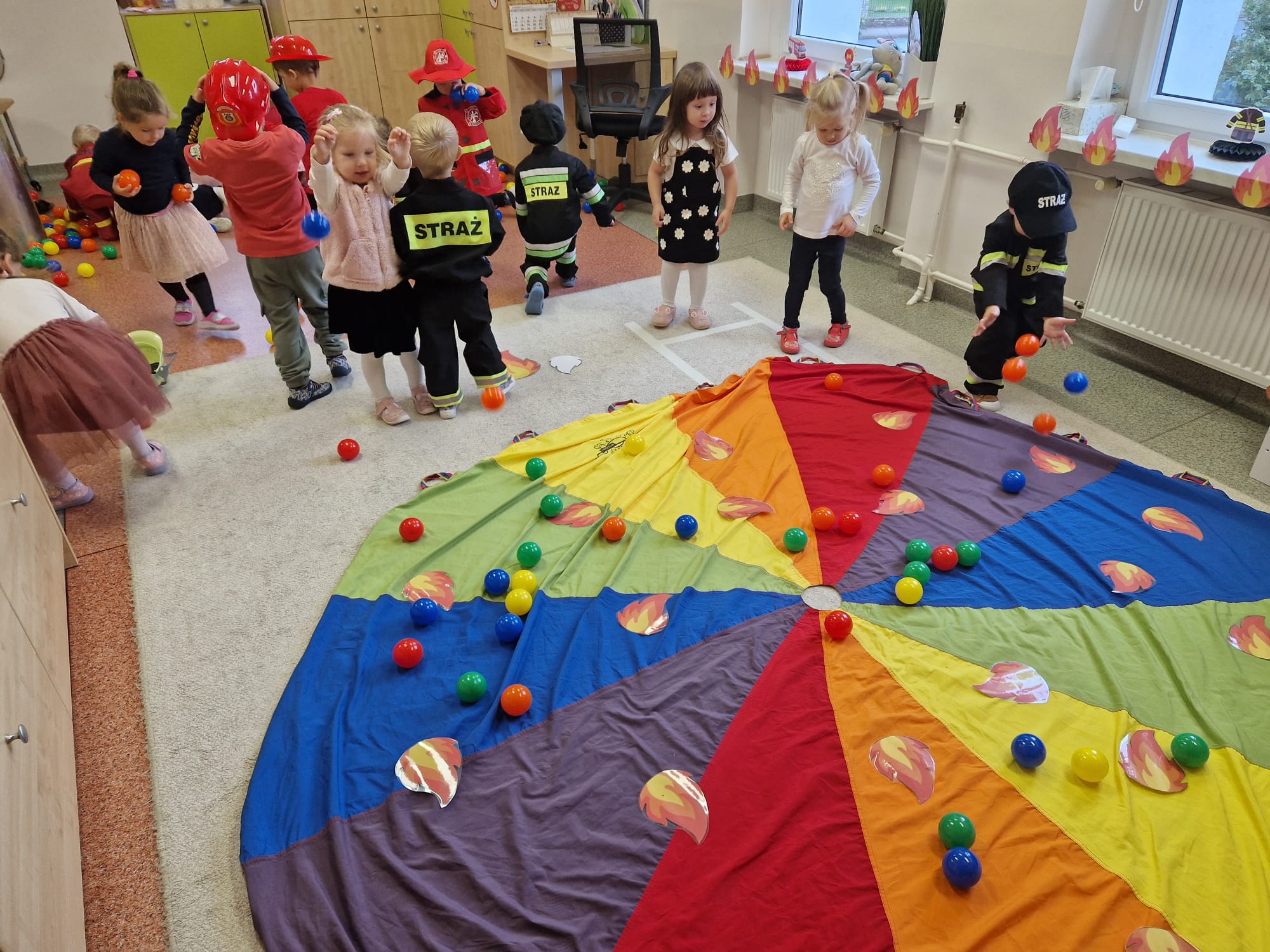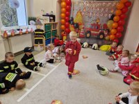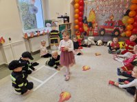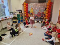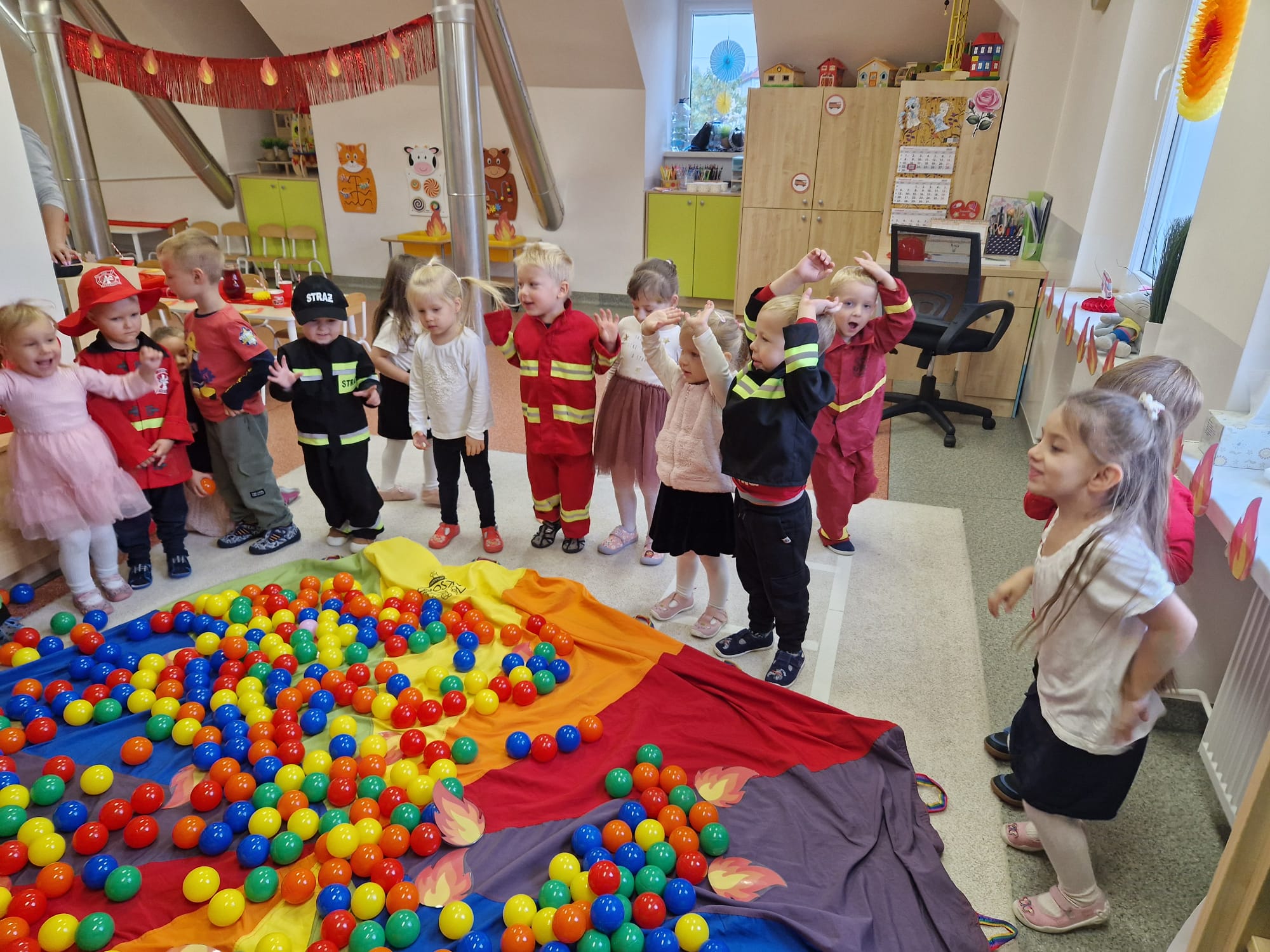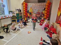Największą niespodzianką dnia była wizyta strażaka, który przyjechał do przedszkola dużym wozem strażackim. Dzieci miały okazję zobaczyć z bliska sprzęt strażacki, posłuchać ciekawych opowieści i przekonać się, jak ważna i odpowiedzialna jest praca strażaka. Spotkanie wzbudziło ogromne zainteresowanie i zachwyt u wszystkich.