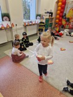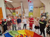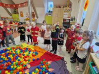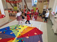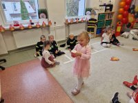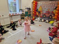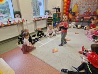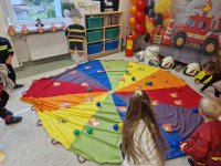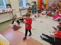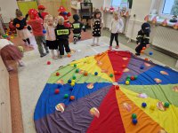Na dzieci czekało wiele atrakcji: zabawy z kolorową chustą animacyjną, balonami i piłeczkami, a także wspólne tańce, które wprowadziły wszystkich w doskonały nastrój. Nie zabrakło również pysznego poczęstunku, którym dzieci mogły się częstować podczas przerw w zabawie.