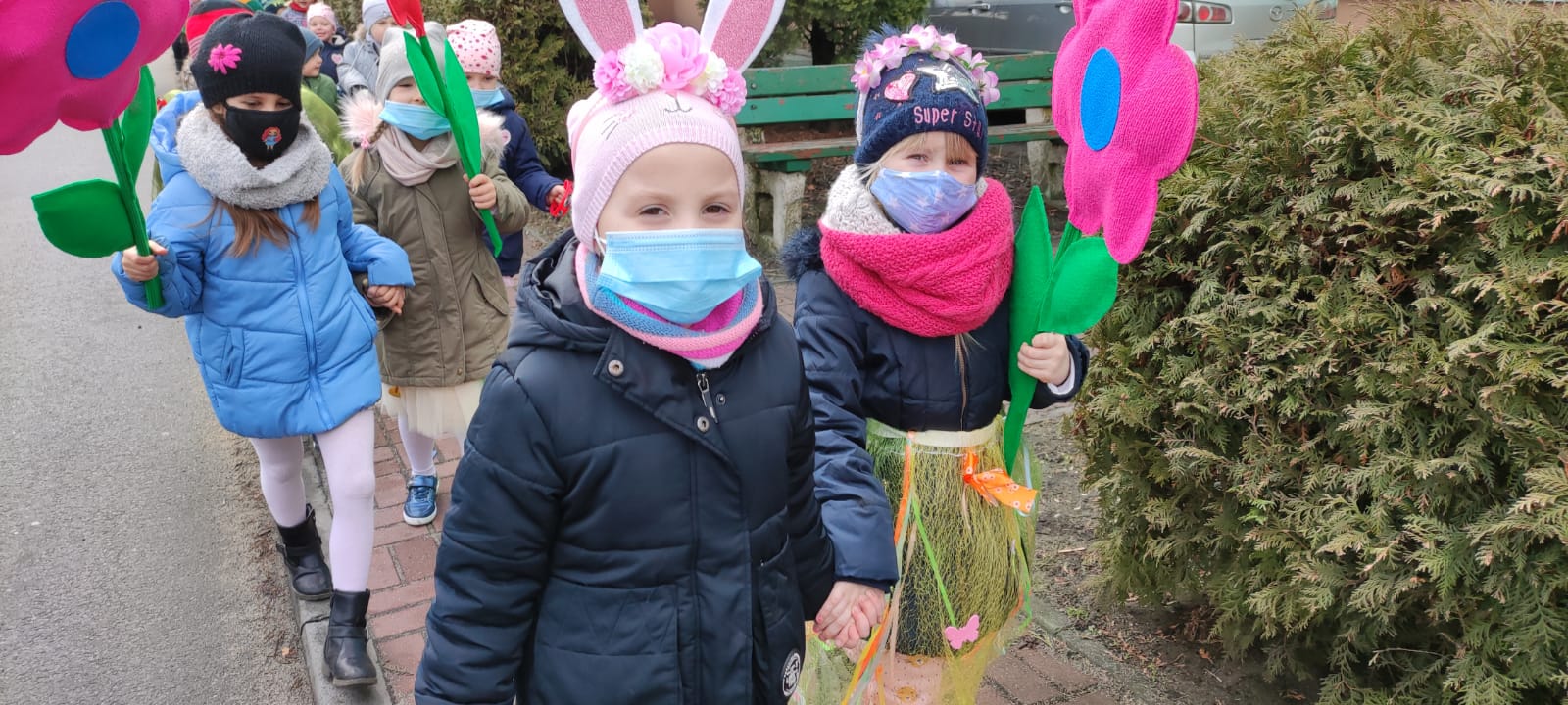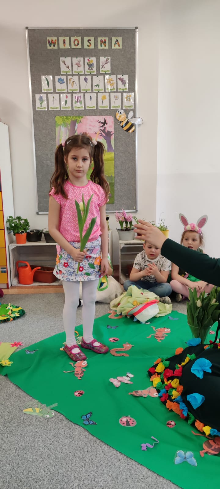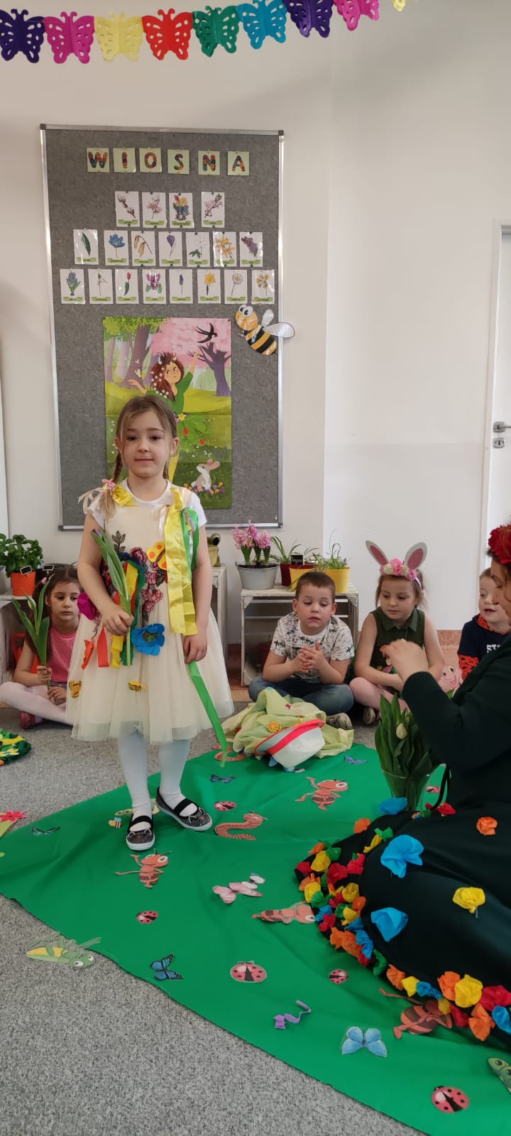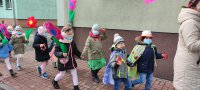Pierwszy dzień wiosny rozpoczął się w naszej stali od wspólnego ozdaniania tradycyjnego gaika.Dzieci w skupieniu przyozdobiły wszystkie gałązki, aby kolorowy gaik pięknie prezentował się w trakcie wiosennego przemarszu. Tuż po śniadaniu rozpoczął się POKAZ MODY WIOSENNEJ NA ZIELONEJ ŁĄCZCE. Dziewczynki w rytm wiosennej piosenki prezentowały swoje kwieciste spódniczki i sukienkie, z kolei chłopcy przedstawili swoje wiosenne peleryny. Nie zabrakło też wiosennych łamigłowek i zadań, a w nagrodę za poprawne odpowiedzi pani wiosna wręczyła dzieciom pachnące tulipany! W trakcie naszego przemarszu, dzieci zachęcały wiosnę do rychłego przyjścia za pomocą głośnych okrzyków, dźwięków instrumentów i kolorowych kwiatów. Zimo precz! My chcemy wiosnę!