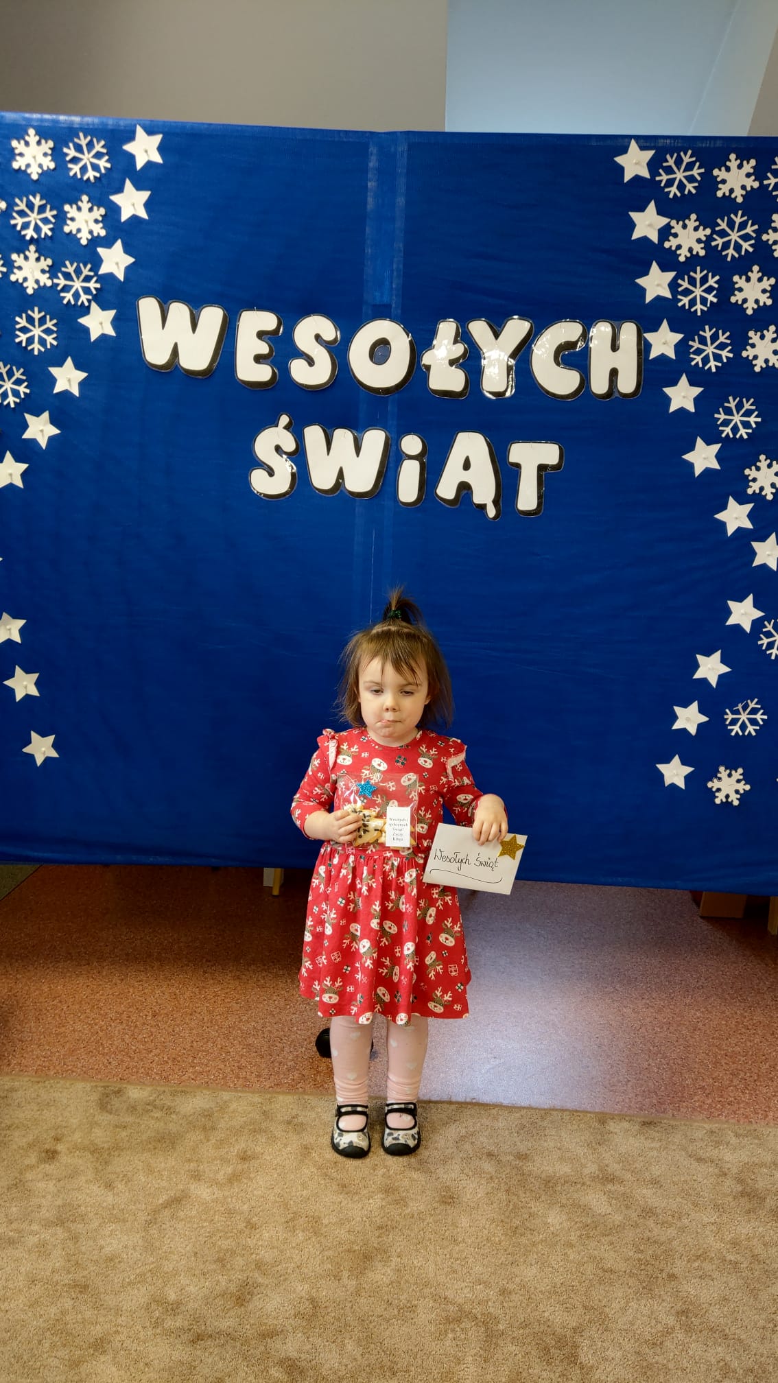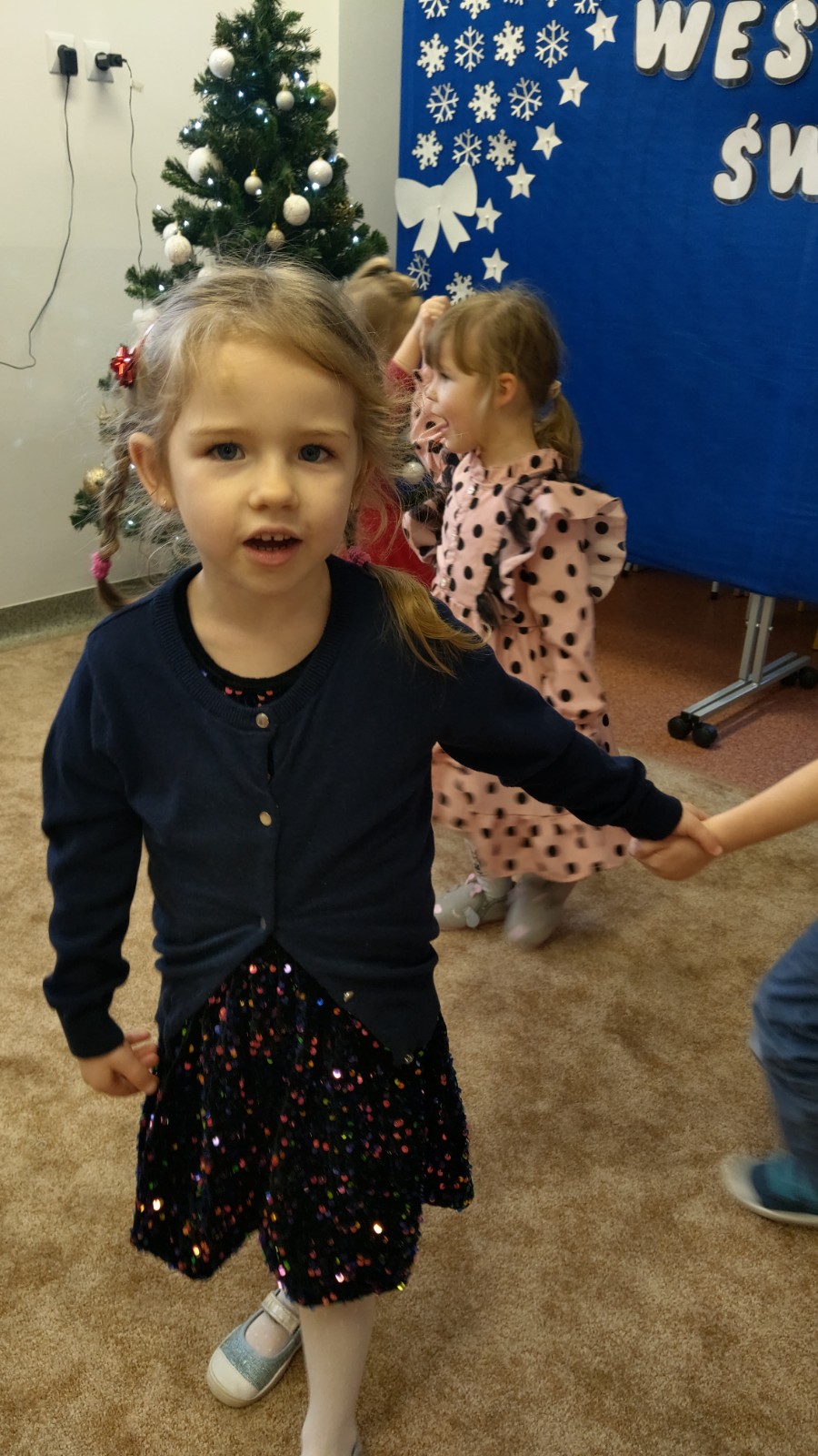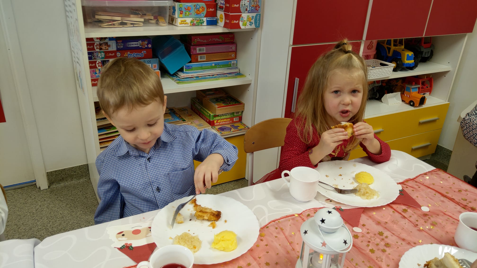 Czas oczekiwania na Święta Bożego Narodzenia w naszym przedszkolu zakończyliśmy wspólną wigilią. Odbyła się ona 22.12.21. Dzieci tego dnia przyszły odświętnie ubrane. Wspólnie kolędowaliśmy, dzieliliśmy się opłatkiem, wspólnie zjedliśmy wigilijny obiad. Oczywiście nie zabrakło prezentów pod lśniącą choinką, które dzieci rozpakowały z wielką radością. Bardzo miło spędziliśmy wspólne czas w świątecznej atmosferze.
