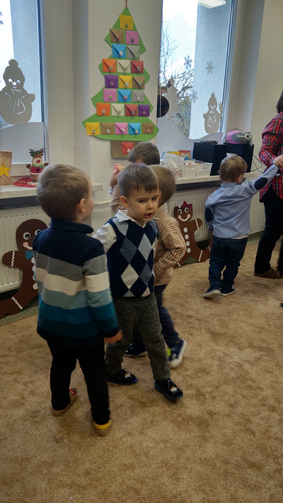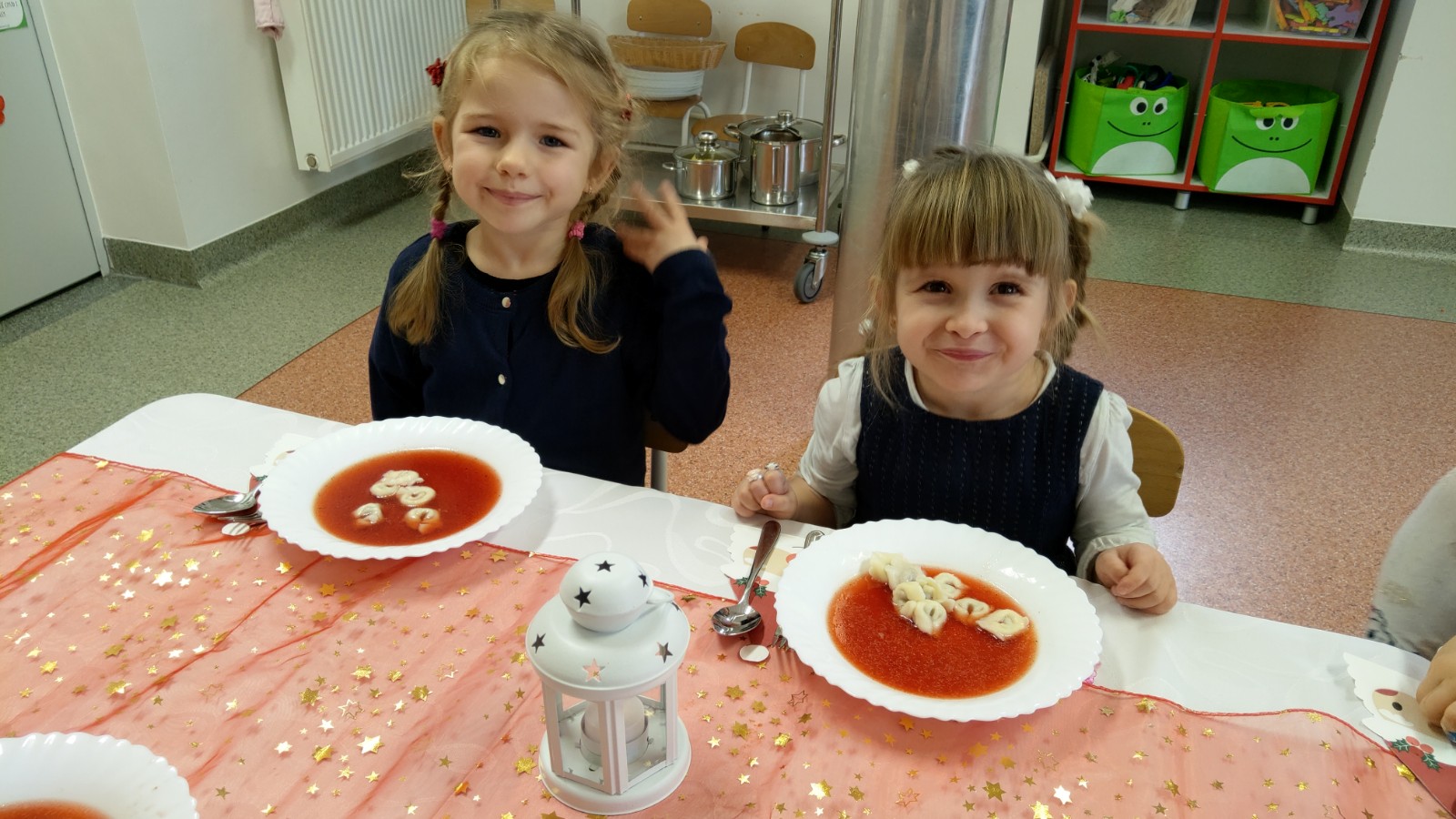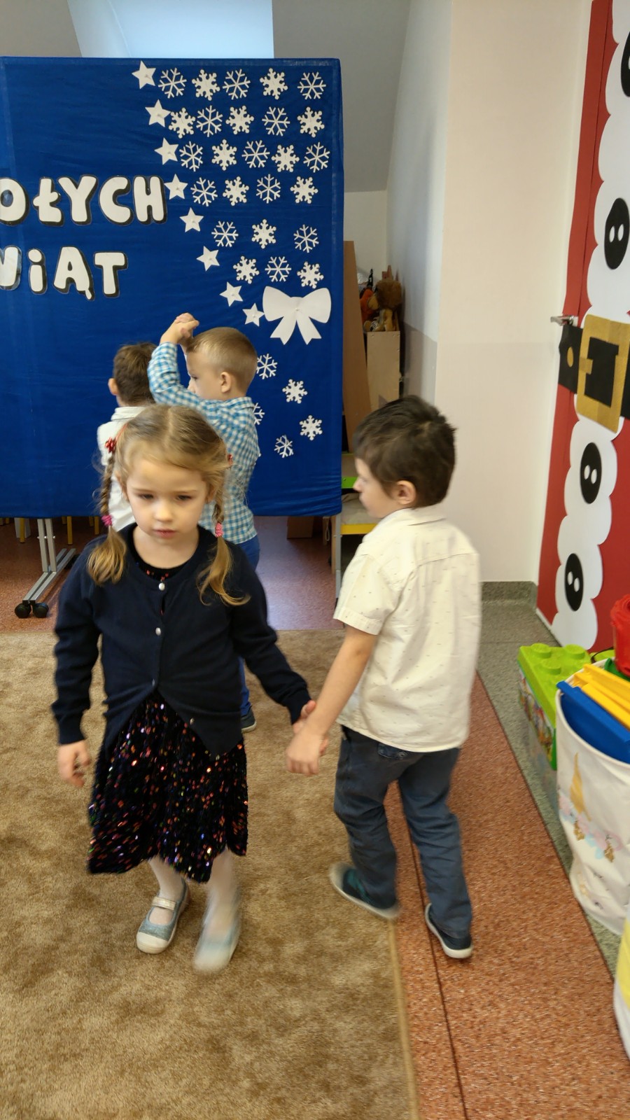 Czas oczekiwania na Święta Bożego Narodzenia w naszym przedszkolu zakończyliśmy wspólną wigilią. Odbyła się ona 22.12.21. Dzieci tego dnia przyszły odświętnie ubrane. Wspólnie kolędowaliśmy, dzieliliśmy się opłatkiem, wspólnie zjedliśmy wigilijny obiad. Oczywiście nie zabrakło prezentów pod lśniącą choinką, które dzieci rozpakowały z wielką radością. Bardzo miło spędziliśmy wspólne czas w świątecznej atmosferze.