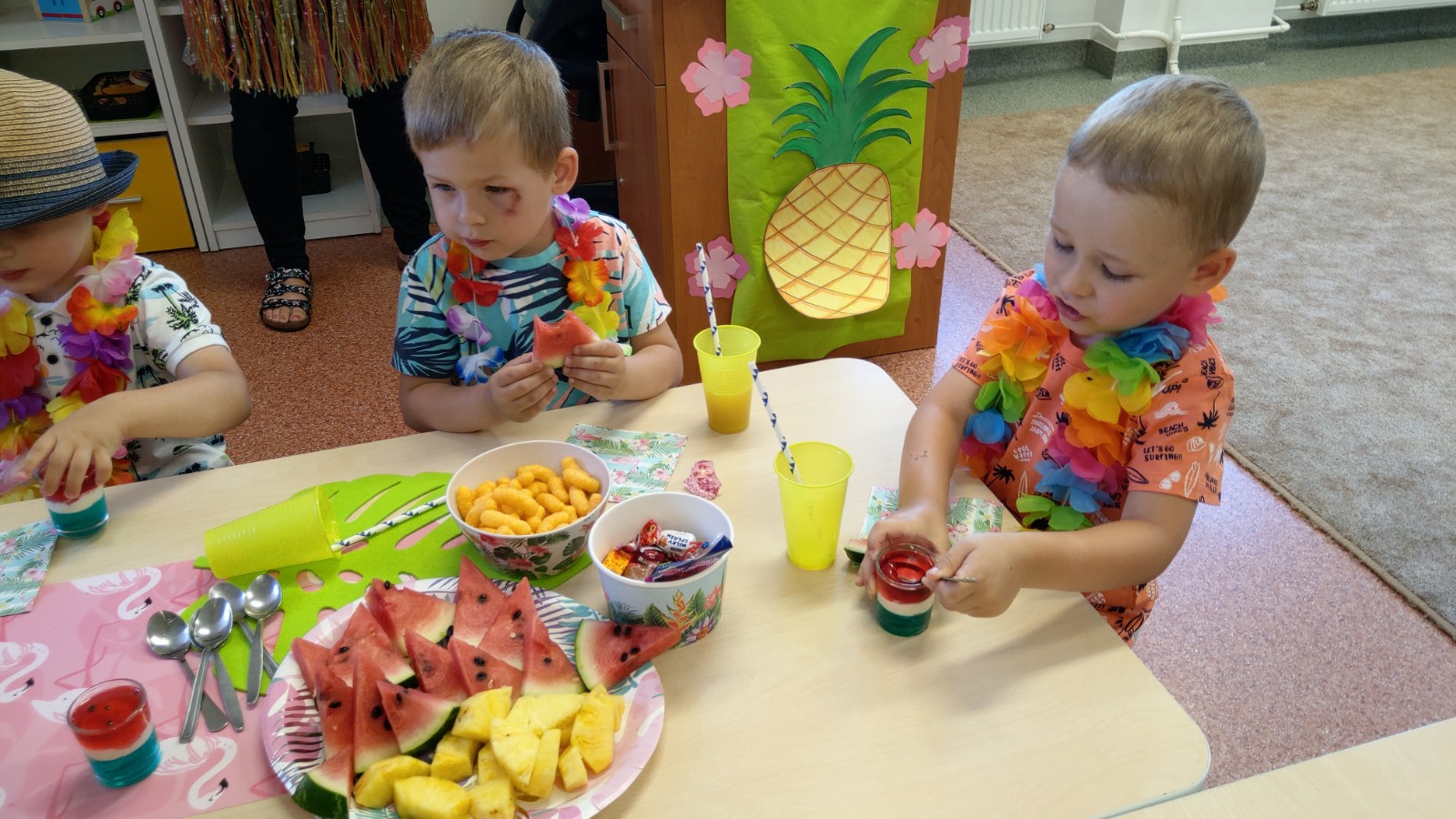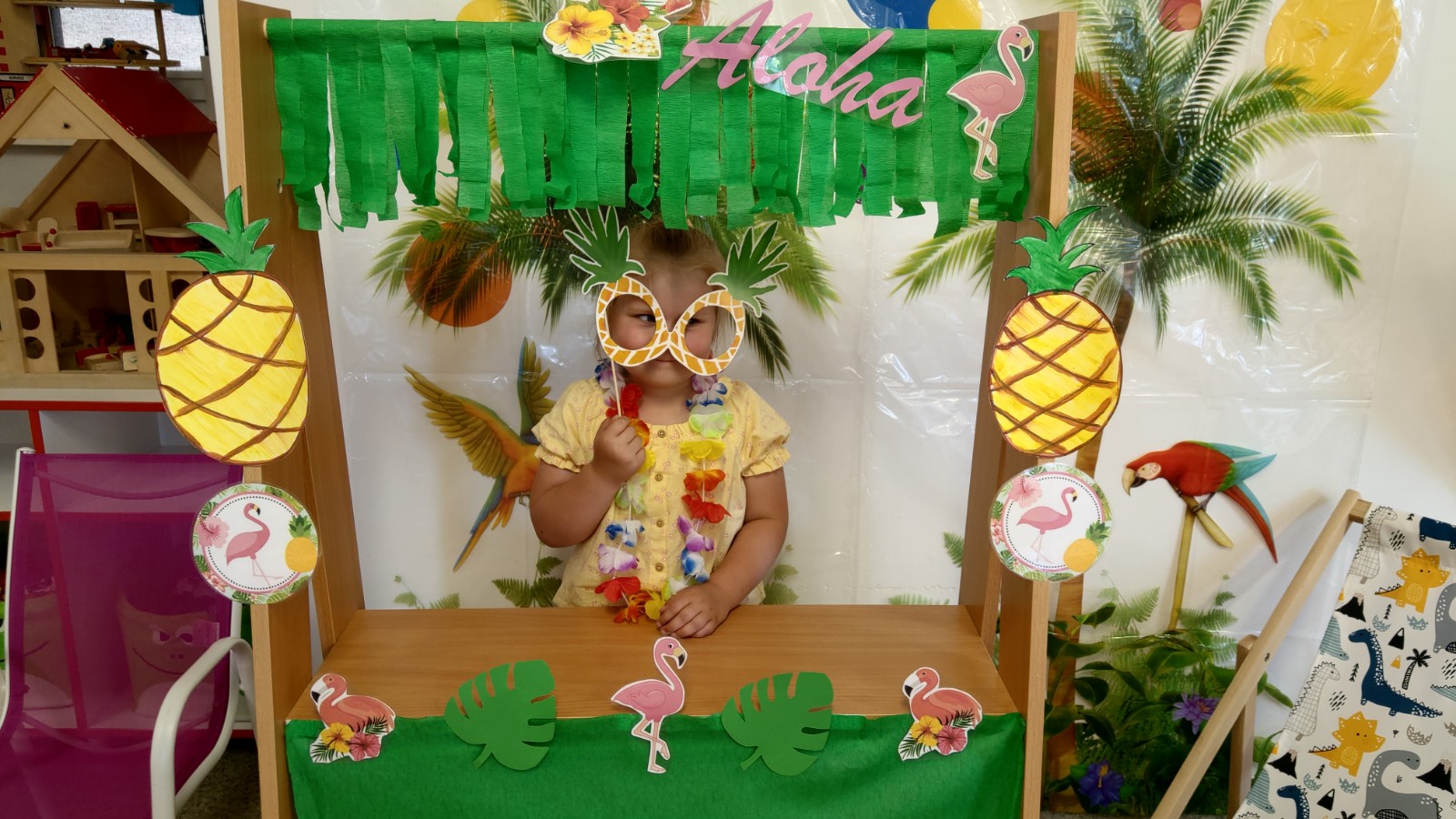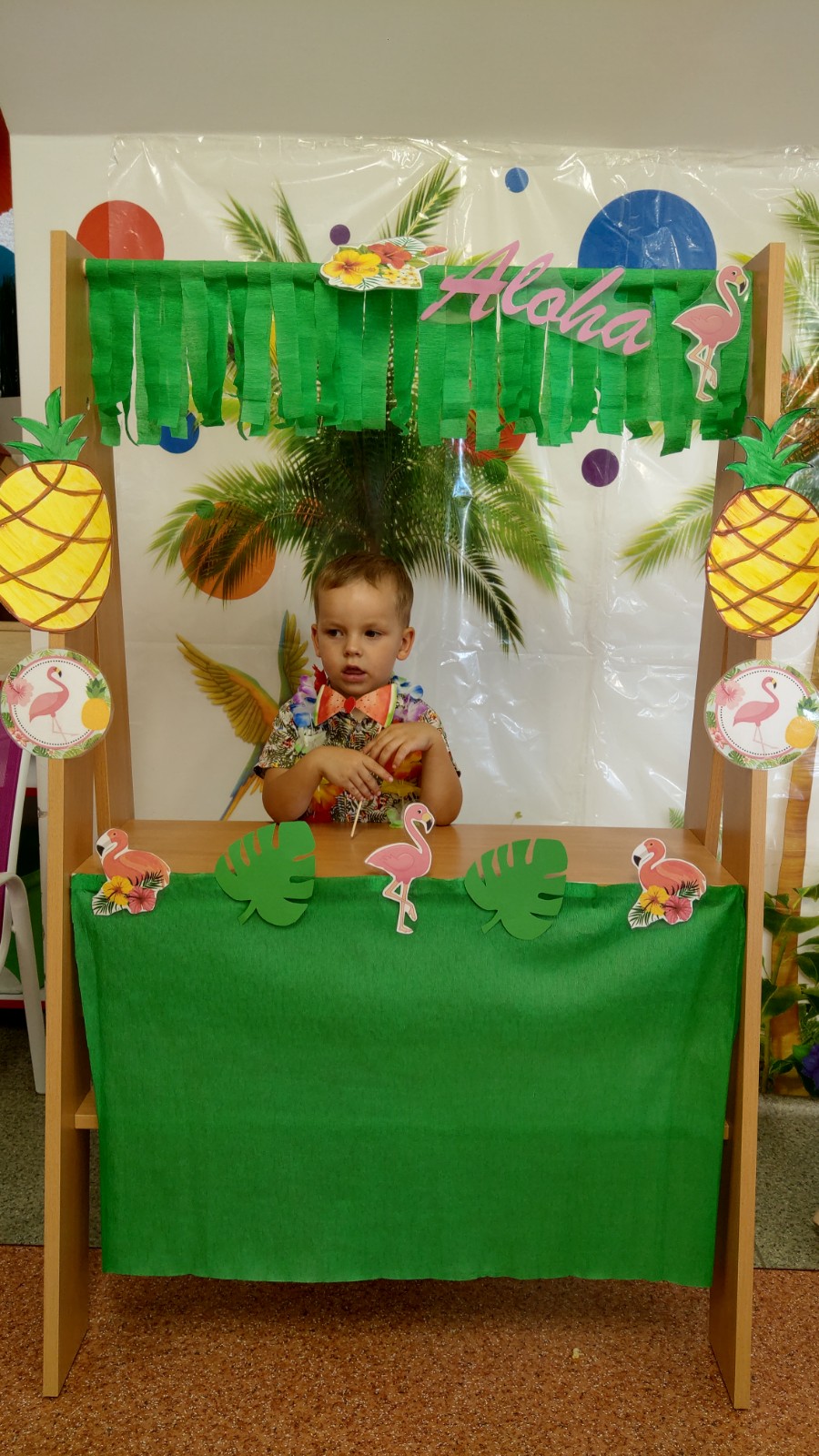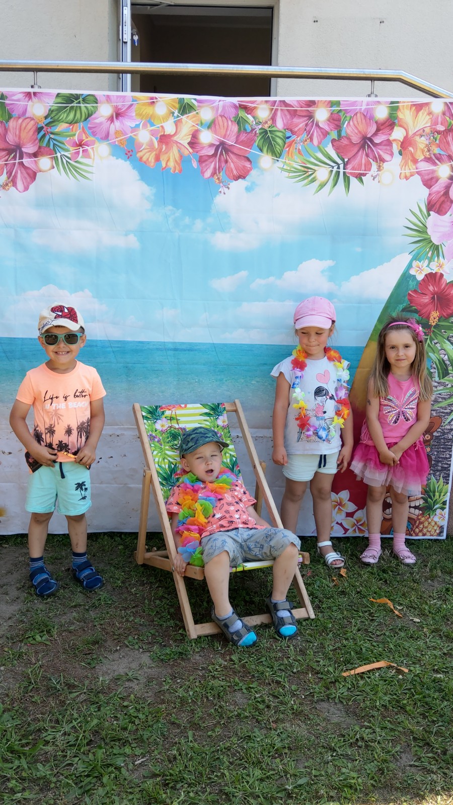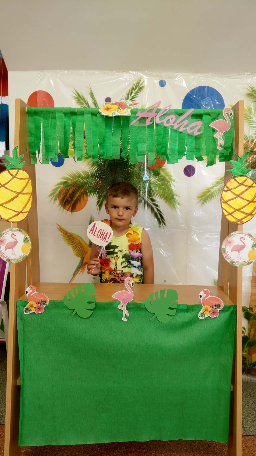 Z okazji rozpoczynających się wakacji i lata w naszej grupie został zorganizowany Dzień Hawajski. W naszej sali pojawiła się plaża, palmy, flamingi, egzotyczne owoce i oczywiście świetna zabawa. Tego dnia dzieci pojawiły się w przedszkolu w pięknych hawajskich strojach. Podczas Dnia Hawajskiego zostały zorganizowane różne zabawy, tańczyliśmy do hawajskich piosenek, robiliśmy sobie zdjęcia w hawajskiej fotobudce jak i na tle naszej przedszkolnej plaży. Były także tańce oraz pyszny poczęstunek. To był naprawdę piękny dzień. Wszystkie dzieci były bardzo szczęśliwe.